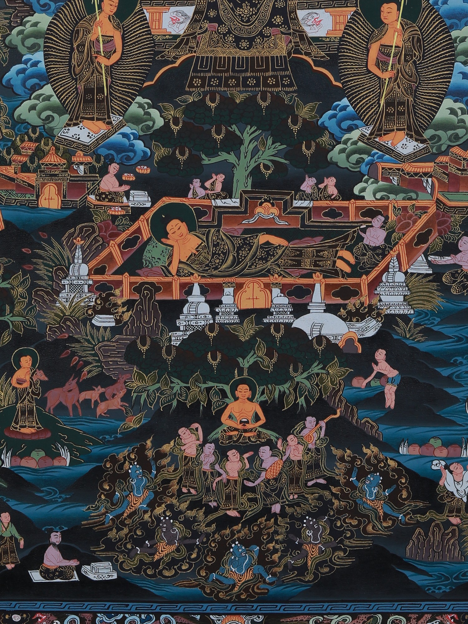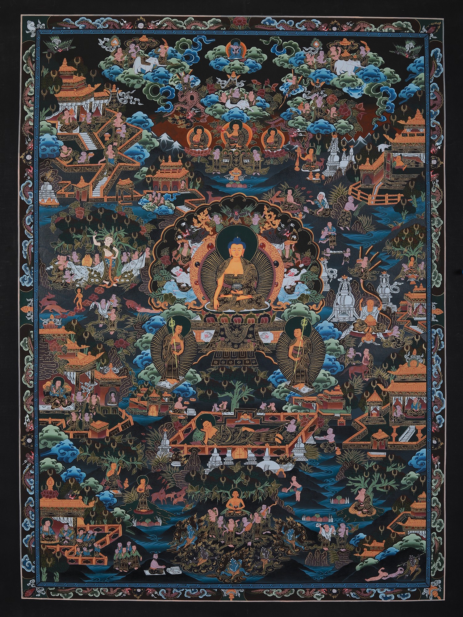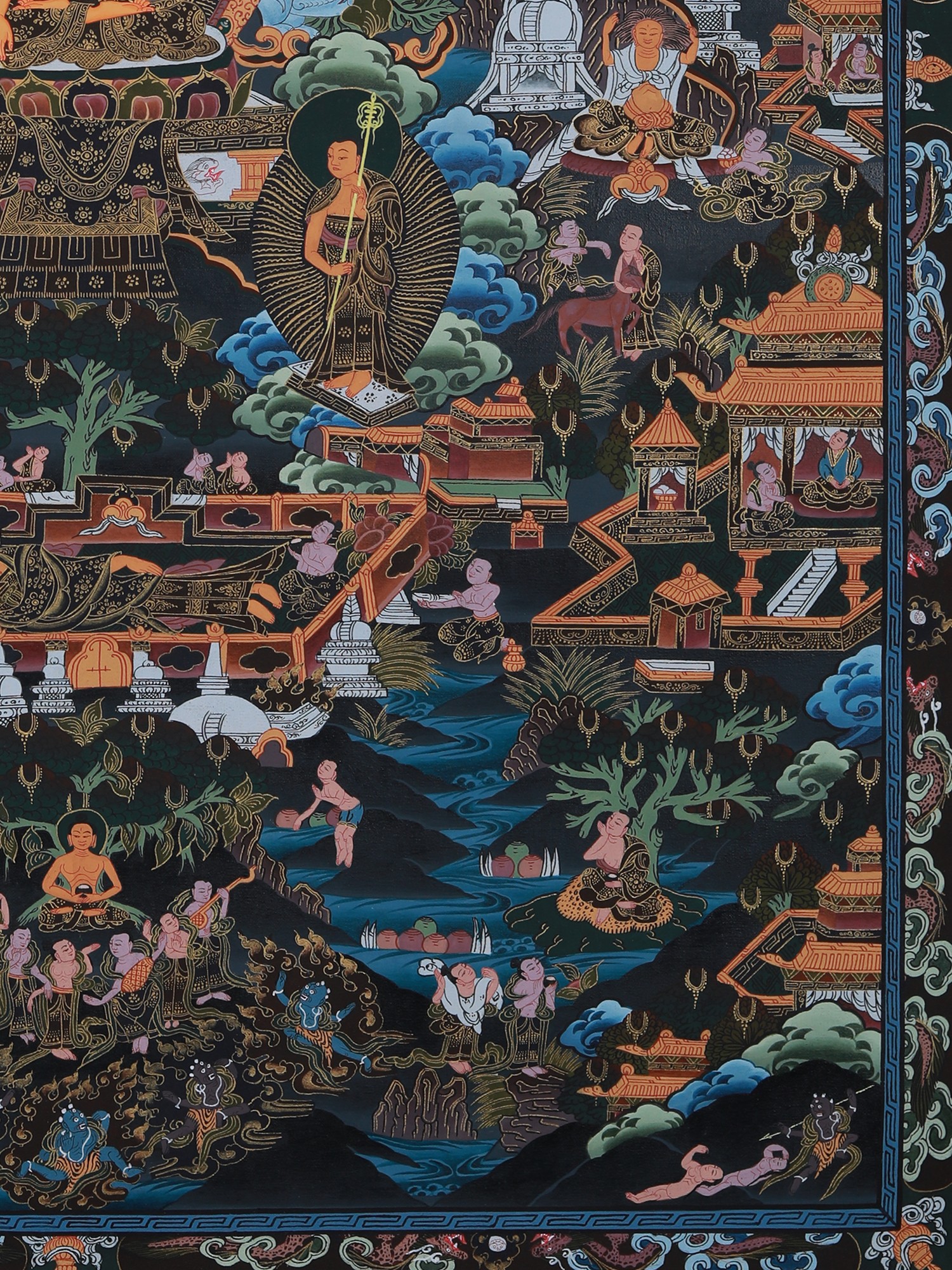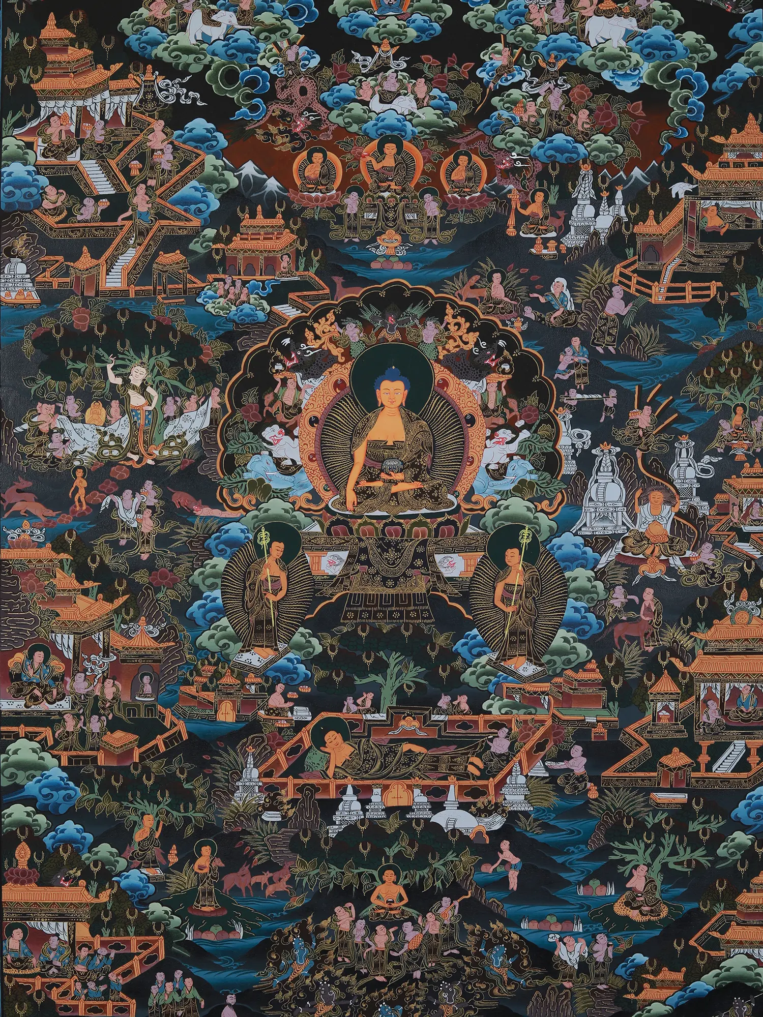 This Thangka painting is a testament to the enduring power of Buddhist art to inspire and uplift. Its impressive scale and detailed execution make it a captivating centerpiece for any spiritual space or art collection. The careful composition guides the eye through a complex yet harmonious visual symphony, inviting prolonged study and reflection. It is an artwork that rewards the viewer with new discoveries upon each viewing, deepening their understanding and appreciation of the Buddha's profound legacy. Owning such a piece is an opportunity to bring a tangible connection to a timeless tradition and a source of spiritual inspiration into your home.