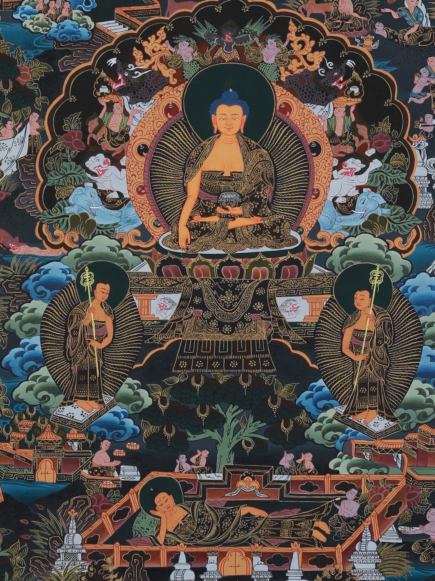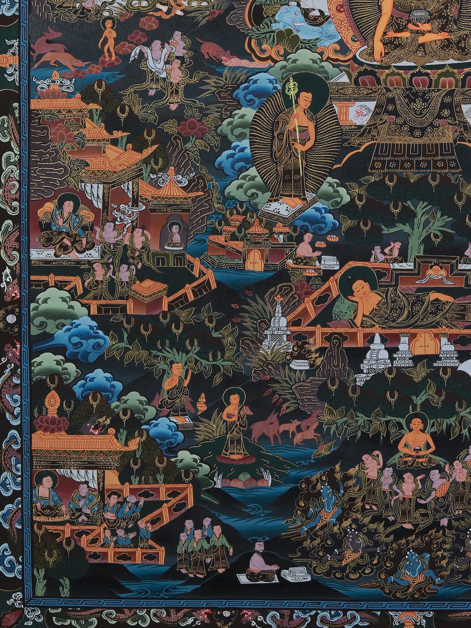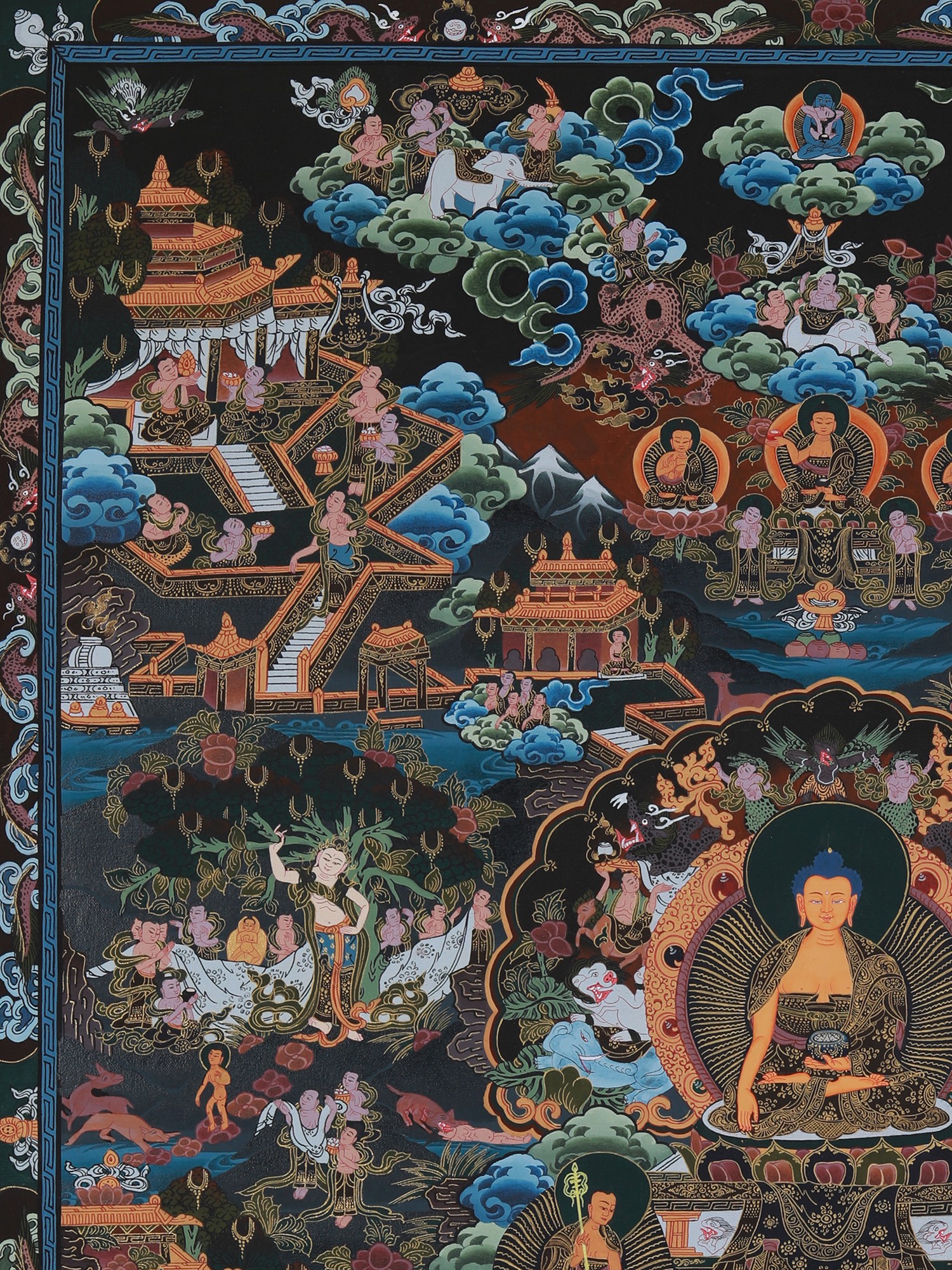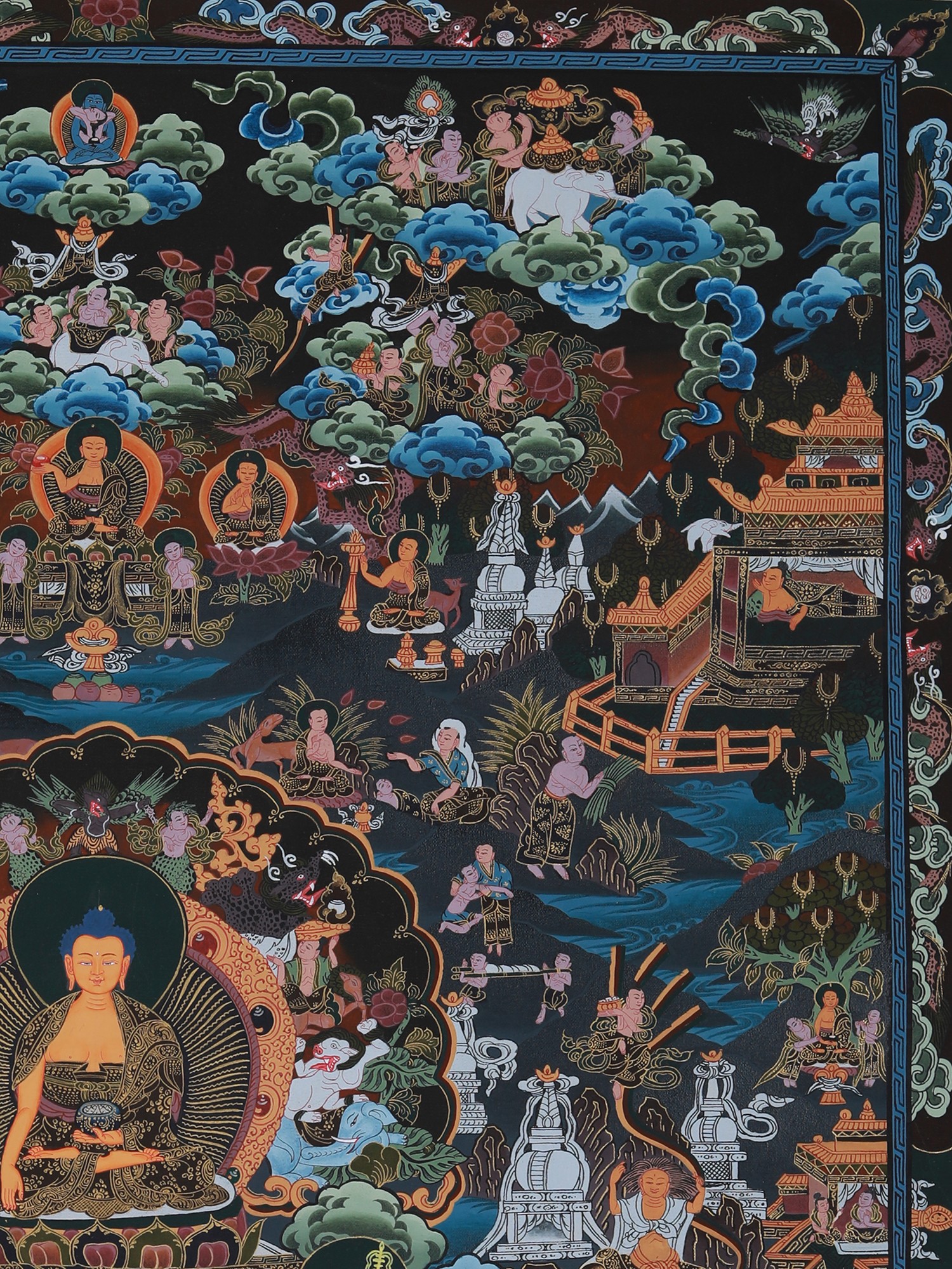 This Thangka painting is a testament to the enduring power of Buddhist art to inspire and uplift. Its impressive scale and detailed execution make it a captivating centerpiece for any spiritual space or art collection. The careful composition guides the eye through a complex yet harmonious visual symphony, inviting prolonged study and reflection. It is an artwork that rewards the viewer with new discoveries upon each viewing, deepening their understanding and appreciation of the Buddha's profound legacy. Owning such a piece is an opportunity to bring a tangible connection to a timeless tradition and a source of spiritual inspiration into your home.