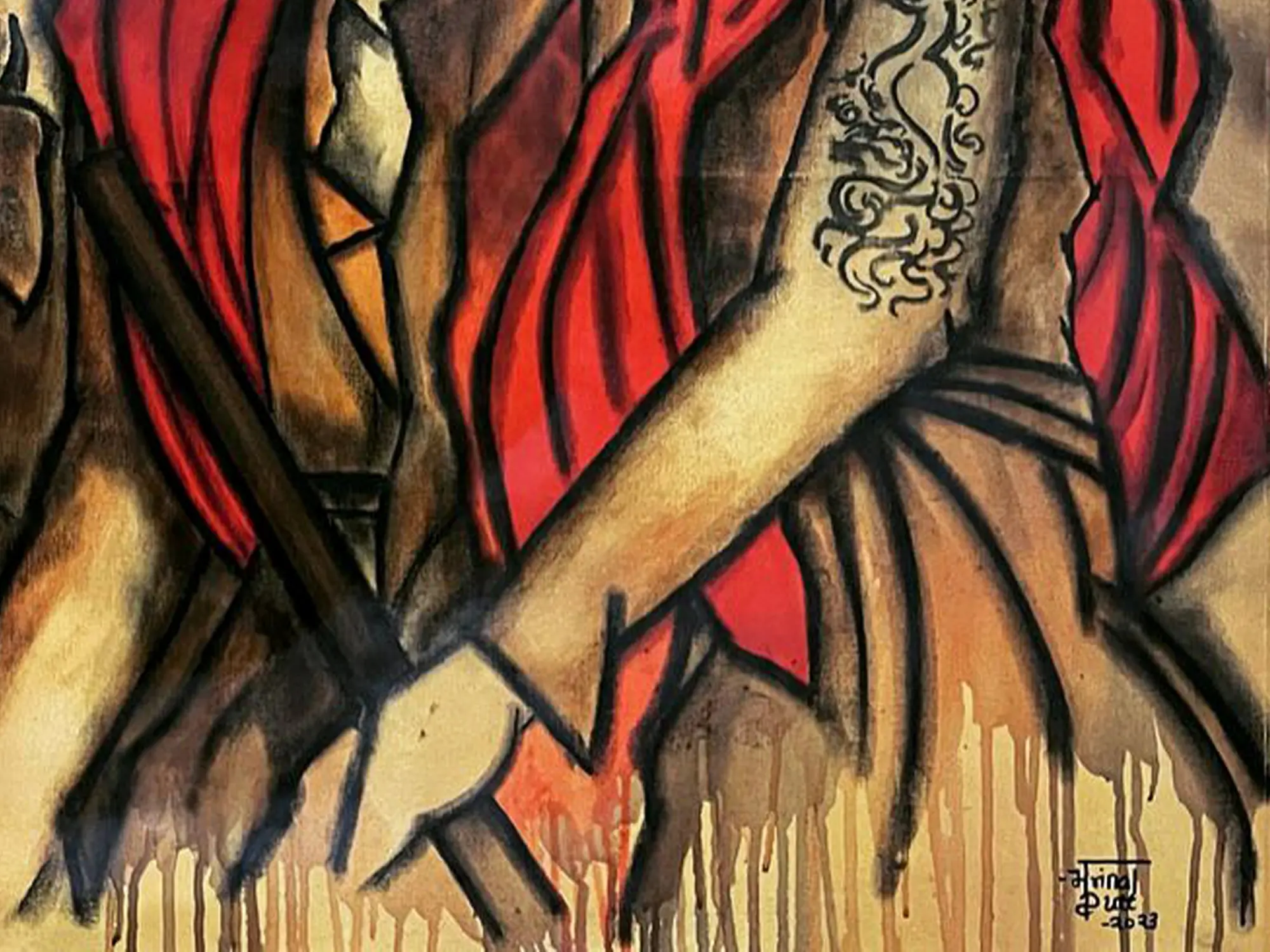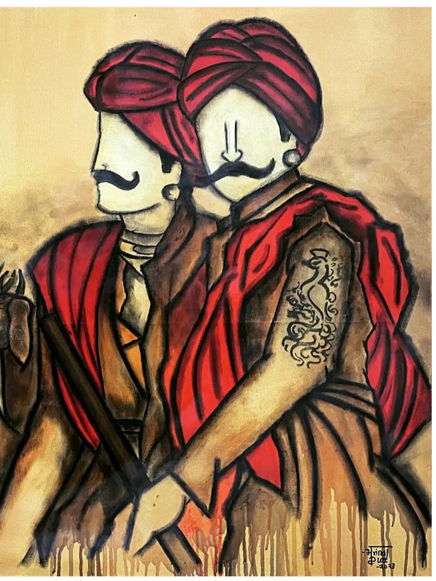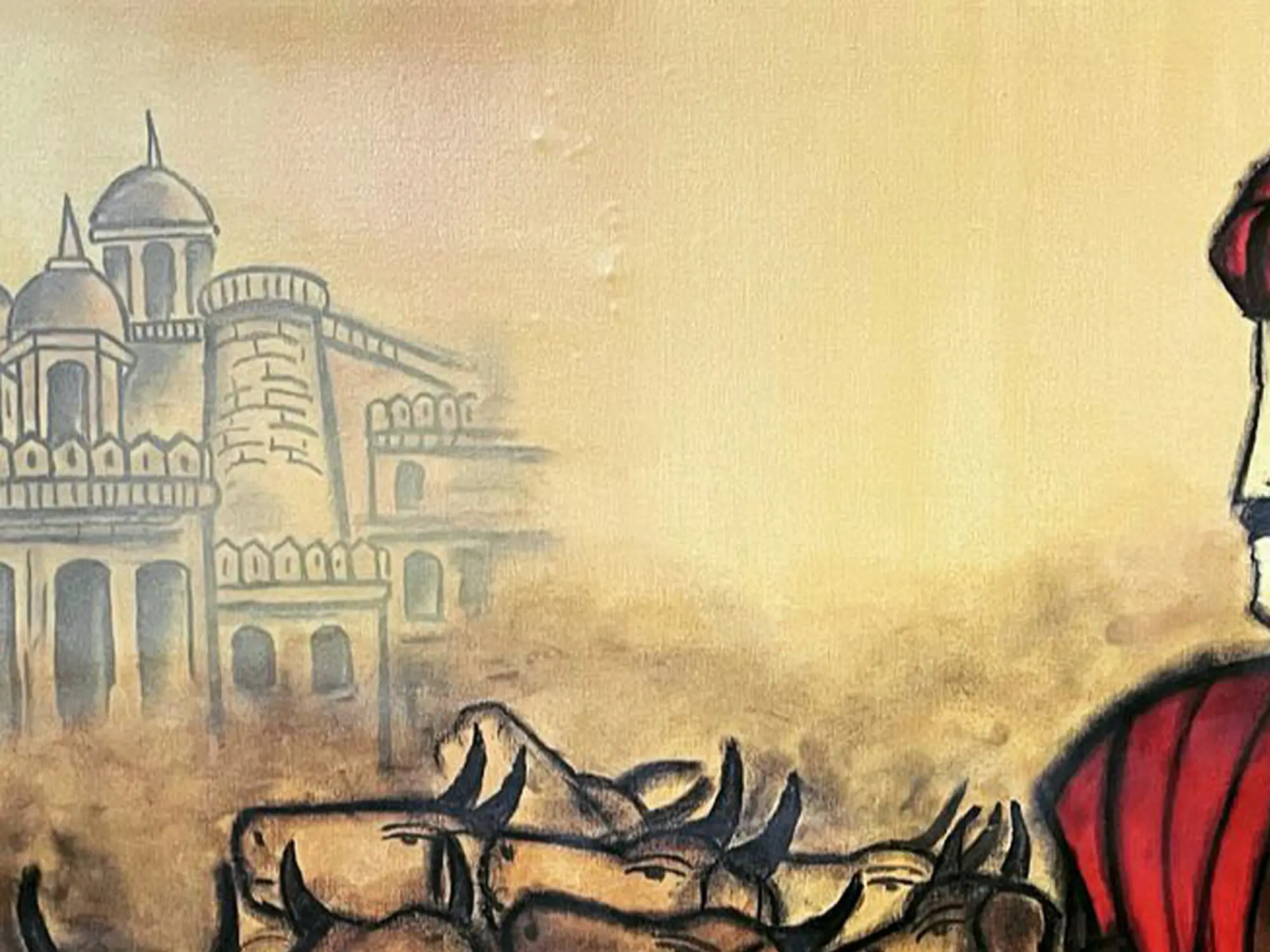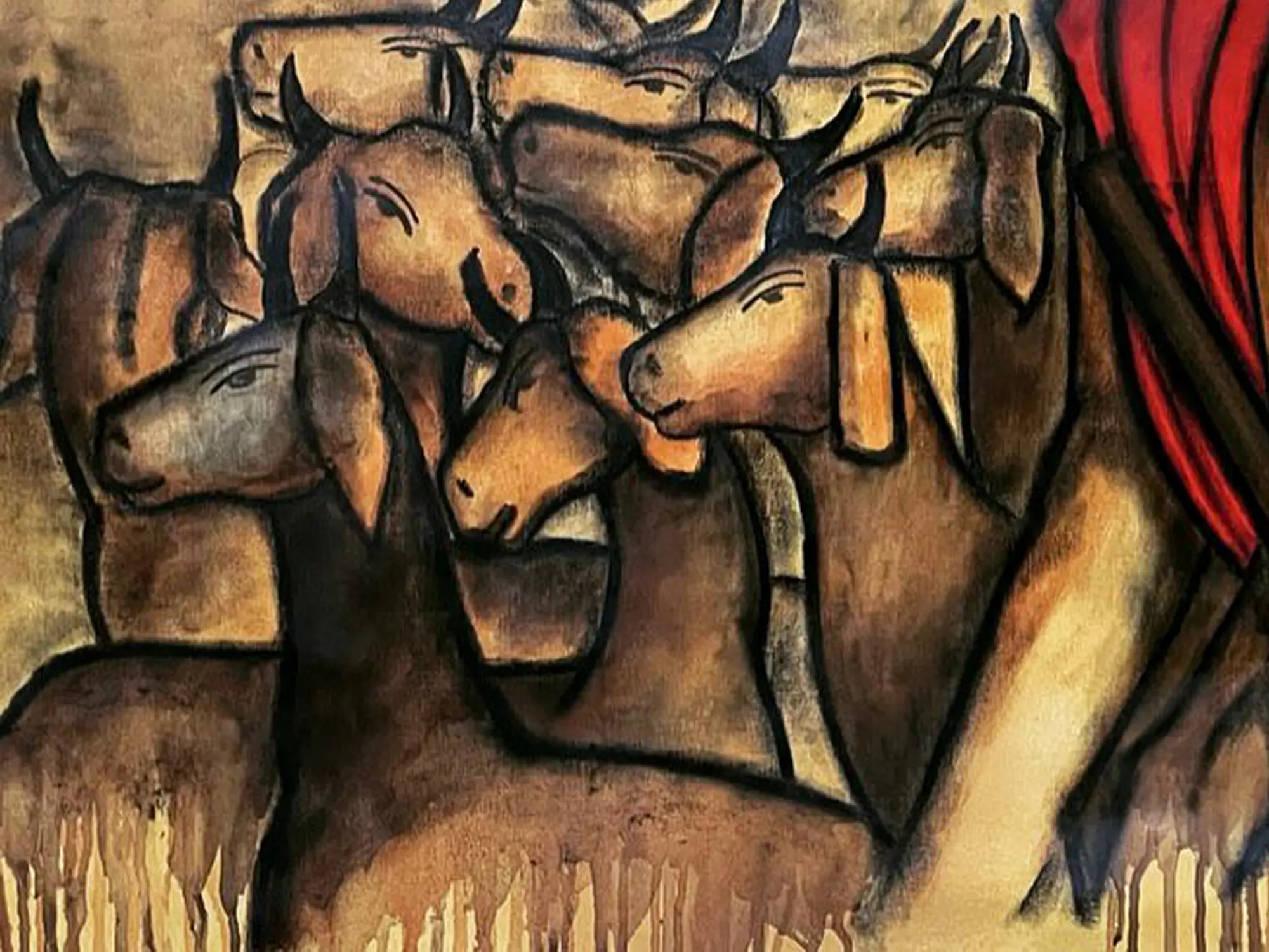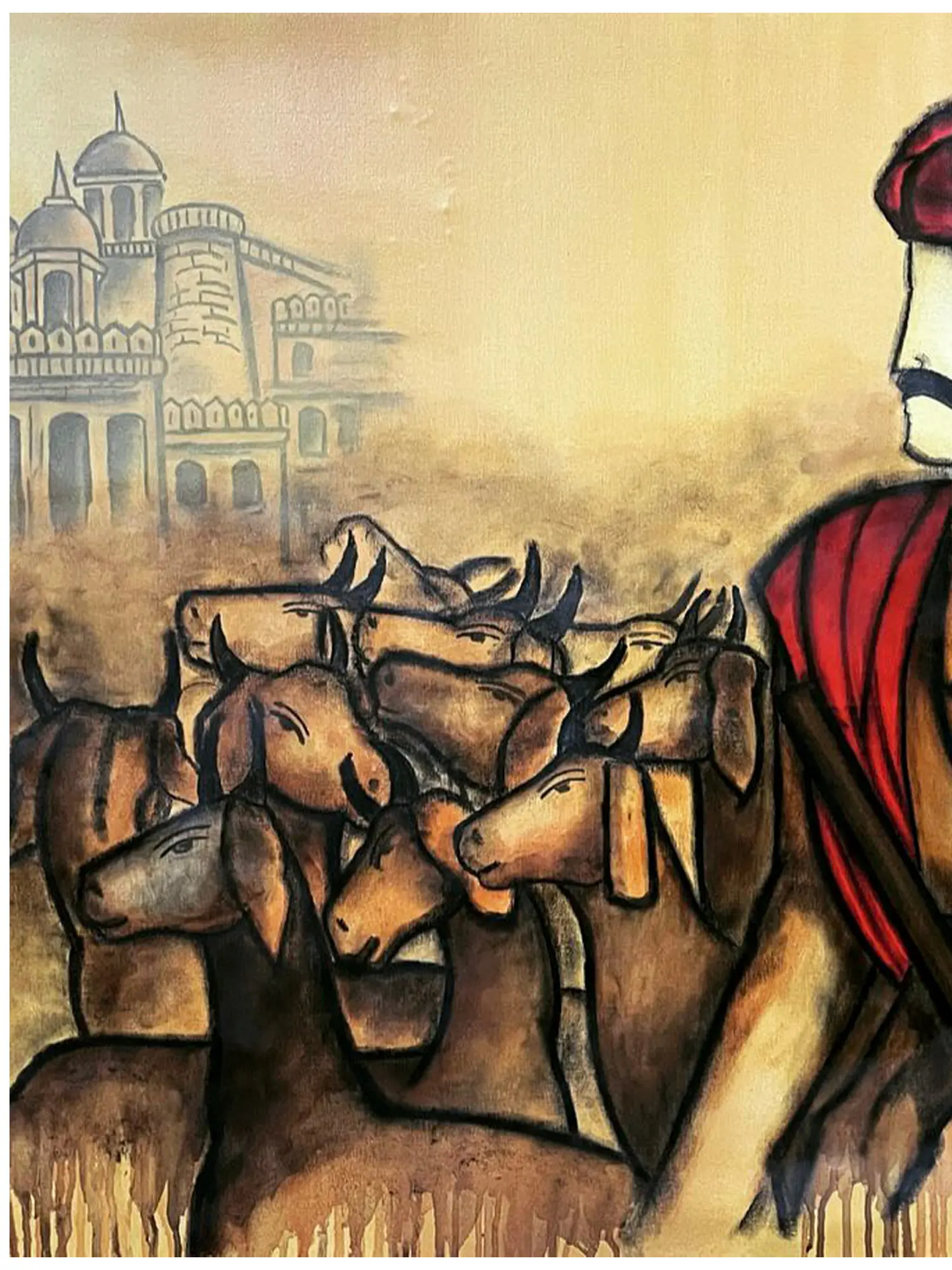 "Shepards With Goats" - Acrylic and wax intertwine on canvas, capturing shepherds guiding their goats. Each stroke whispers of camaraderie between man and animal. The canvas narrates a story of shared journeys - a testament that every path becomes lighter when walked together. Just as the shepherds guide their flock, remember that companionship is a balm for the soul. Amidst life's peaks and valleys, cherish those who walk by your side. Let the canvas remind you that connection makes every step meaningful, and the journey, however arduous, becomes a shared adventure.