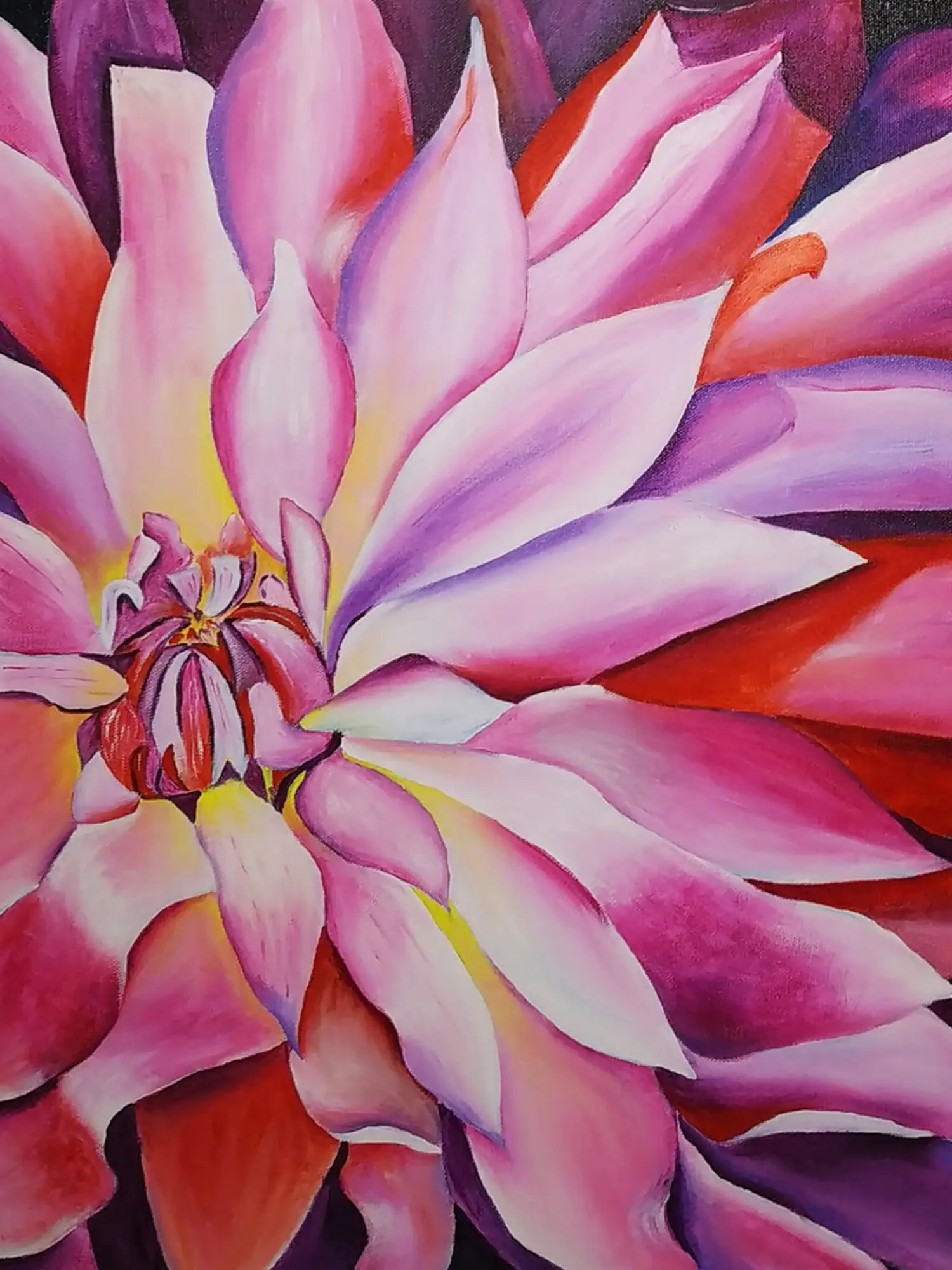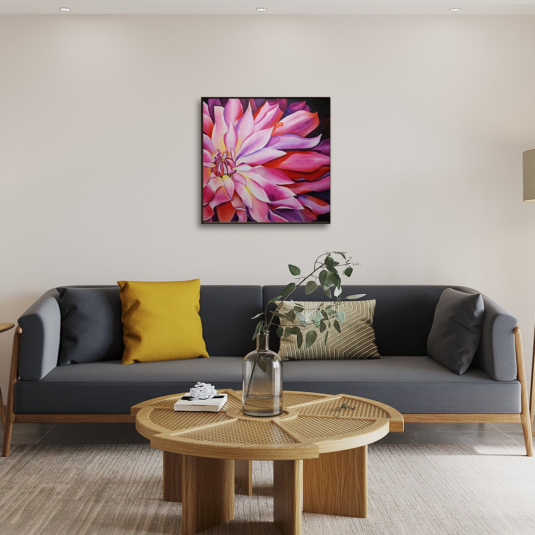 In Bharati Darshan Bhat's acrylic on canvas masterpiece, the Shining Dahlia Flower emerges as a vibrant testament to the power of floral artistry. Through a skillful interplay of colors, Darshan brings the Dahlia to life, utilizing different shades of pink to infuse the flower with a sense of delicate beauty. Shades of yellow and orange serve to delineate individual petals, enhancing their depth and texture against the contrasting background.
