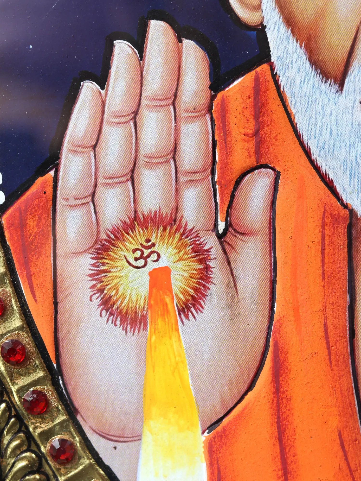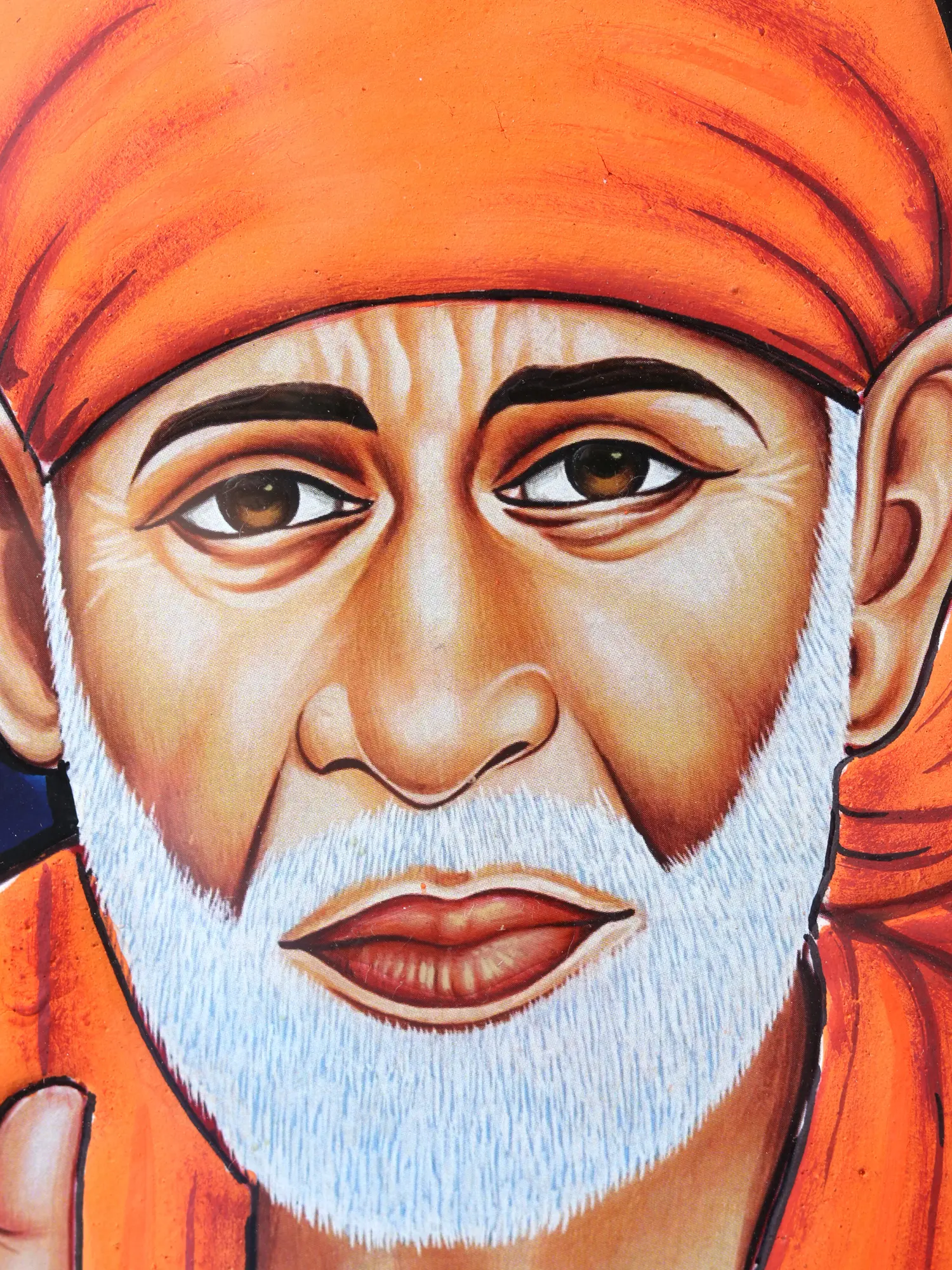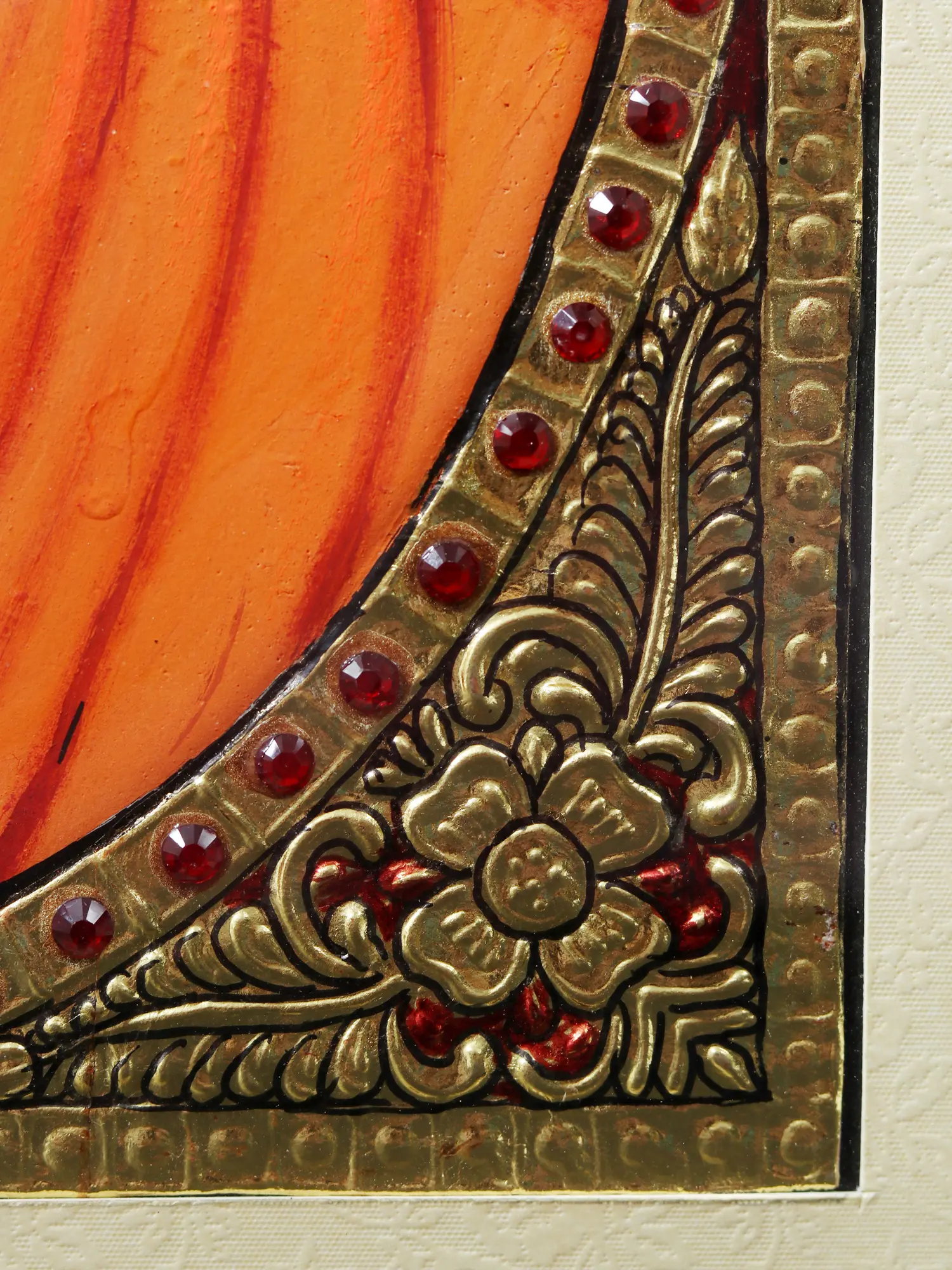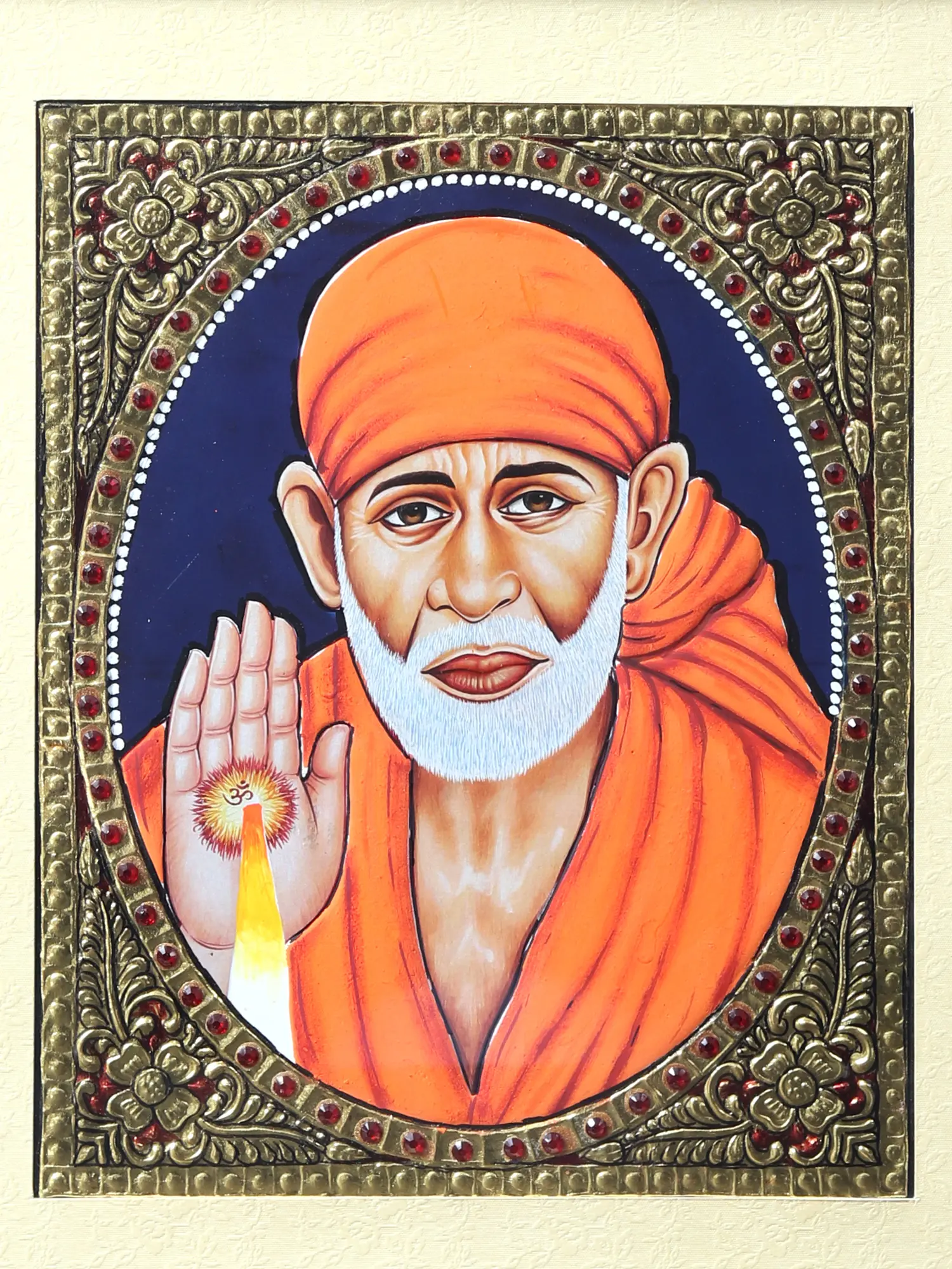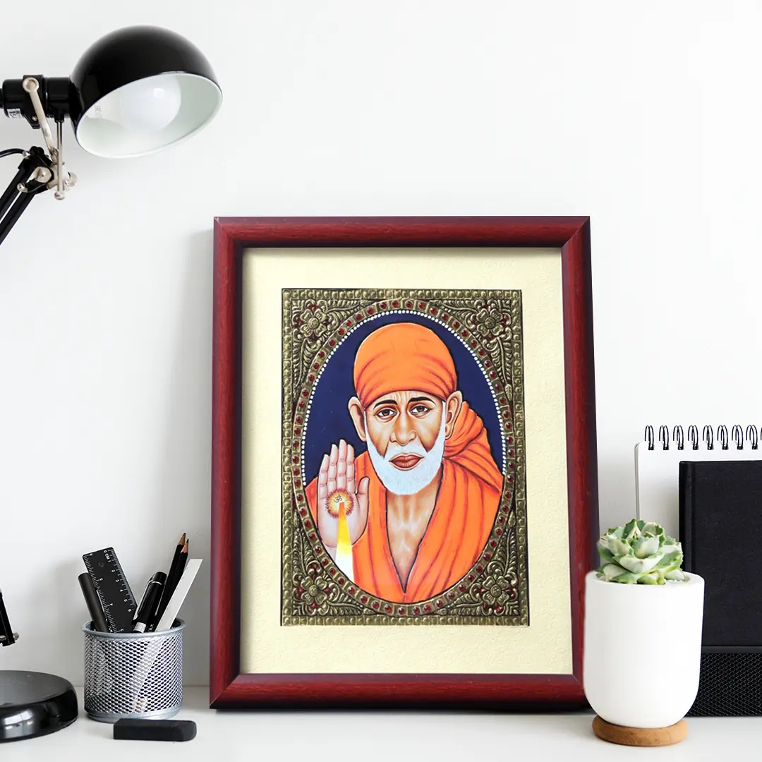 In an Oval inner frame with square borders of studded semi-precious stones and fine gold work, Sai Baba - in his robe of saffron emits blessings onto his devotees, preaching the word of compassion as depicted in this Tanjore painting framed into a wooden exterior.