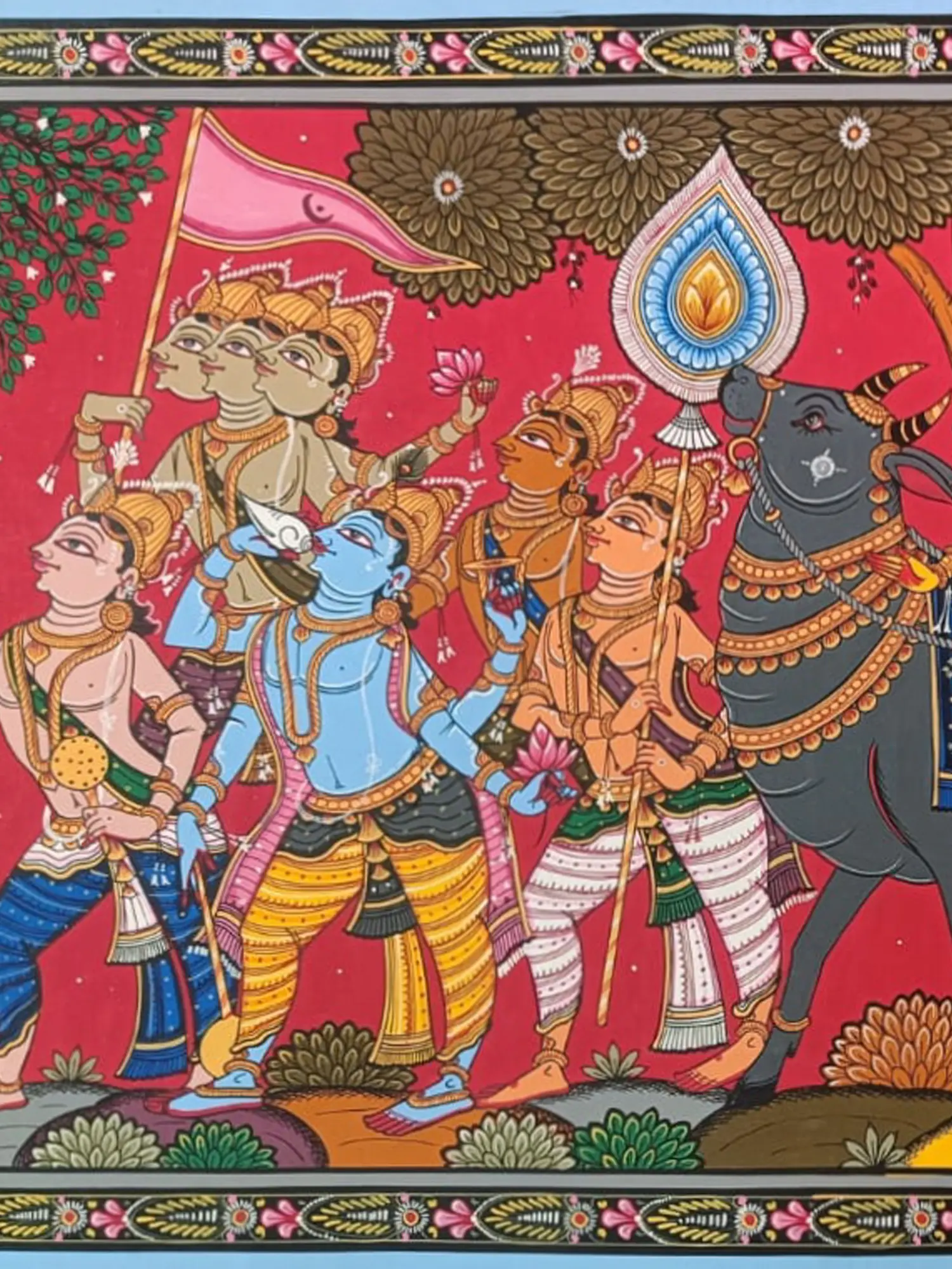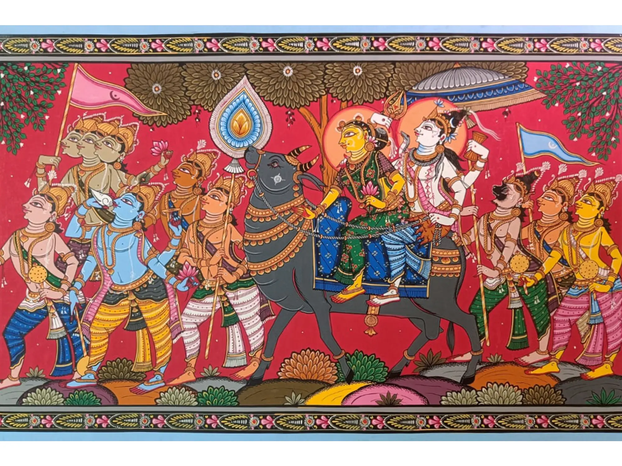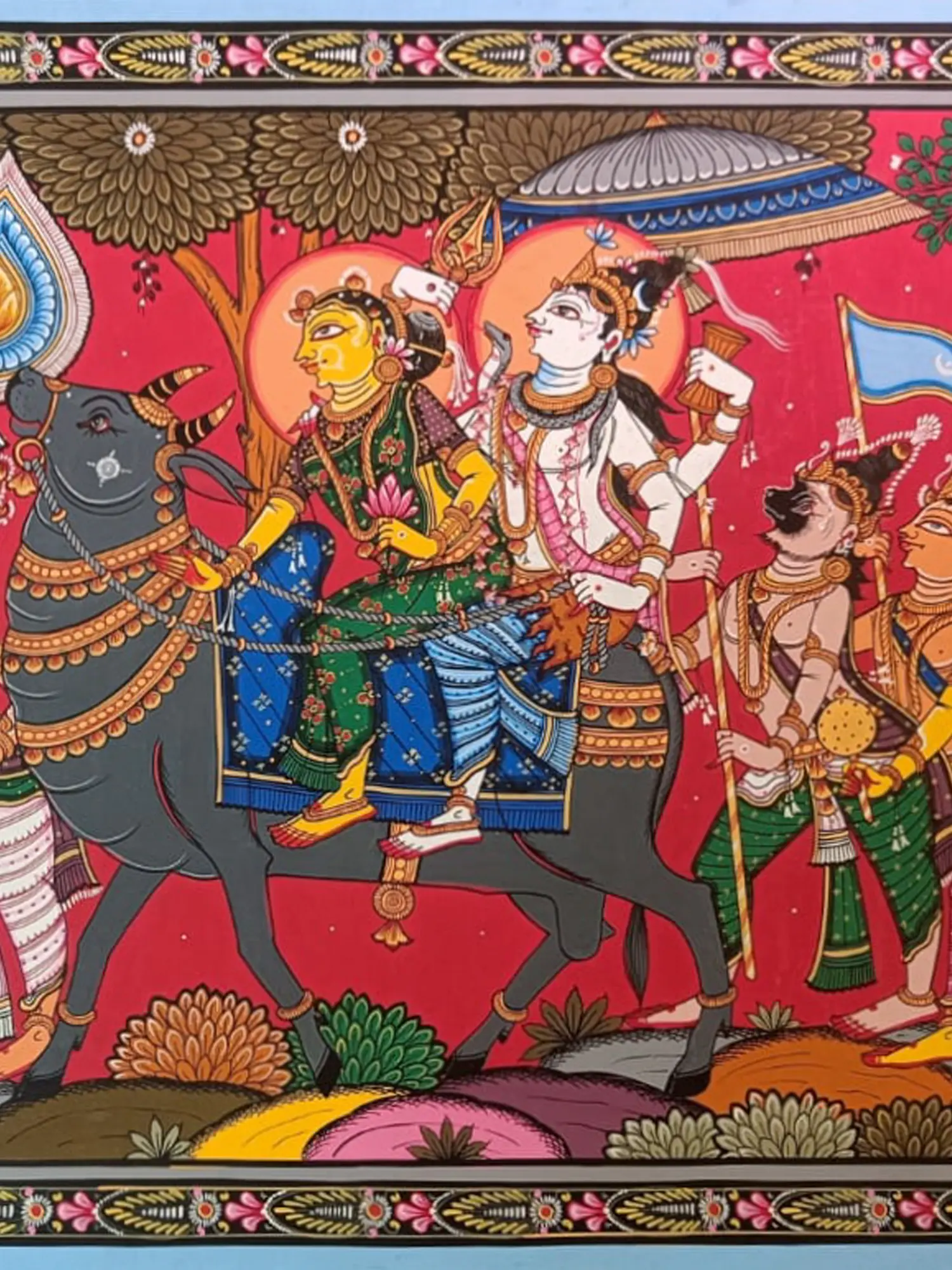 The painting of Shiv Vivah and Devotee depicts a divine union of spiritual love and devotion. Through celestial realms, Lord Shiva unites with his ardent devotee in a timeless dance of cosmic harmony. With natural colours and intricate detailing, the artwork captures the ethereal beauty and transcendent grace of the divine union. From the fervent devotion of the devotee to the divine serenity of Lord Shiva, every stroke resonates with spiritual energy, inviting viewers into the mystical realms of devotion and divine love.