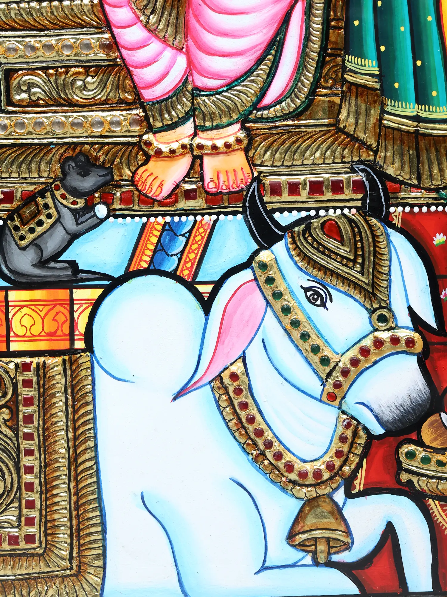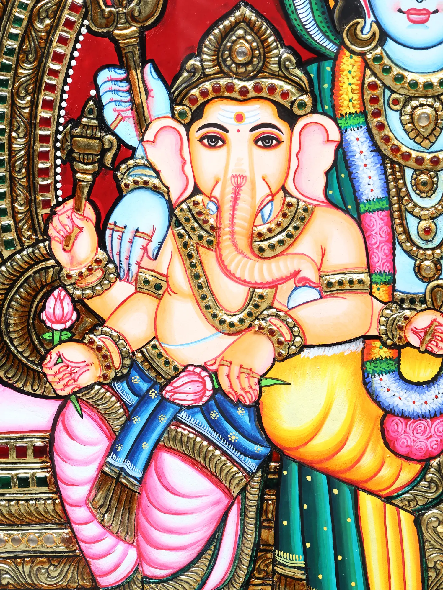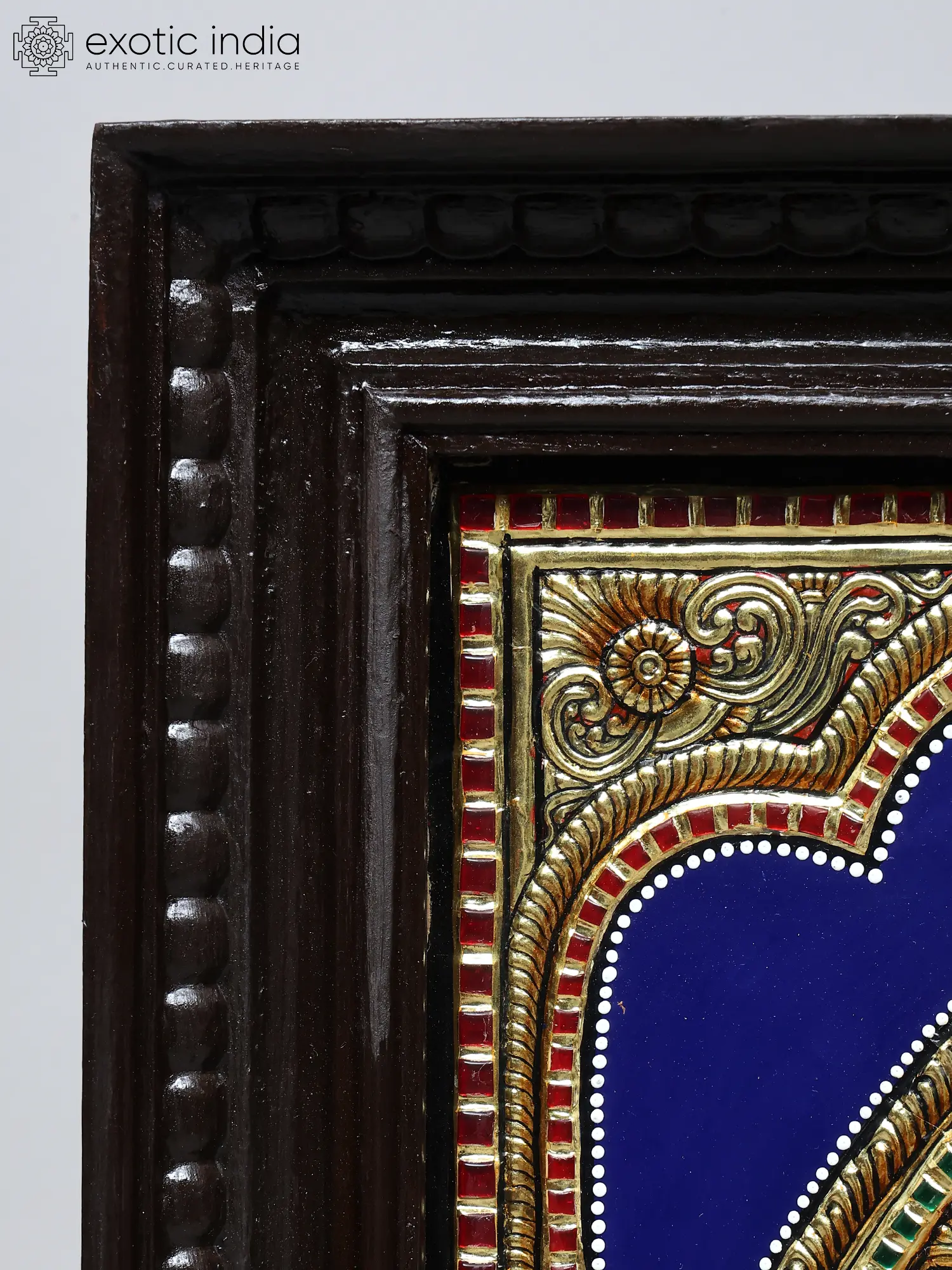 This masterpiece is meticulously crafted using traditional techniques, with vibrant, natural pigments and the finest 24-karat gold work that lends an unparalleled luster to the divine figures and their surroundings. The artwork is encased in a complementary, finely detailed frame, enhancing its grandeur and making it ready to adorn your sacred space, meditation room, or living area. Its dimensions make it a substantial and impactful piece, drawing the eye and inspiring contemplation. Owning this Tanjore painting is an opportunity to bring a piece of India's rich artistic and spiritual heritage into your home, a testament to enduring faith and artistic brilliance.