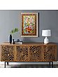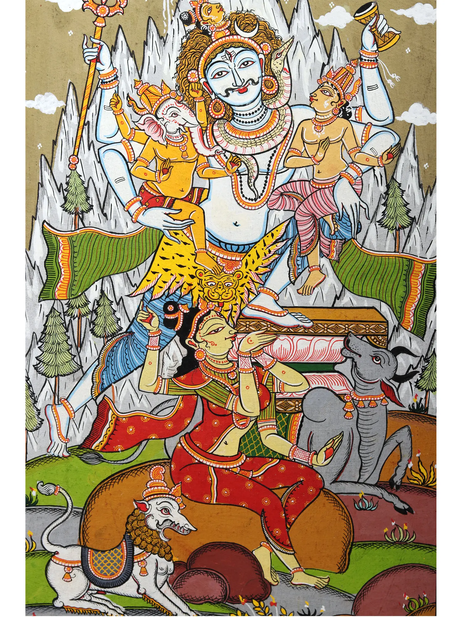 In the heart of Kailash, auspiciousness and eternal bliss find a home in the company of Shiva and his divine family, a group of opposing yet mutually connected divinities, whose together symbolize the Hindu ideal of a perfect family. On handmade paper using watercolors, the artist has created a hushed background with white mountain tops, against which appears Shiva, as if bathed in a constant shower of moonlight.