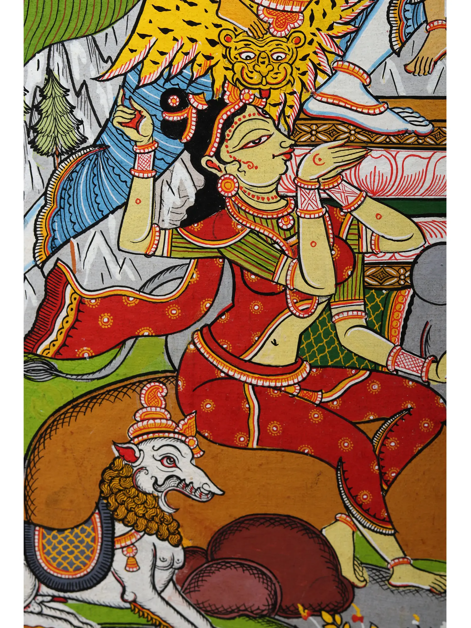 Blissed, goddess Parvati in her four-armed form as the supreme mother or Jagadamba, claps her hands- her happiness giving rise to the spring-like mood of Nature (Prakriti, who is an aspect of Parvati). Seated at the top of Shiva’s locks, Ganga’s heart fills with happiness as she witnesses this divine bliss, her joy causing a spurt of water that falls on Ganesha’s head, sprinkling it with her blessings.