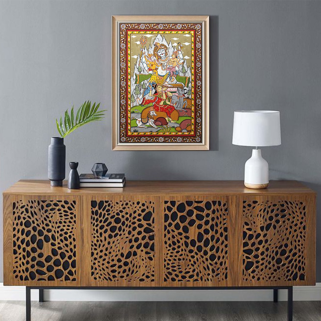 With one leg placed on the lotus pedestal and the other on the ground, Shiva seems to be dancing, with his children- Ganesha and Kartikeya in his lap, both overjoyed by the embrace of their father. Seeing this Lila of Shiva, the Lord of three realms playing with his son, the inhabitants of Kailasha- Nandi and Simha (lion, mount of Parvati) appear in awe, gazing in surprise and adoration at Mahadeva.