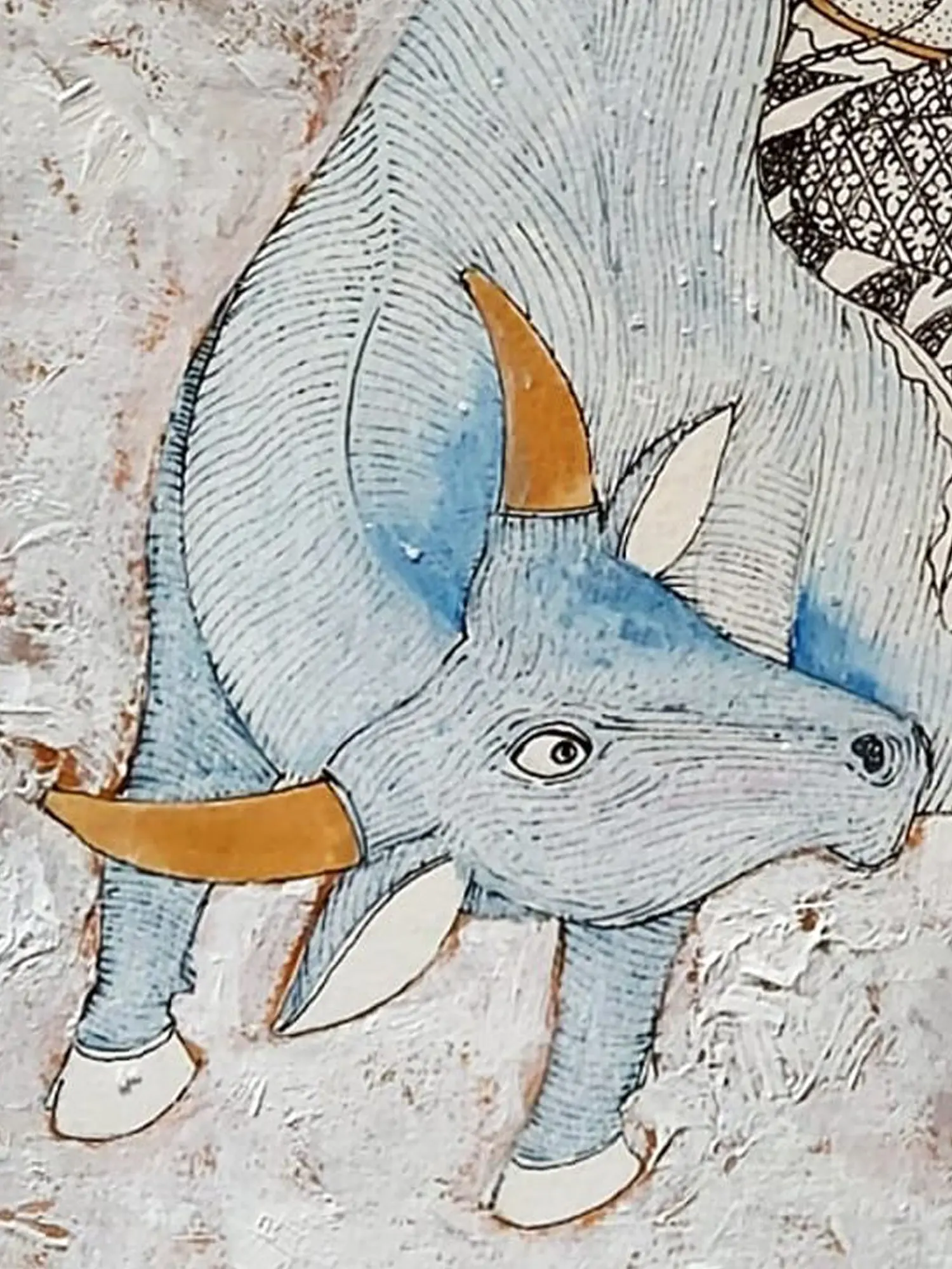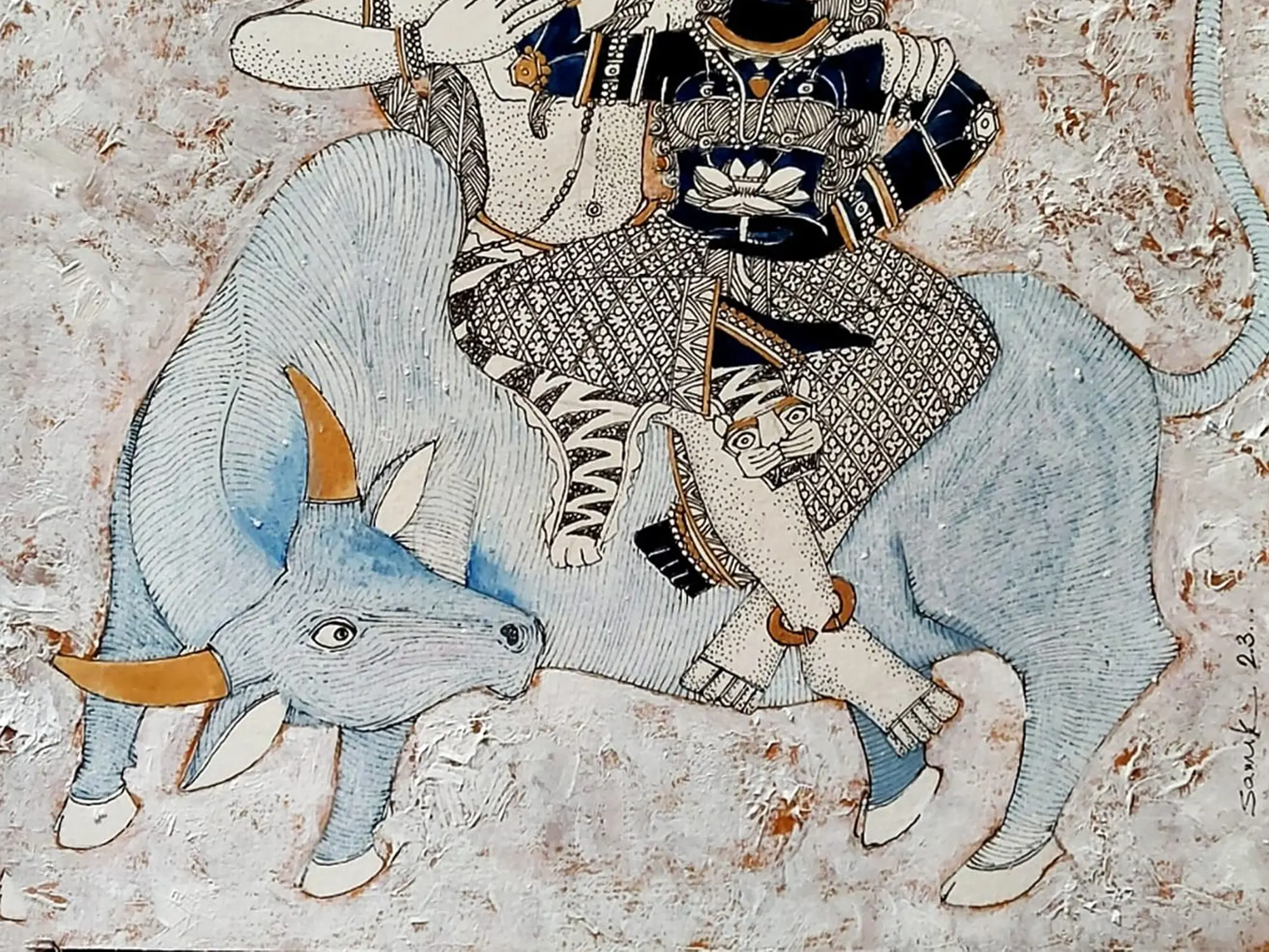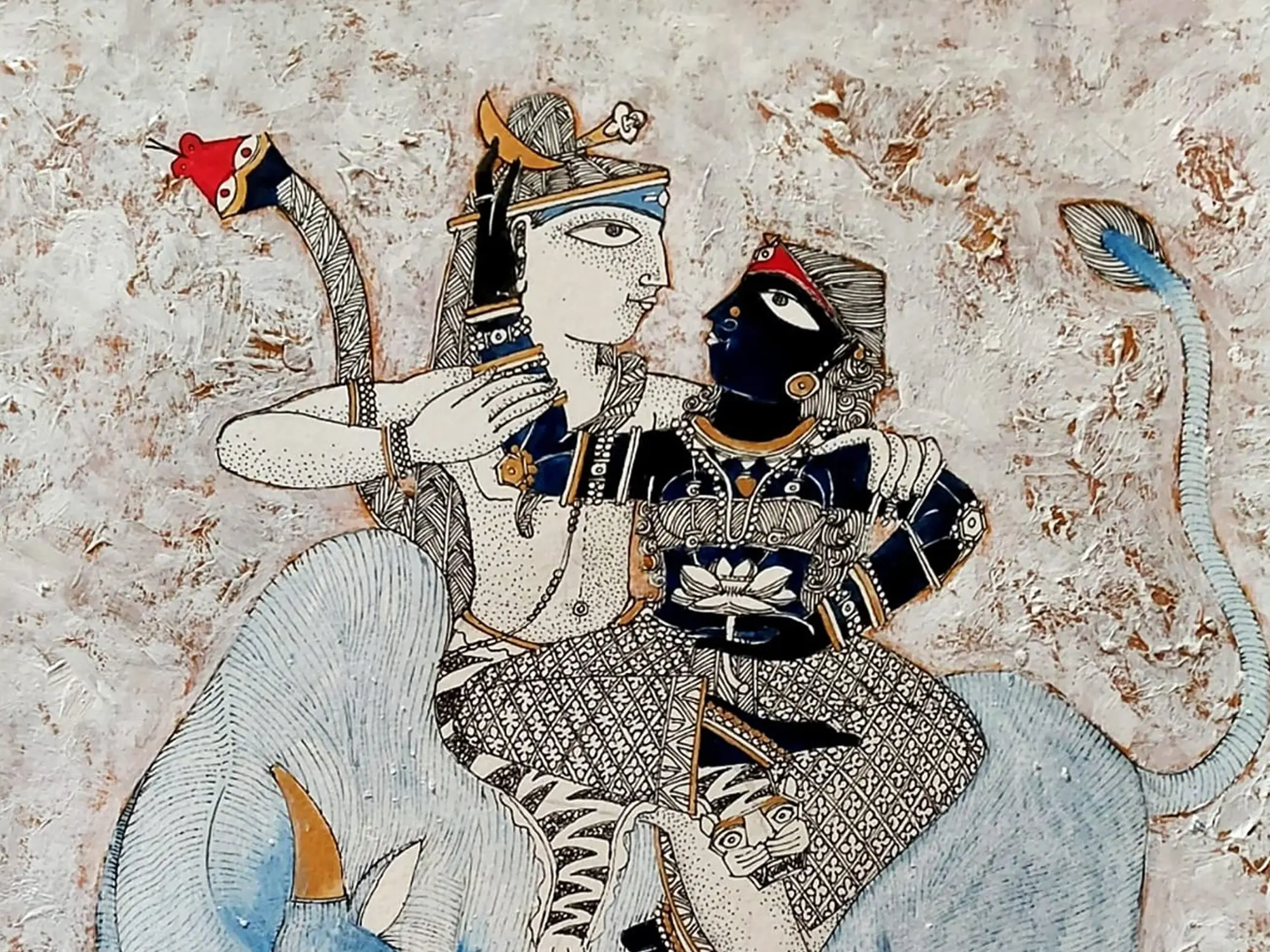 The visual narrative unfolds with striking clarity, depicting the serene figures of Shiva and Parvati atop Nandi, Shiva's steadfast vahana. Observe the intricate patterns adorning their garments, each line precisely rendered with a masterful hand. The gentle blue hues of the divine bull, contrasted with the stark, elegant forms of the deities and the textured, neutral background, create a harmonious and visually arresting composition that draws the viewer into its sacred narrative. The 12x12 inch format offers an intimate yet impactful presence.