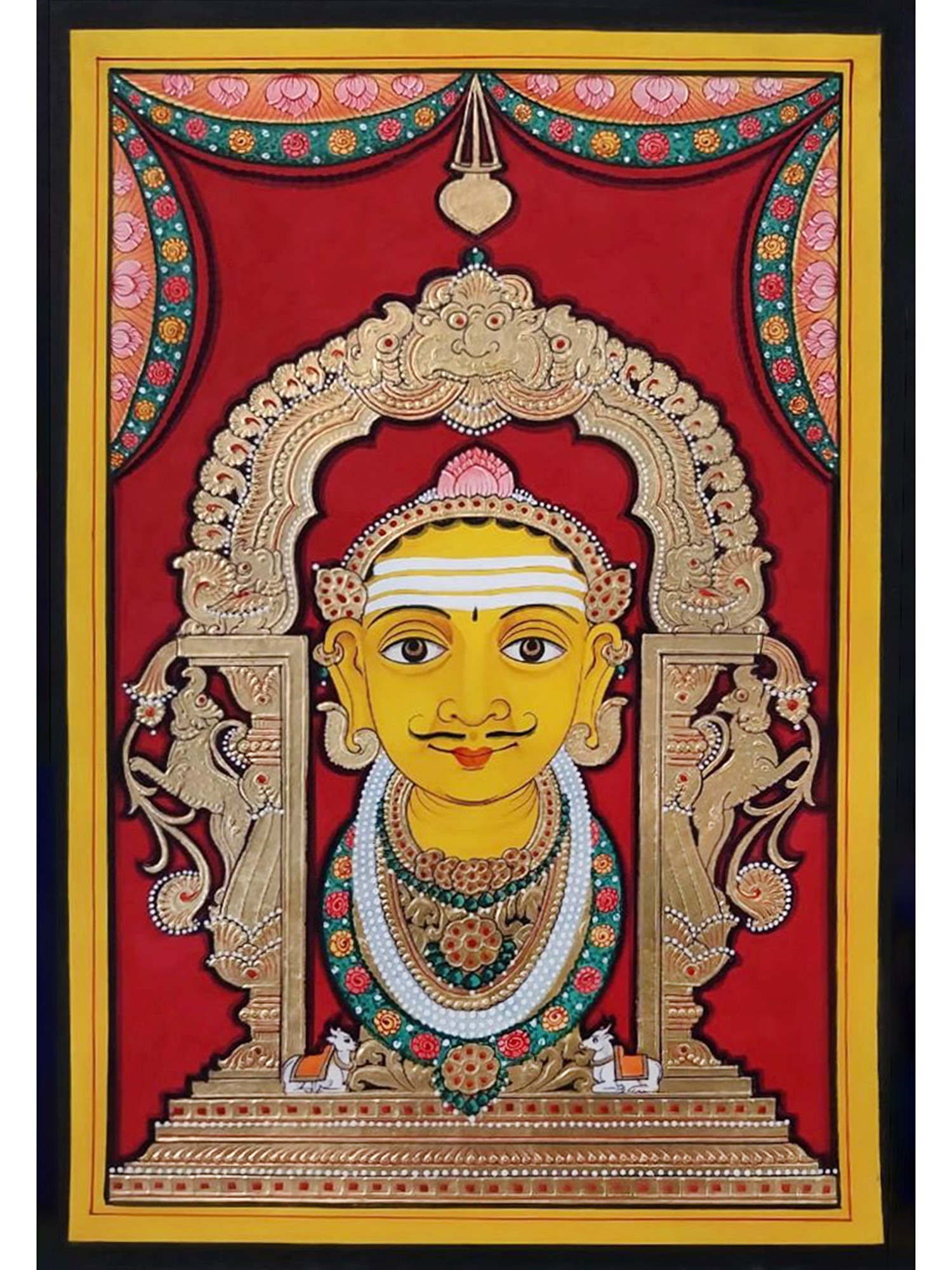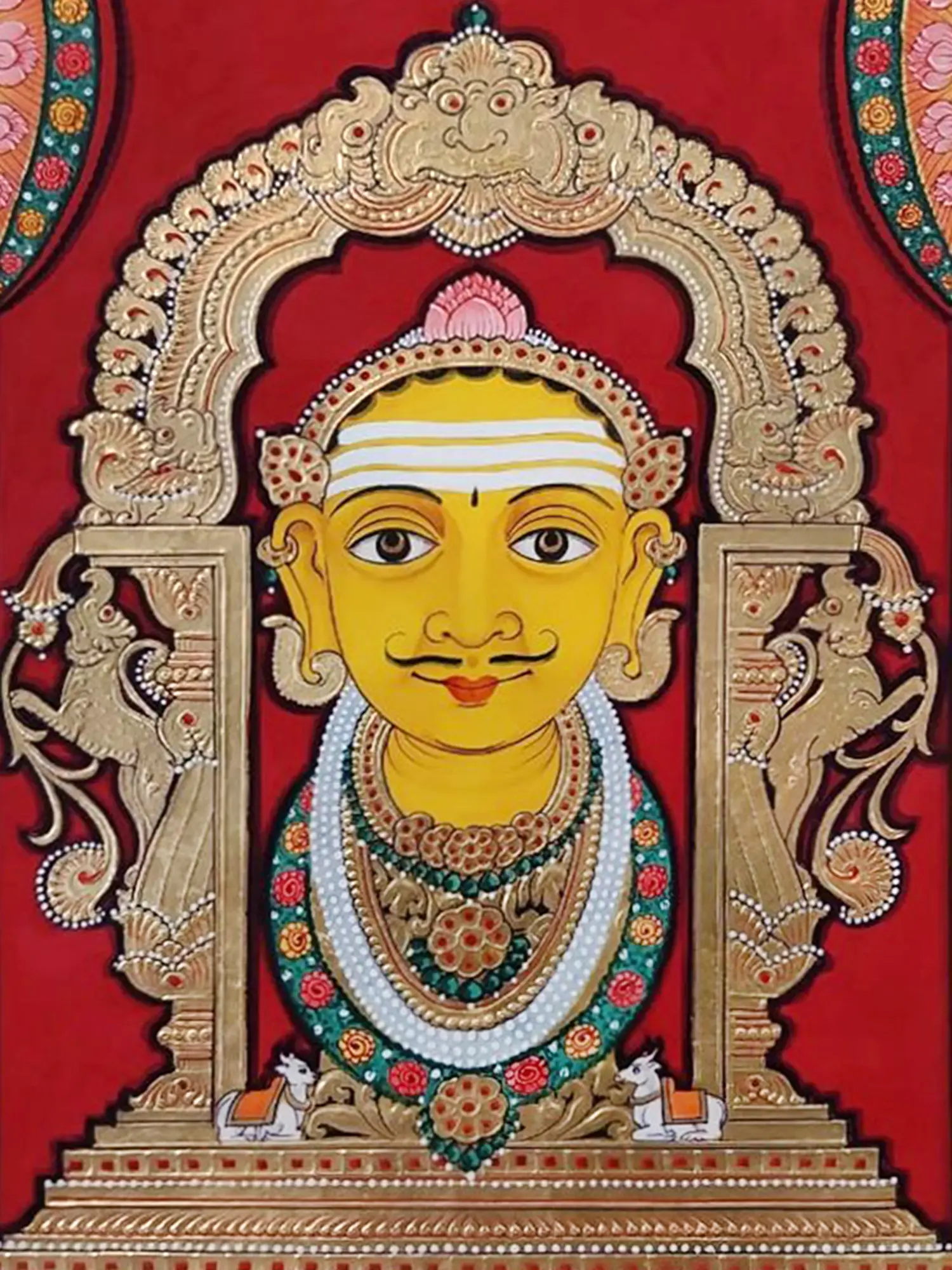 You will appreciate the intricate details that adorn this composition, from the serene expression and traditional markings on the central figure's face to the richly ornamented Prabhavali that frames it. The Prabhavali, a traditional halo or aura, is a marvel of design, intricately carved and embellished with symbolic motifs, creating a sense of divine enclosure. Delicate floral patterns and mythical creatures are subtly woven into the architectural elements, showcasing a deep understanding of classical aesthetics and devotional symbolism. The vibrant red background serves as a dramatic contrast, making the golden hues and the central figure truly radiate.