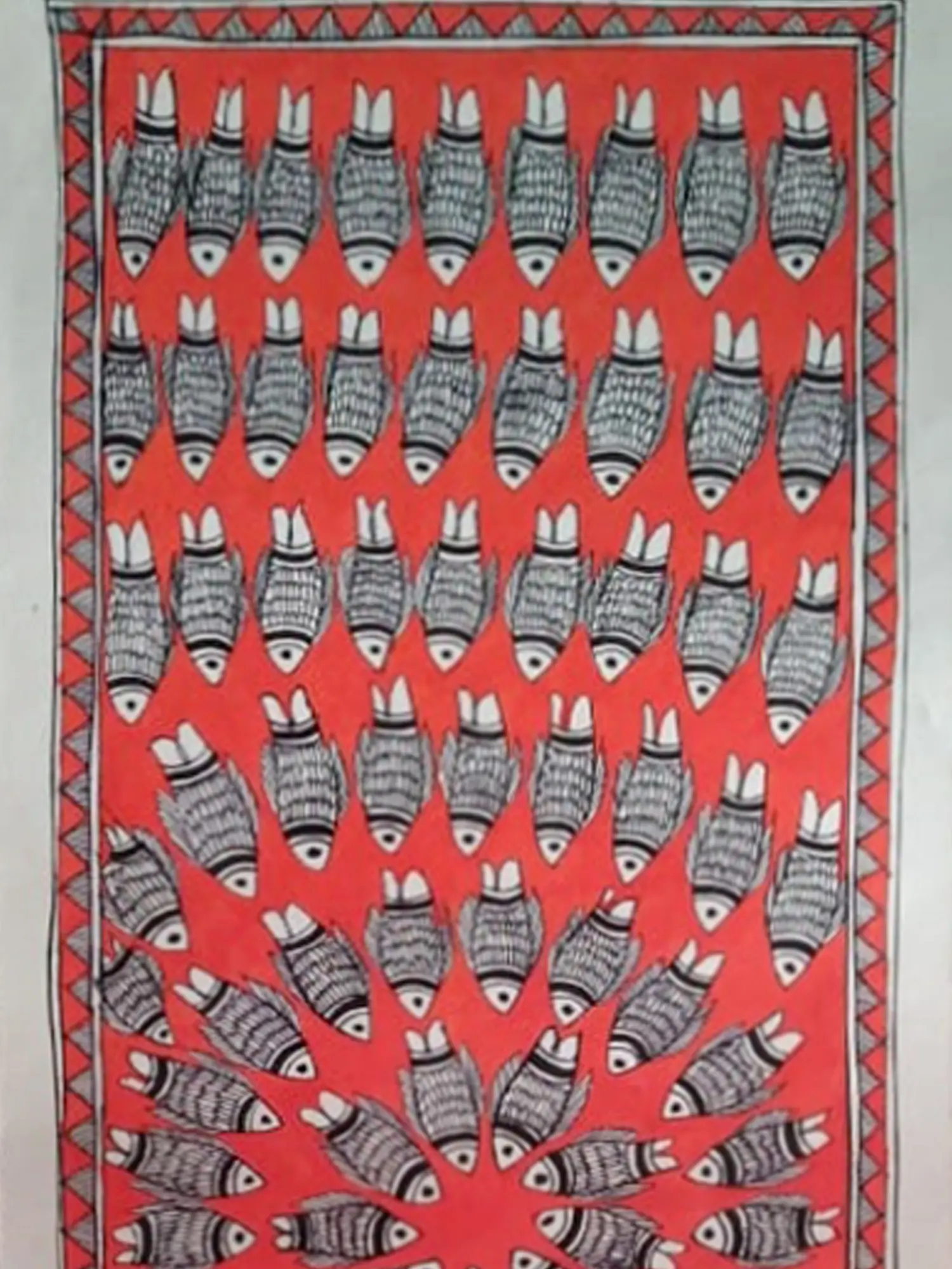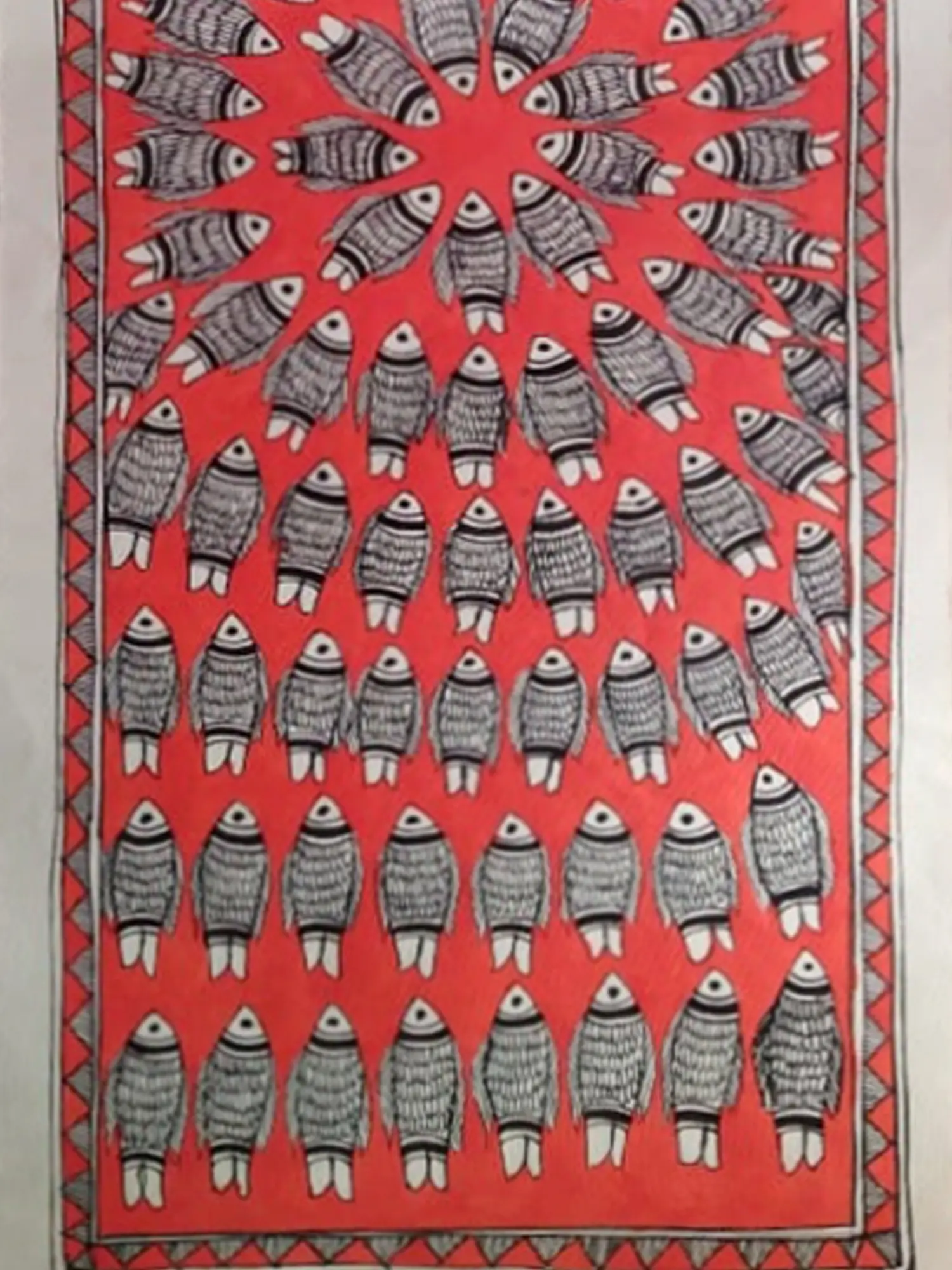 The contrast between the bold red backdrop and the monochromatic depictions of fish creates a visually striking composition, capturing the essence of this ancient Indian art form. Archana Jha's skilled use of natural colors and meticulous detailing make this piece a standout choice for both cultural enthusiasts and admirers of fine art.