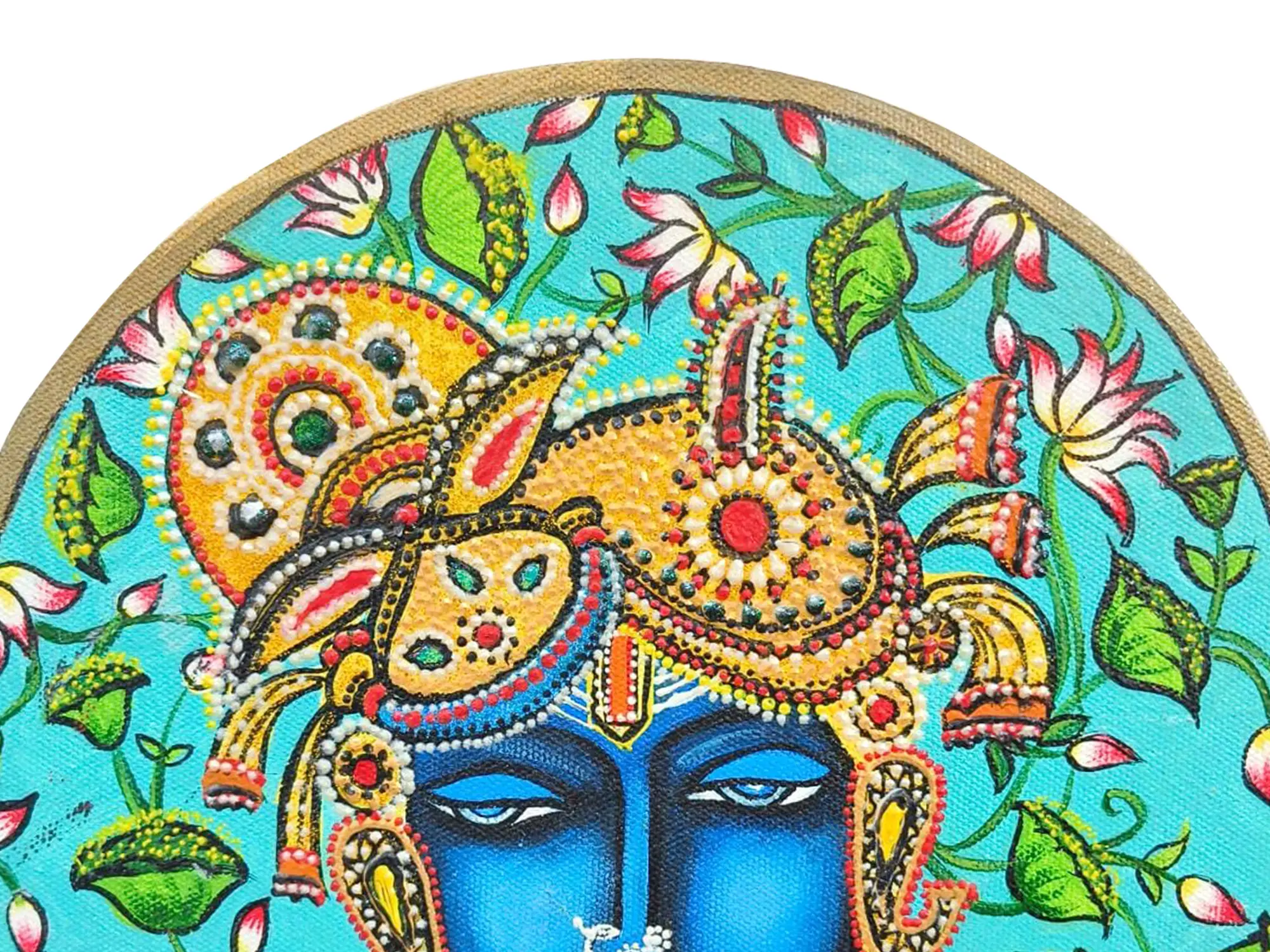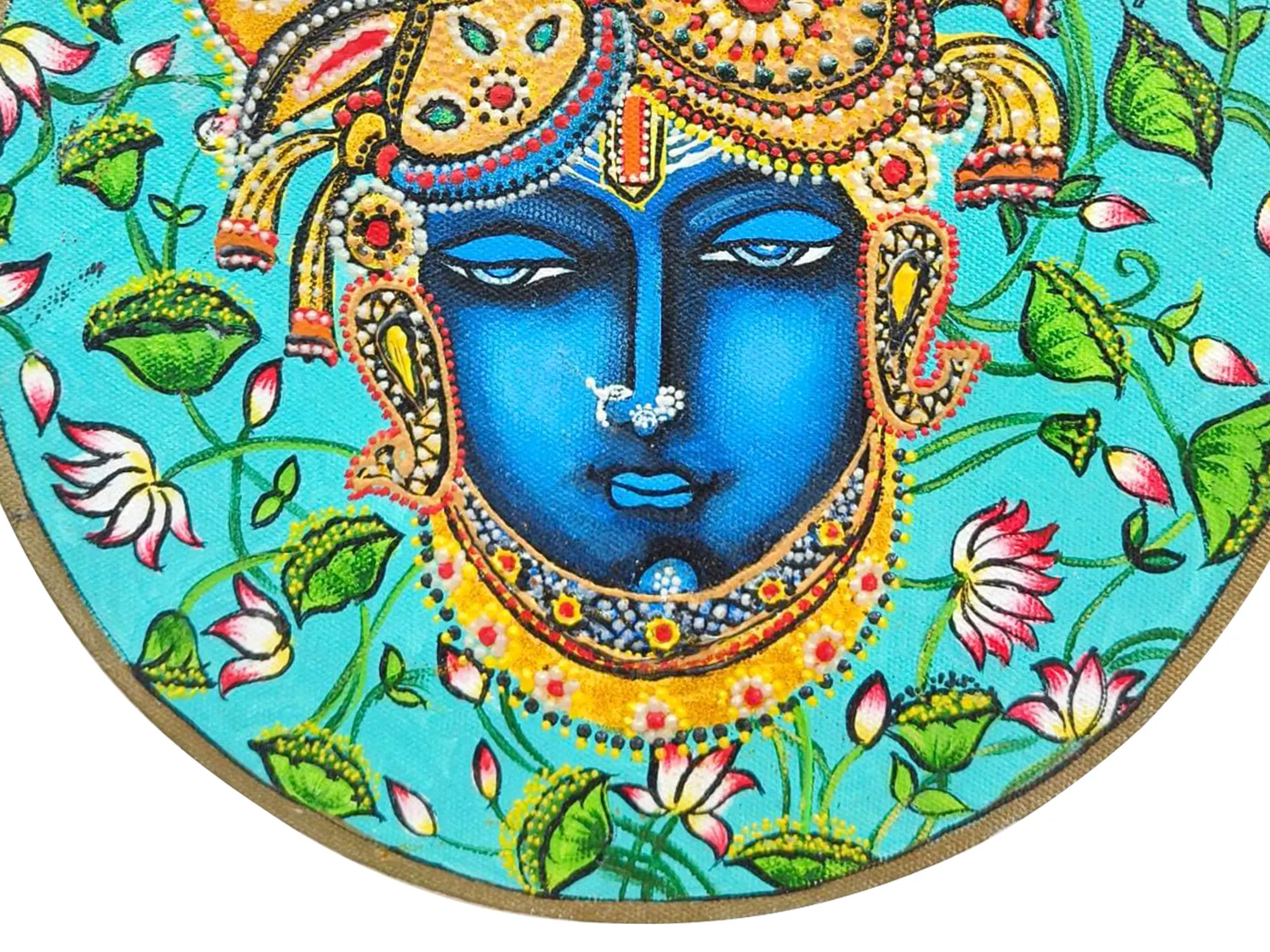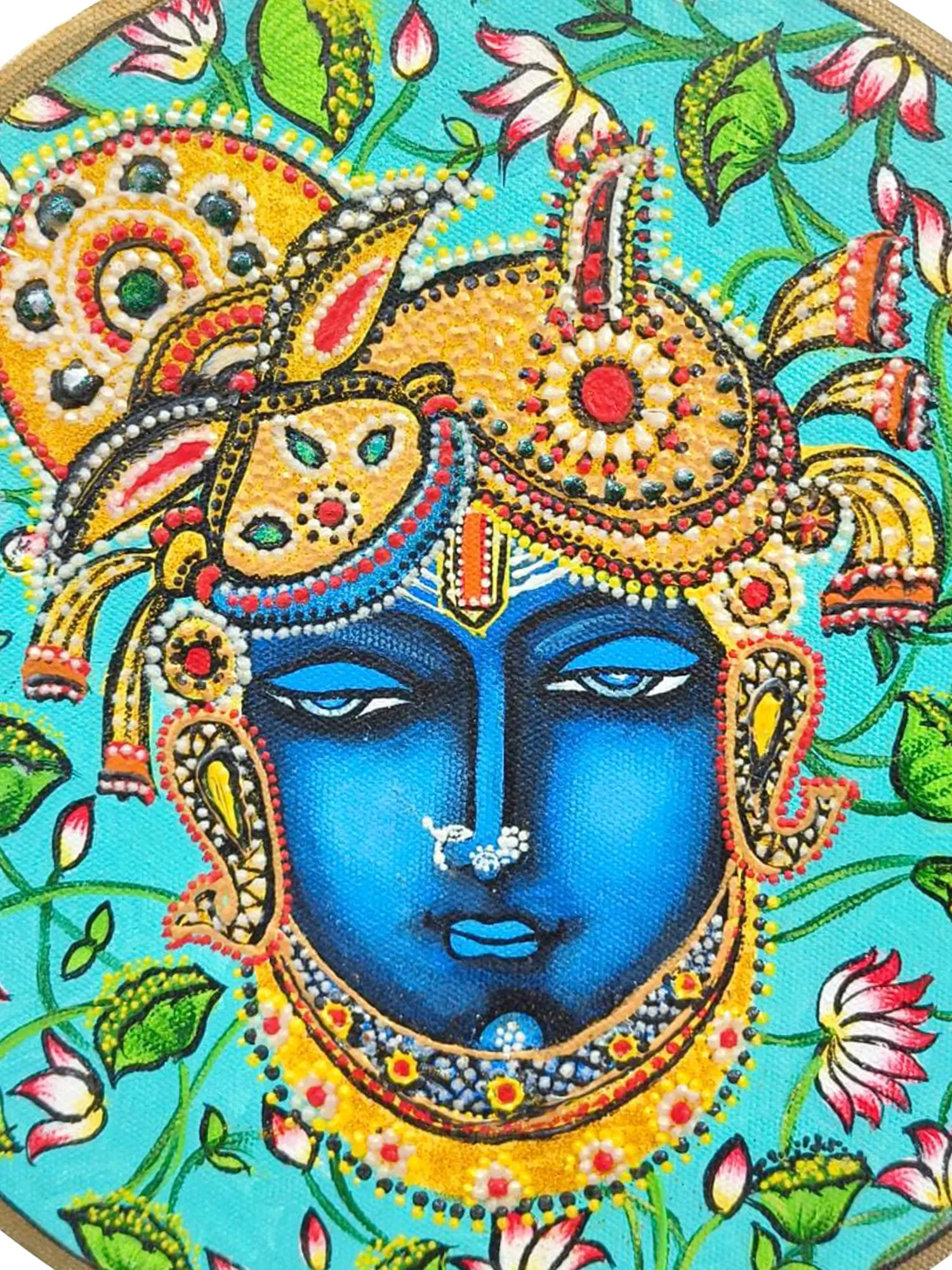 Circular frames indeed add a unique aesthetic to paintings, enhancing their visual appeal and making them suitable for hanging. Shalini's "Shreenathji Face Painting" exemplifies this artistic choice brilliantly. The circular frame complements the divine portrayal of Srinathji, creating a harmonious composition. Against a serene blue background, Srinathji's face emerges, encircled by delicately painted lotuses, exuding a sense of purity and divinity.