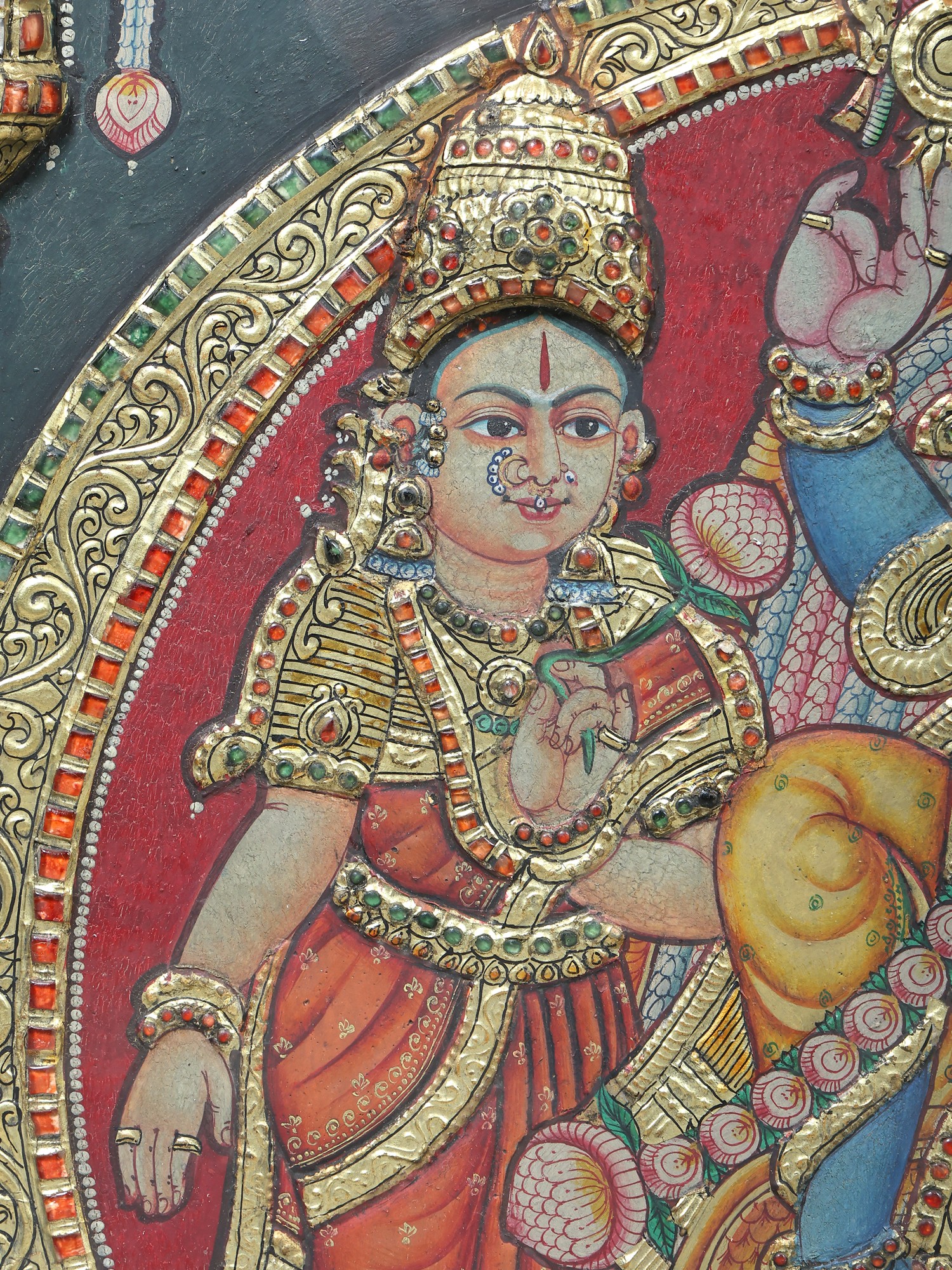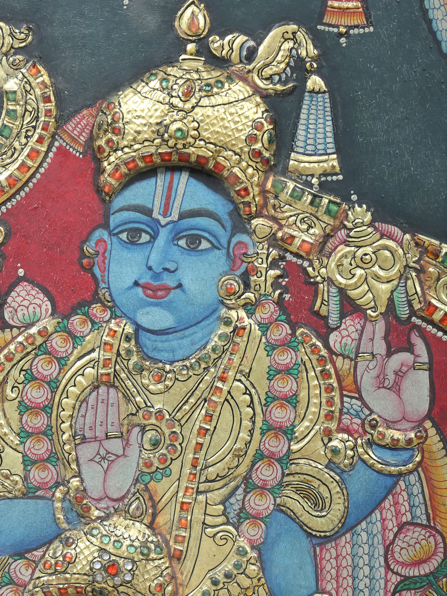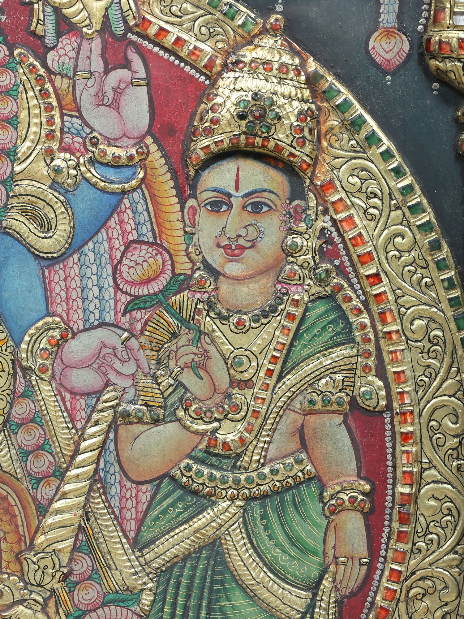 Vishnu-Lakshmi Seated on Sheshnag with Garuda and Hanuman Standing Beside Them | Embossed Tanjore Painting with 24 Karat Gold Work | With Vintage Frame