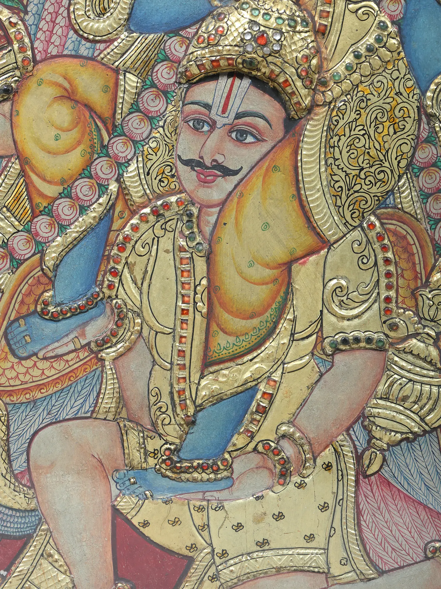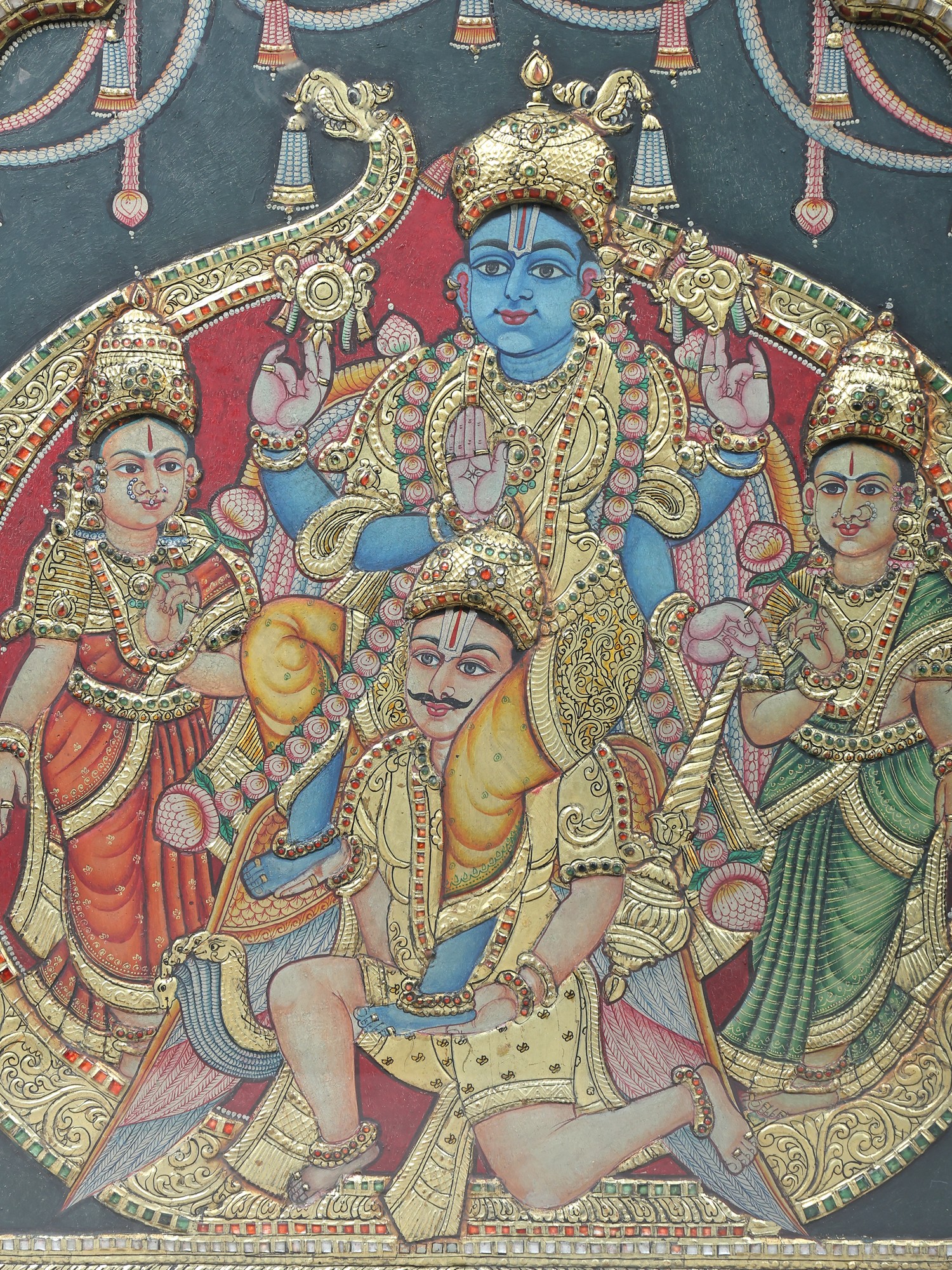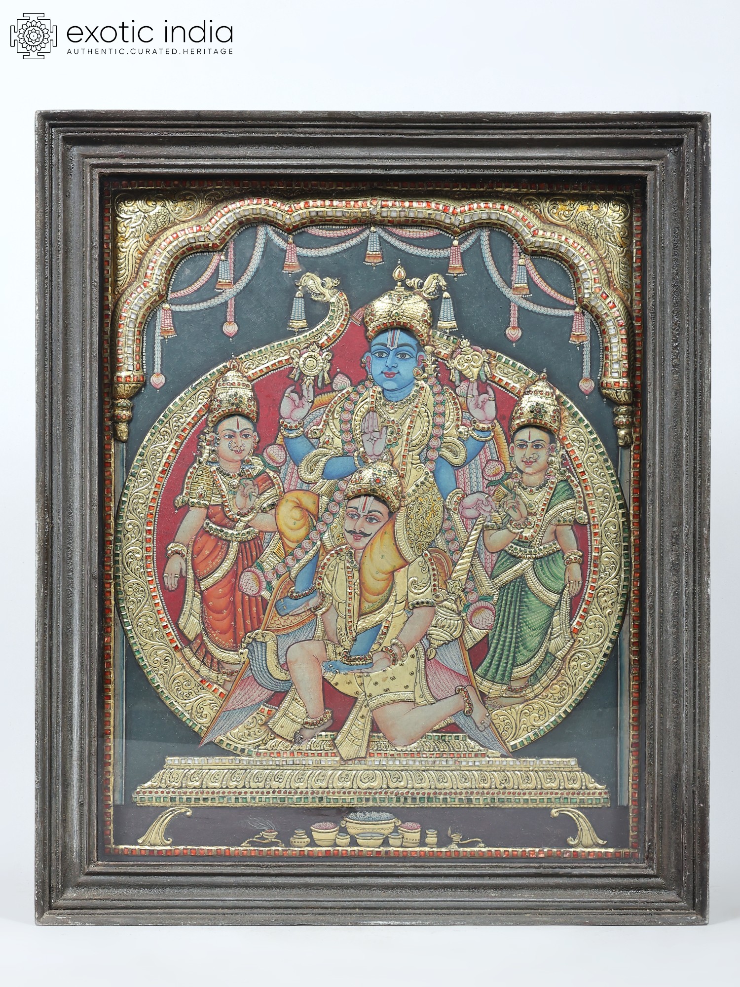 Vishnu-Lakshmi Seated on Sheshnag with Garuda and Hanuman Standing Beside Them | Embossed Tanjore Painting with 24 Karat Gold Work | With Vintage Frame