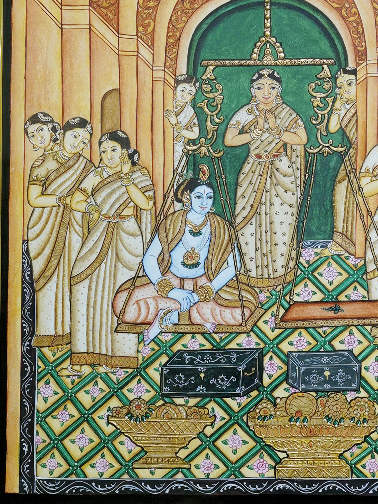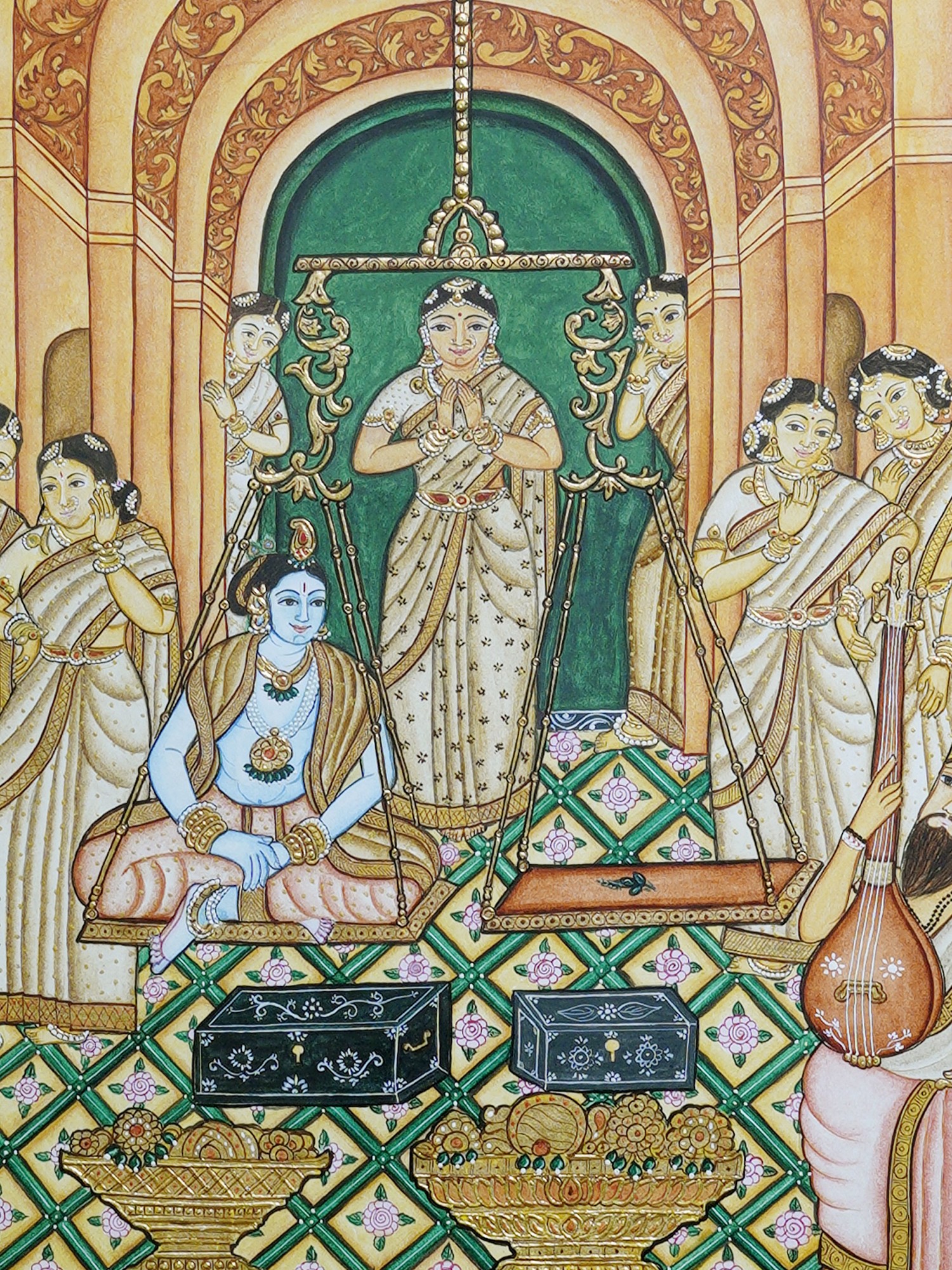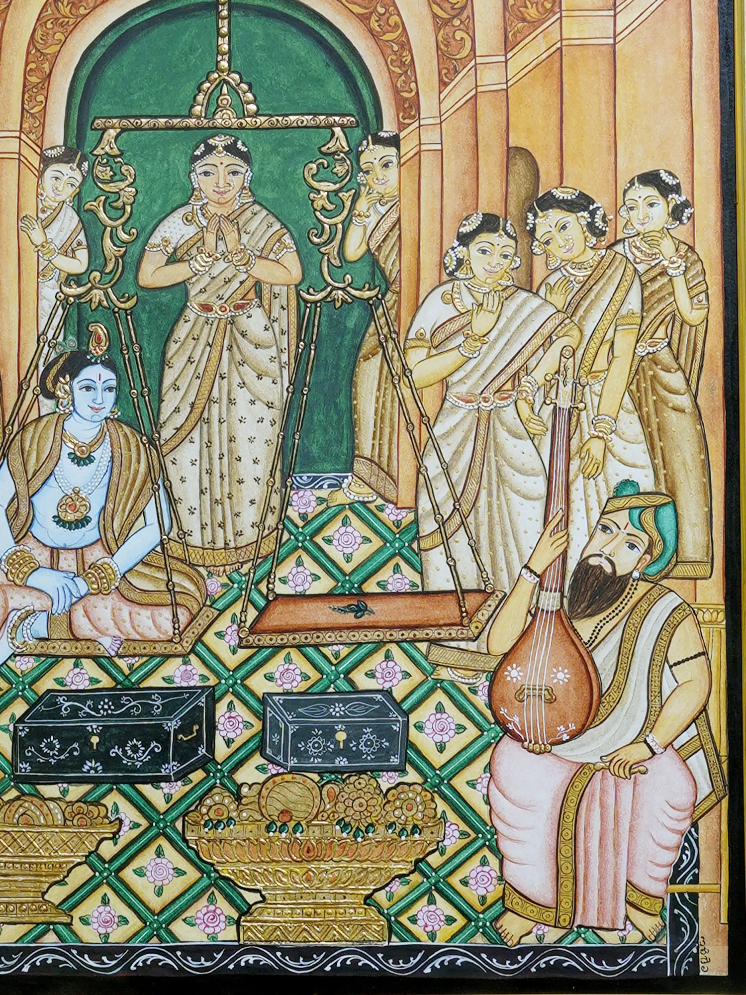 This piece is a fine example of the Mysore painting style, known for its fine brushwork, soft colors, and delicate detailing. Originating in the princely state of Mysore, this art form thrived under the patronage of the Wodeyar dynasty. Mysore paintings, with their rich colors and intricate depictions, often featured themes from Hindu mythology, royal court life, and scenes of nature. The rich heritage of Mysore paintings is preserved through generations of skilled artists, each contributing to its unique evolution and enduring appeal. This particular painting is a testament to their skill and artistic vision.