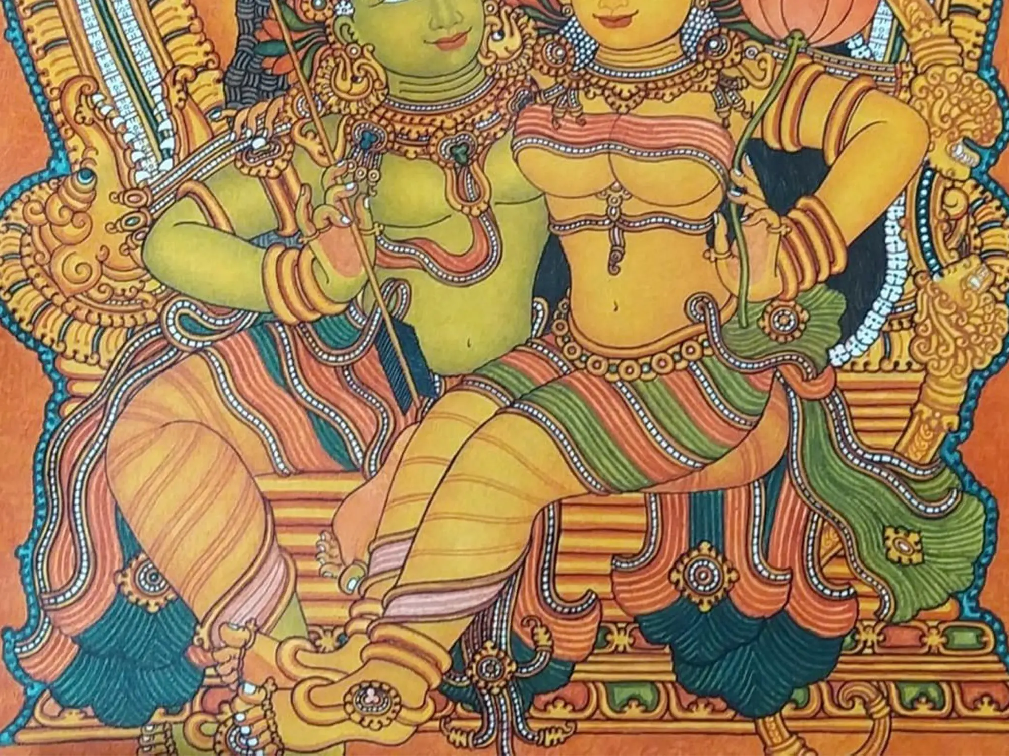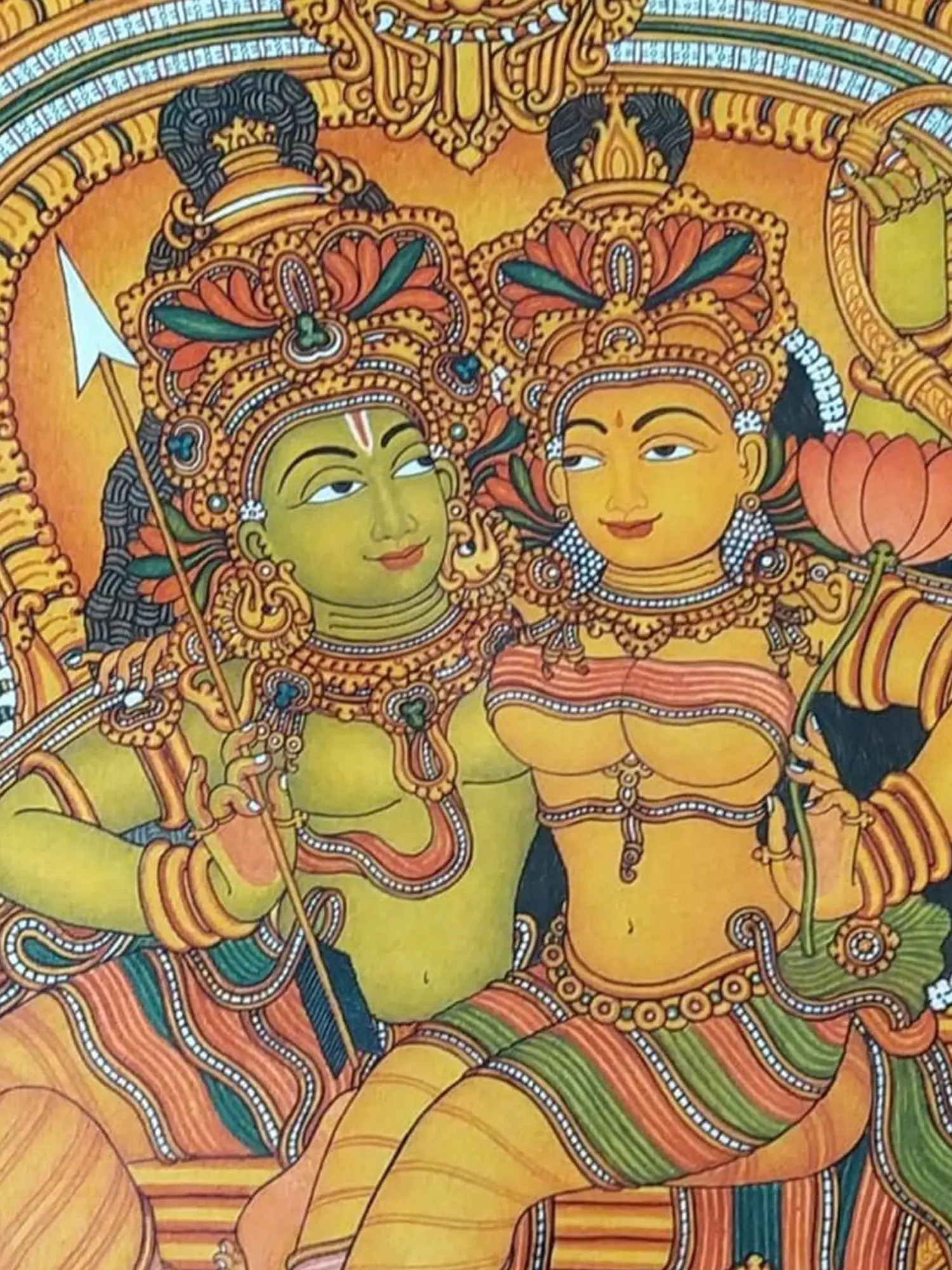 Rama, holding his bow and arrow as delicately as Sita holds her lotus, carries his beloved on his lap. Devi Sita, who is Lakshmi herself, brims with signs of youth and auspiciousness. Presenting Rama and Sita in a heavenly togetherness, this painting is a rare artwork, celebrating the love and affection of the duo share whose eternal purity and sweetness can be felt in the way they are rendered by the artist.
