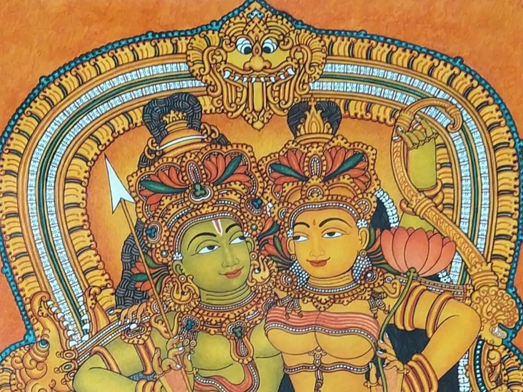 The king and queen of Ayodhya and the divine incarnations of Vishnu and Lakshmi, Lord Rama and Devi Sita in this acrylic on canvas appear as the supreme sovereigns of the world. Adorned with ornate jewelry, and enthroned on an imposing throne, the celestial duo are immersed in the sweetness of each other's proximity, gazing gently at one another, creating an atmosphere of pure love and conjugal bliss.