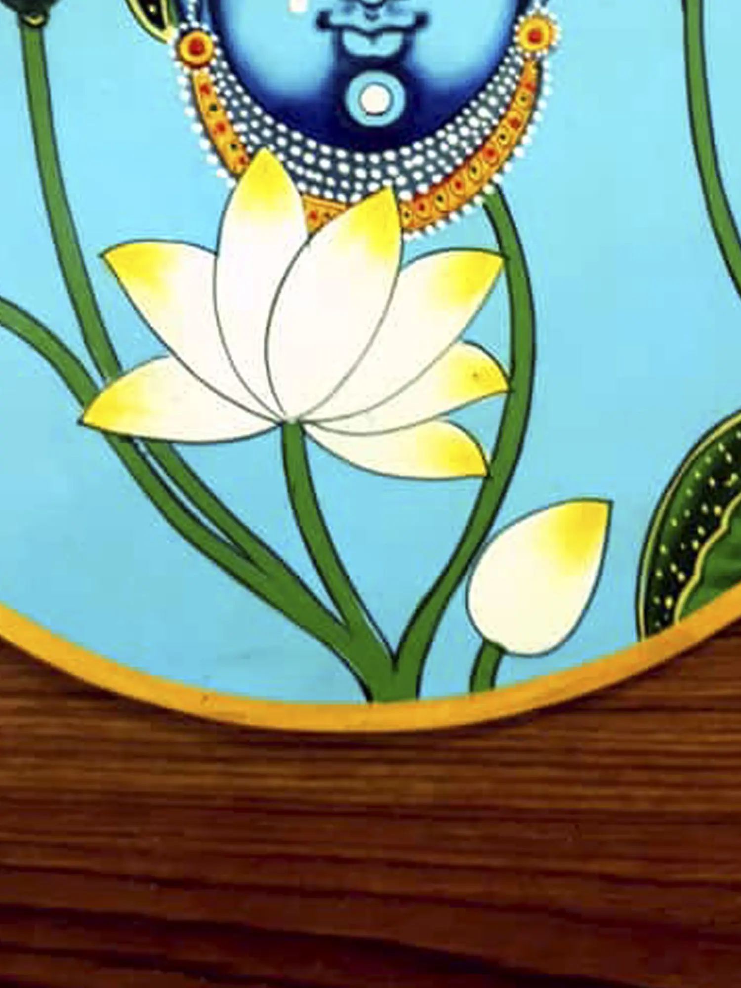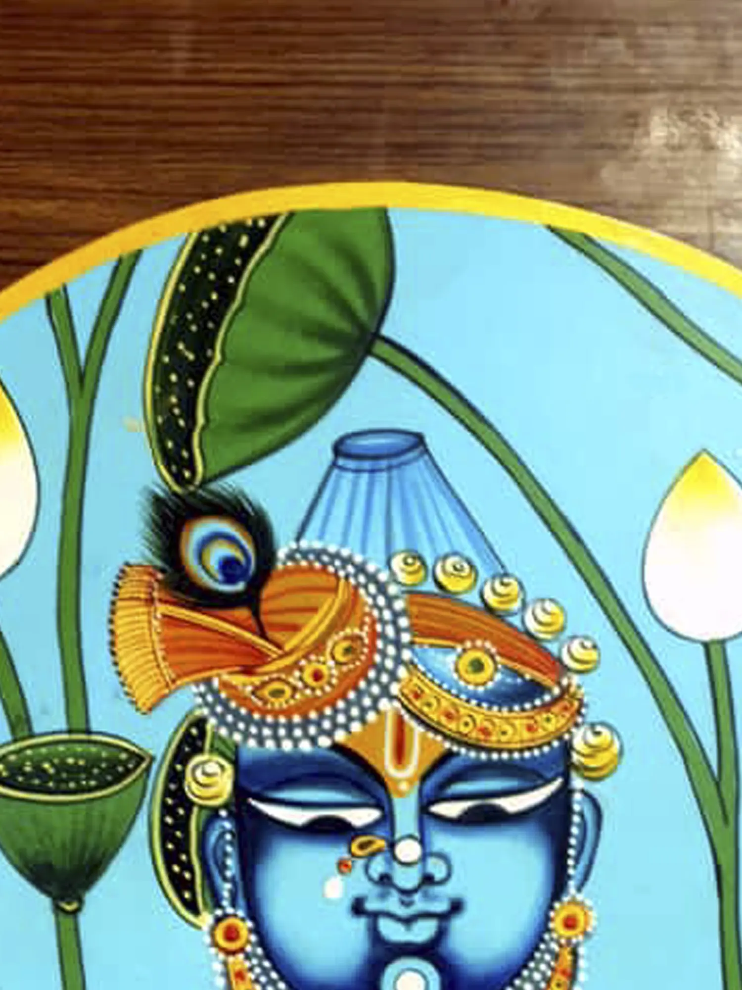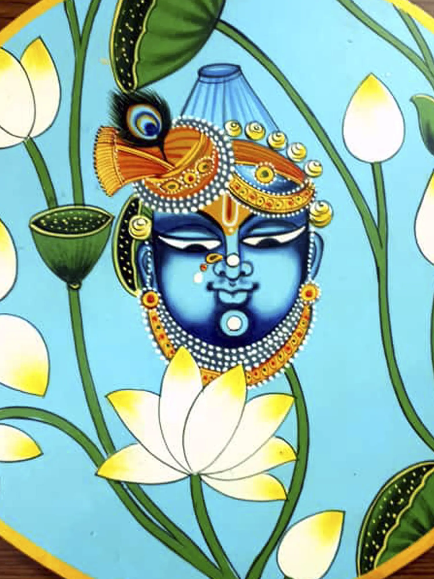 The inclusion of a white lotus further symbolizes purity and spiritual enlightenment. Bhardwaj's artwork not only captures the aesthetic beauty of Shrinath Ji but also creates a sacred tableau that invites contemplation and reverence for the divine in a circular, harmonious composition.