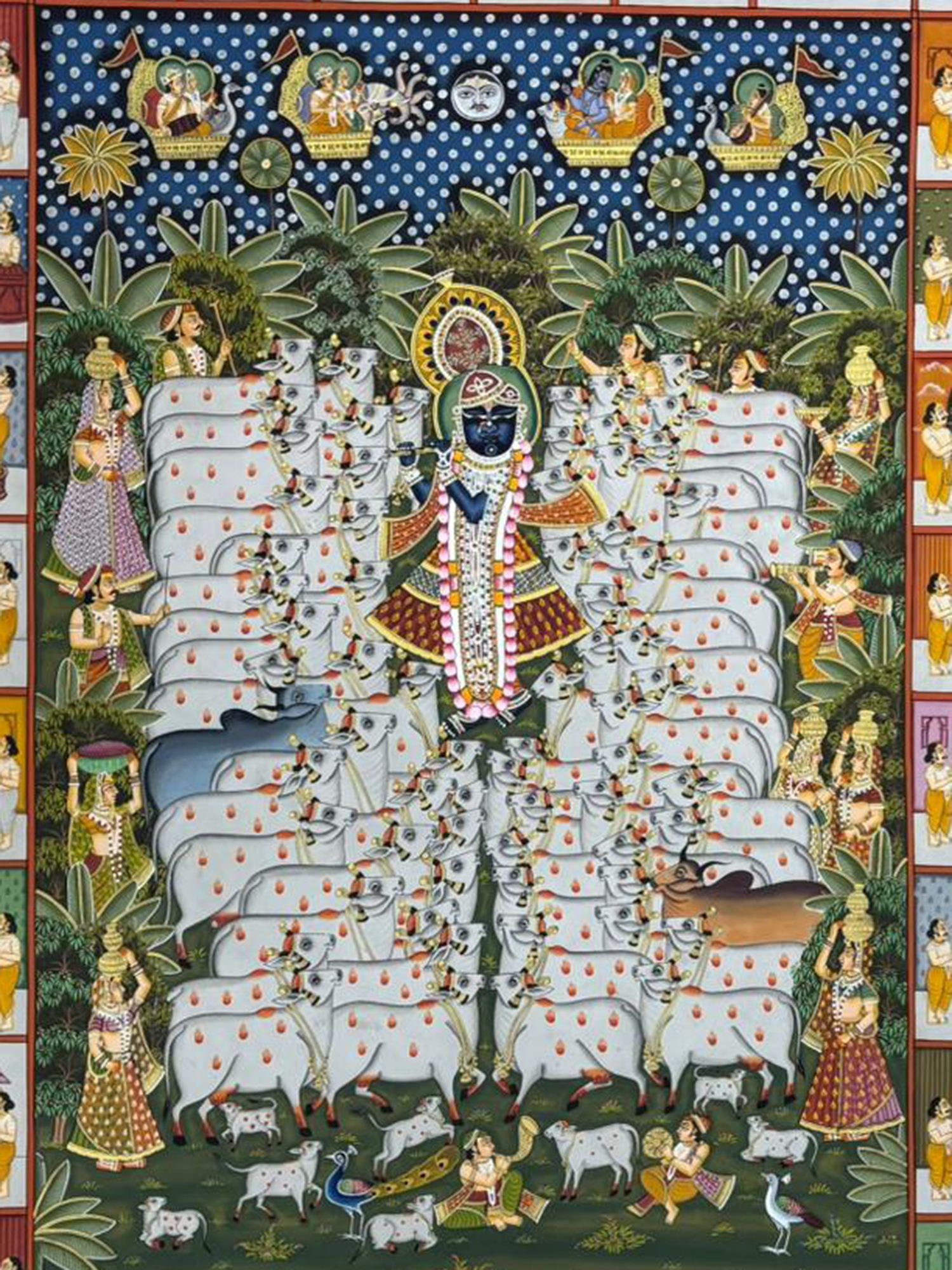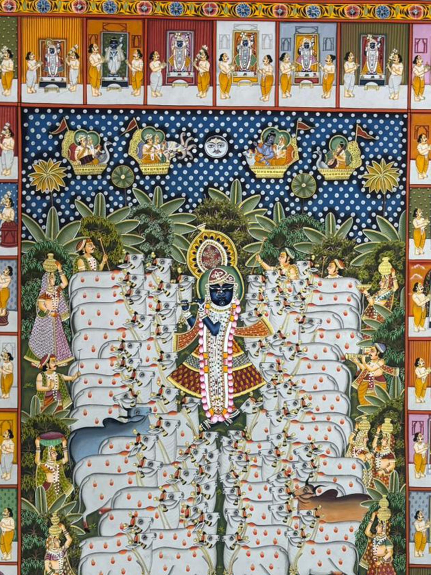 Features a devotional depiction of Shrinathji accompanied by cows and devotees, central to Vaishnavite traditions.
