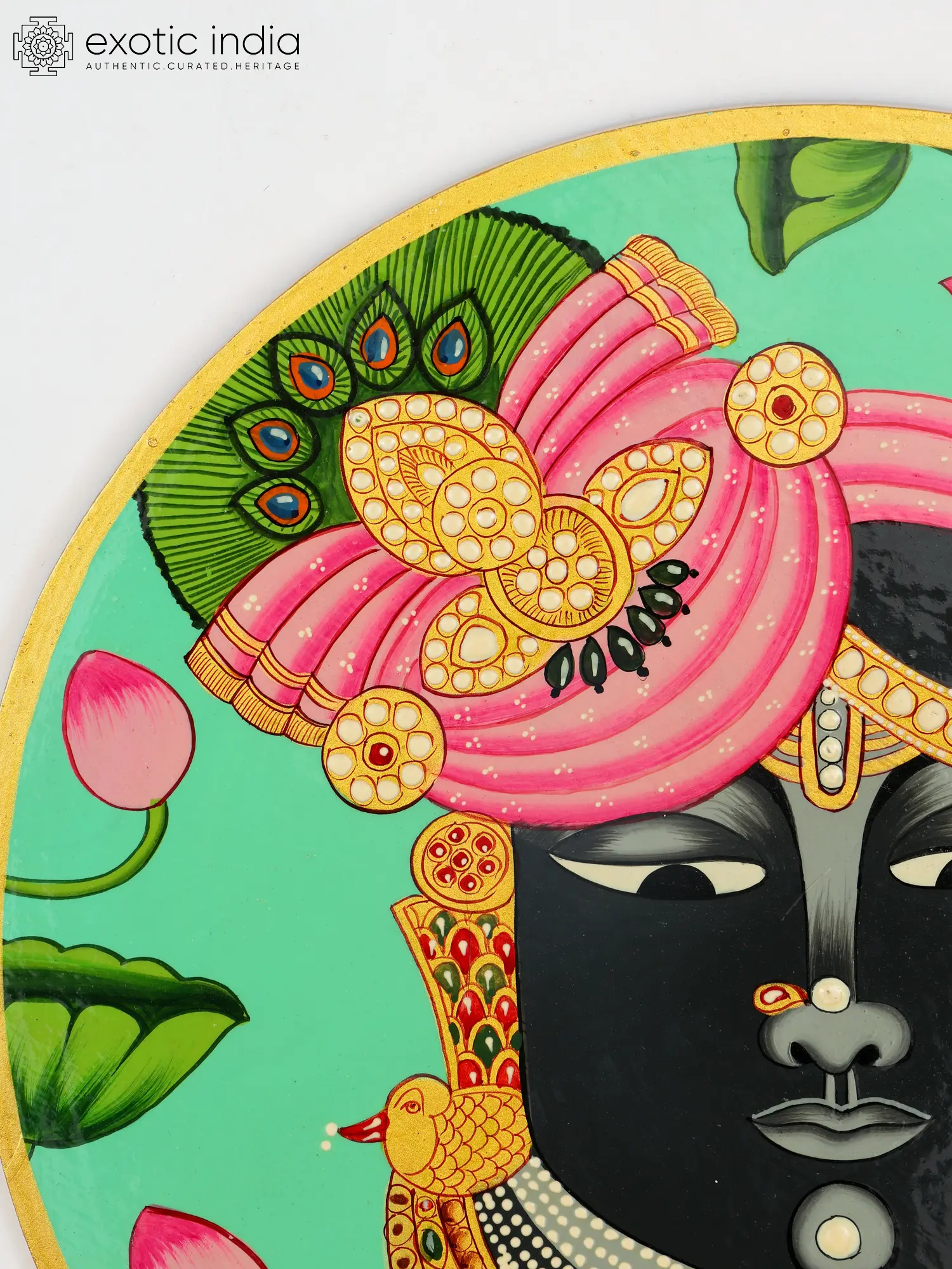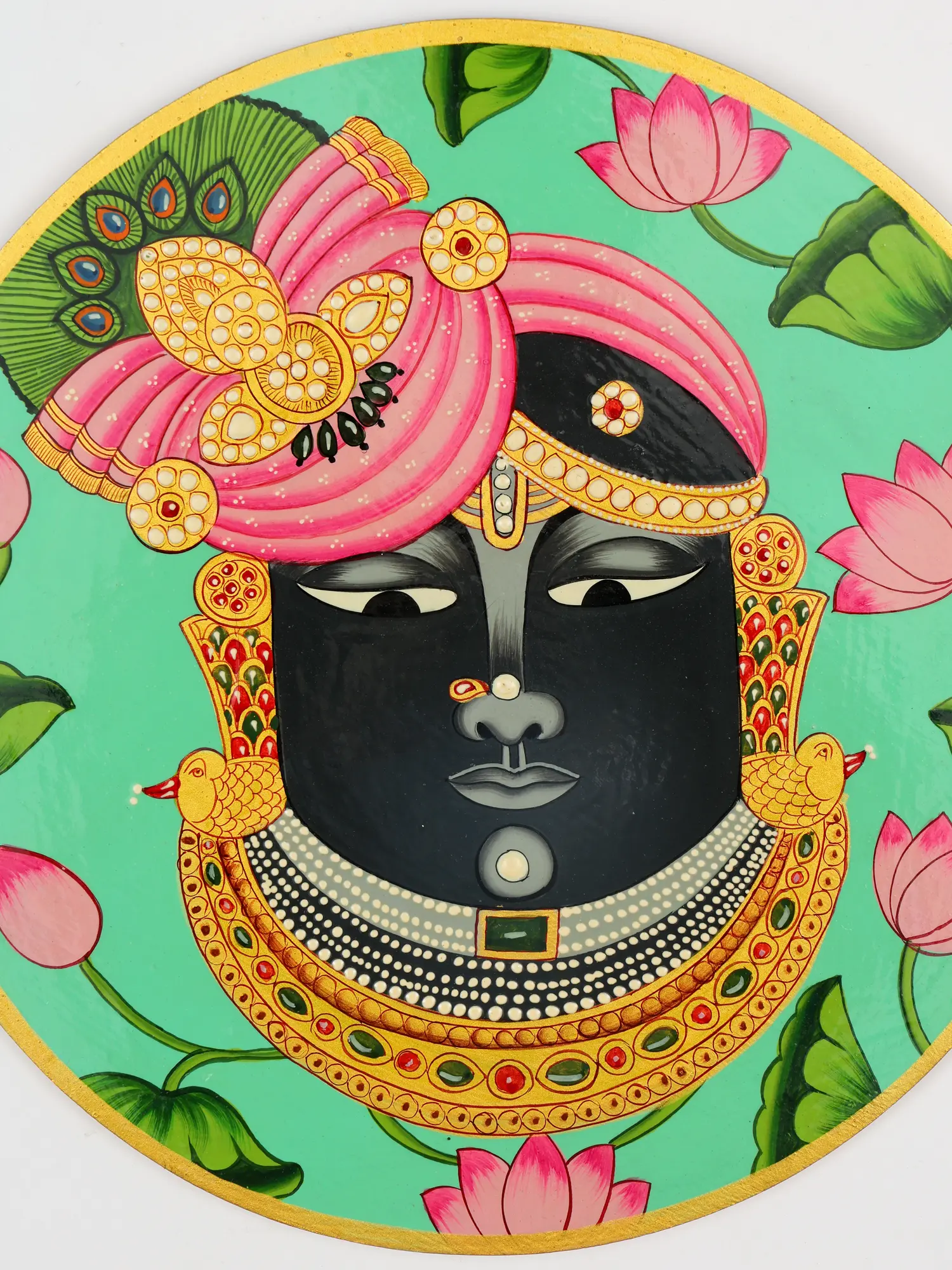 This Shrinathji Face Pichwai Art by Jagriti Bhardwaj encapsulates serene beauty and auspiciousness with its exquisite craftsmanship. Depicting the divine countenance of Shrinathji, a beloved manifestation of Lord Krishna, the artwork radiates spiritual tranquility and devotion.