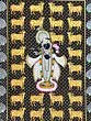 Showcases a surrounding pattern of cows, symbolizing prosperity and devotion.