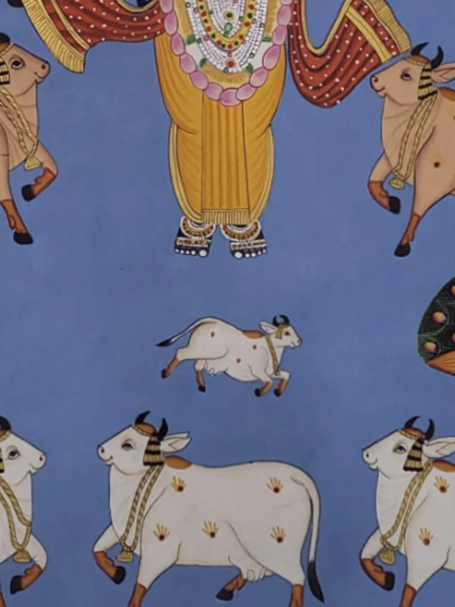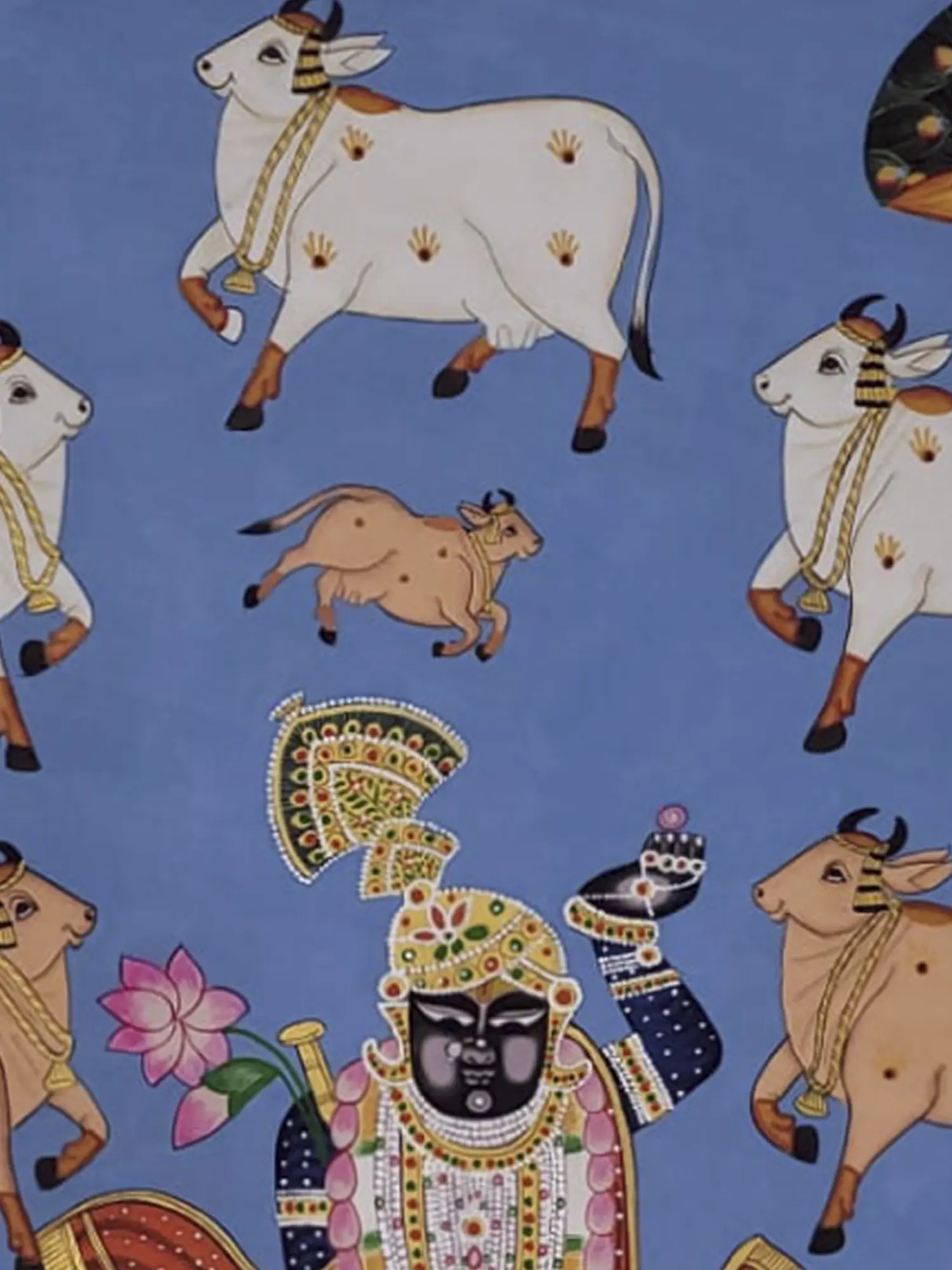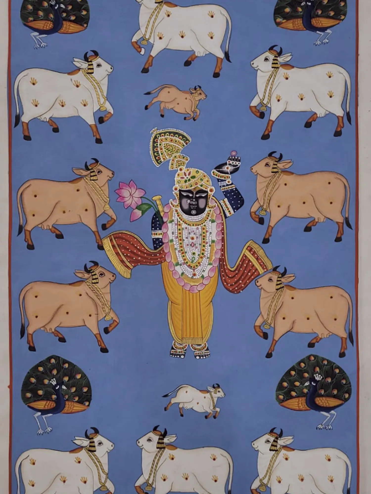 This captivating depiction intertwines the divine presence of Shrinathji with the grace of dancing peacocks, symbolising celestial beauty and devotion. Crafted with natural colours on cloth, the artwork exudes a timeless aura of spiritual reverence. Shrinathji's benevolent countenance radiates divine love, while the dancing peacocks mirror the joyous rhythm of devotion. Each stroke reverberates with the harmonious union of the divine and the earthly, inviting viewers into a sacred realm of transcendence and grace.