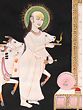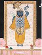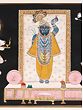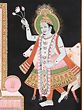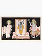 Laid horizontally, this exquisite watercolor painting represents the divine shrine of Srinathji, with Thakurji enlivening the center of the canvas, standing in his dotting childhood roopa, with his glistening blue form wrapped in lovely Pitambara. A pedestal marks the sacred space of Srinathji, who is adorned in a kingly manner and offered a variety of Bhogas laid in front of his Pitha. Mahaprabhuji or Sri Vallabhacharya, who laid down the path of the grace of Pushti Marga, stands on the right side of Srinathji, with a lamp in his hand, offering the daily worship to the Lord, accompanied by Yamunaji on the right, who is holding lotus bunches as a present in the court of Krishna. The Gau-vrinda or cow flock of Srinathji surrounds the deity, bringing a delicate emotion of Sneha toward Gopala, in this splendid representation of the Seva (service) of the Lord of Nathadwara.