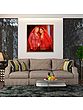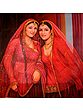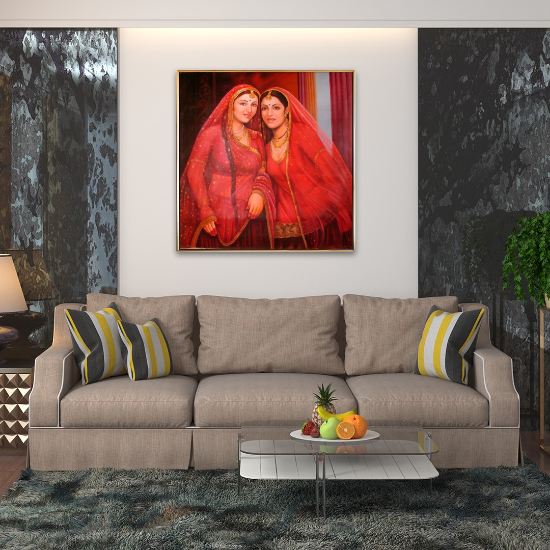Red, the color for love, auspiciousness, Shakti (goddess), and vigor in Indian culture is worn by the sisters from Rajasthan in this oil painting. Standing huddled together against a backdrop which is also of a deep red shade, the sisters wear shimmering Odhani (scarf), blouse, and Ghaghra (skirt) along with traditional jewelry made from gold.