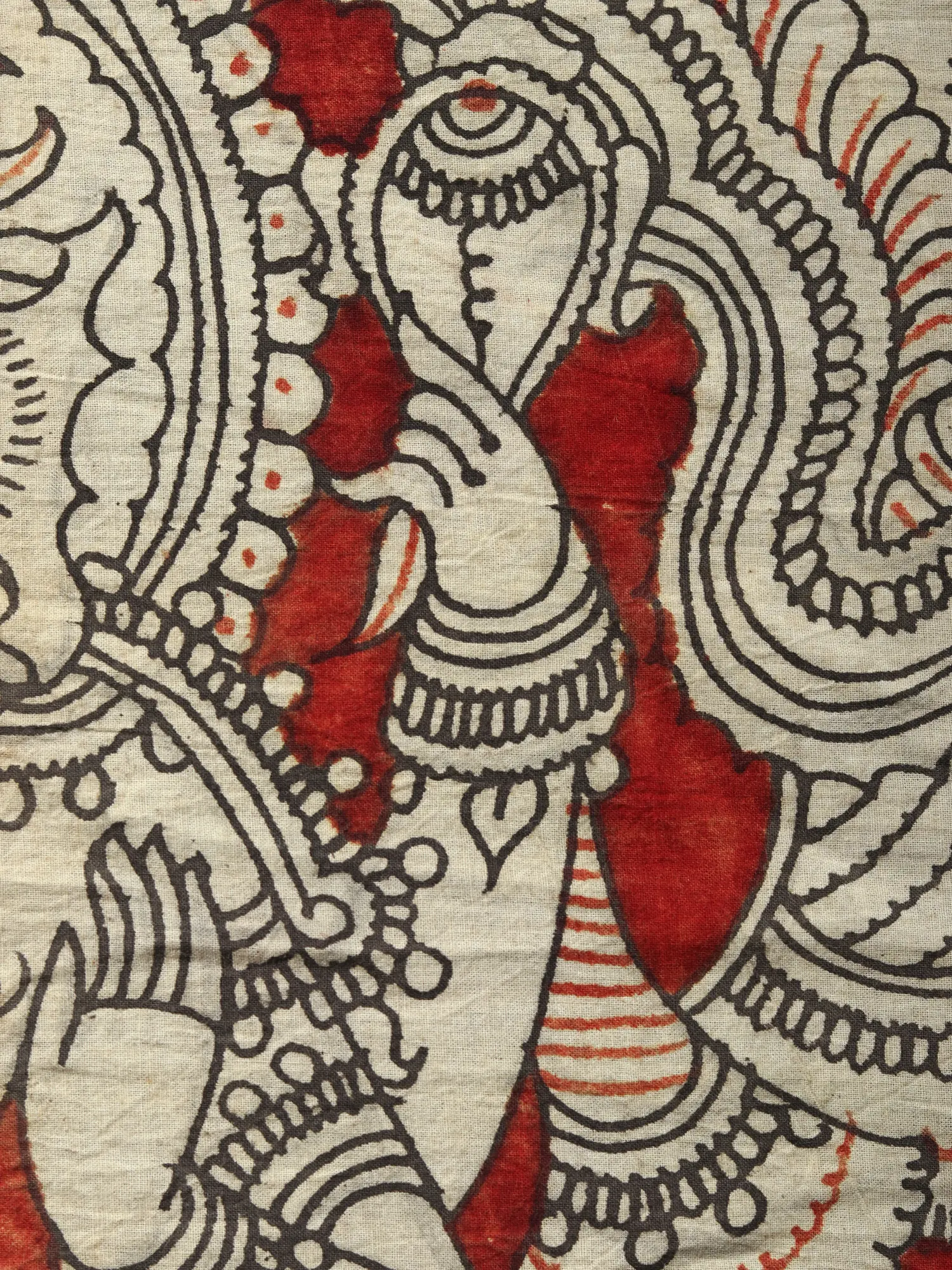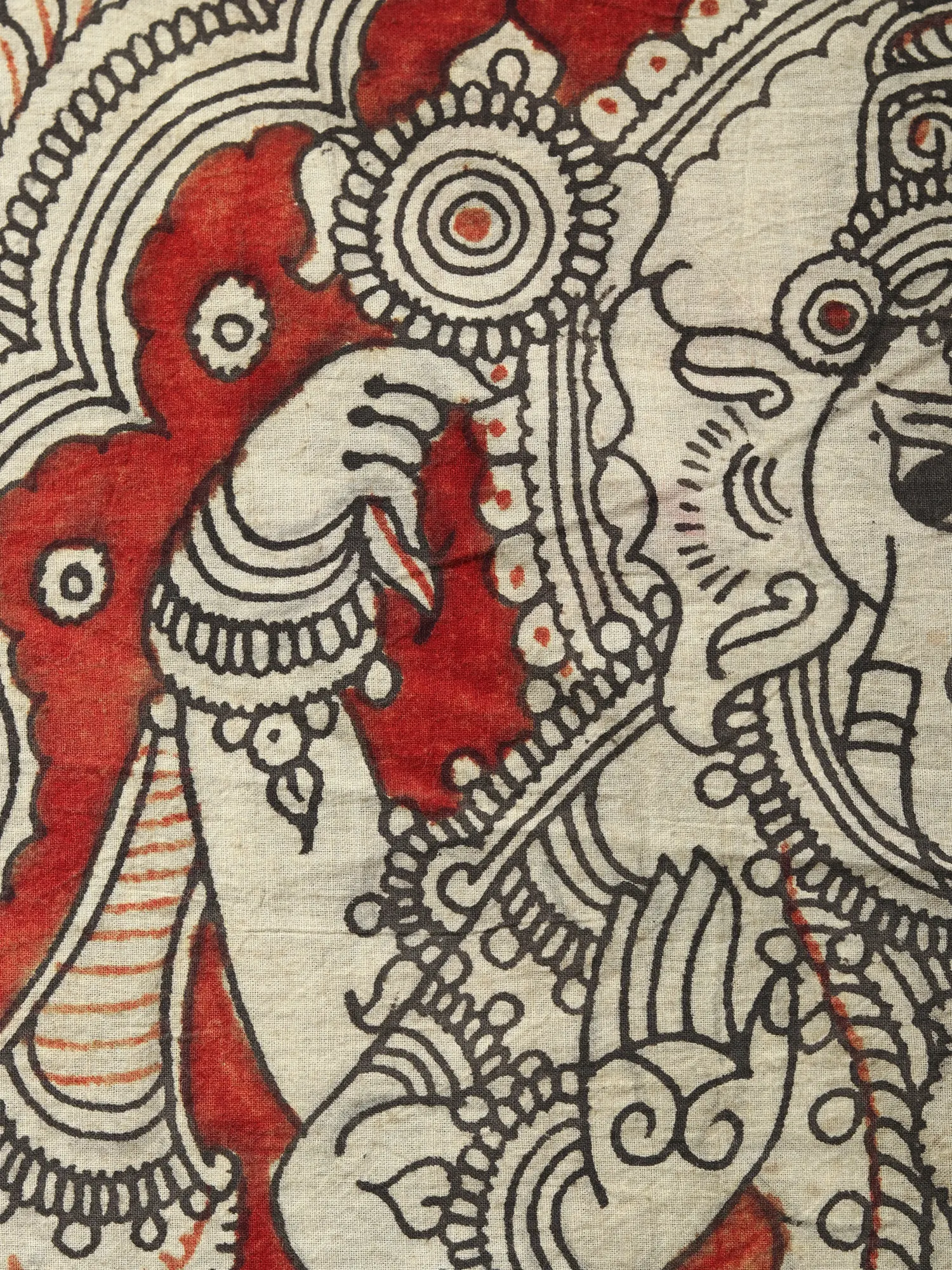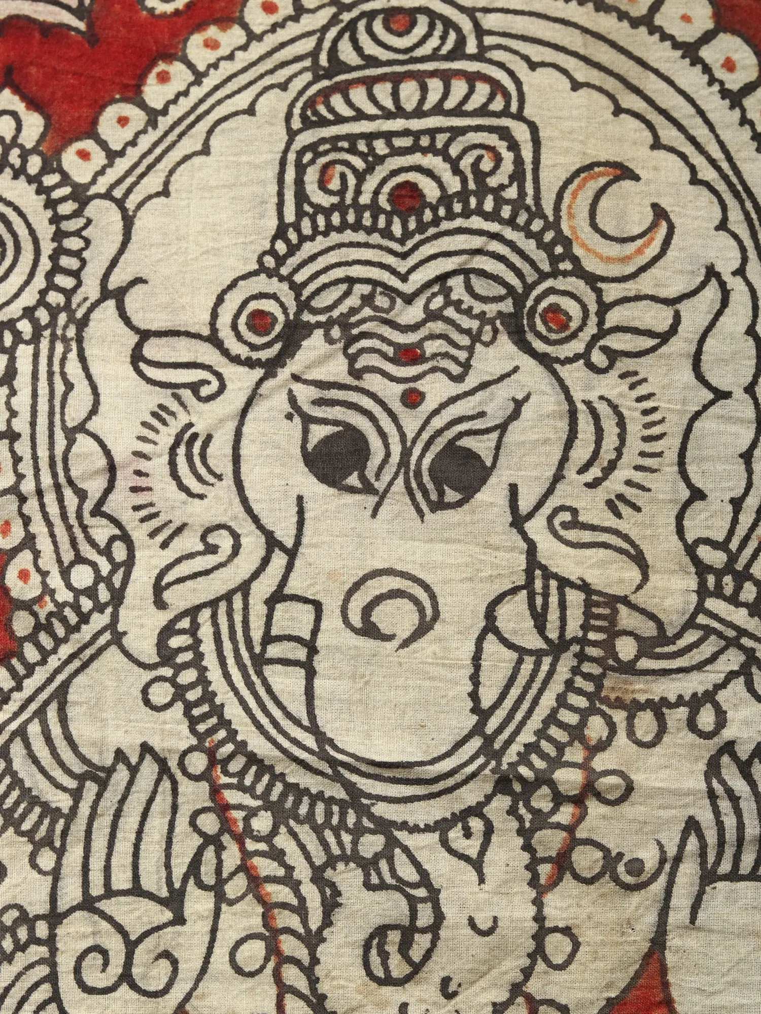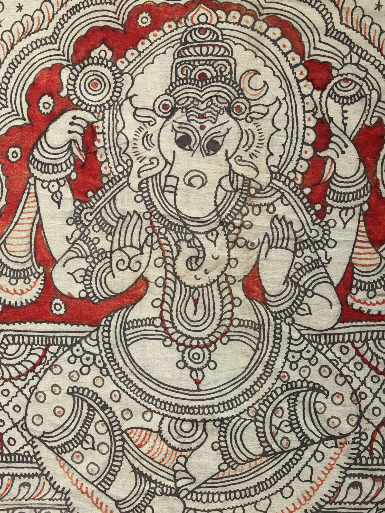 Here Lord Ganesha is shown sitting in the lalitasana posture. The rich, earthy tones and elaborate detailing reflect the meticulous craftsmanship and spiritual depth characteristic of Kalamkari art, making it a visually and culturally significant piece.