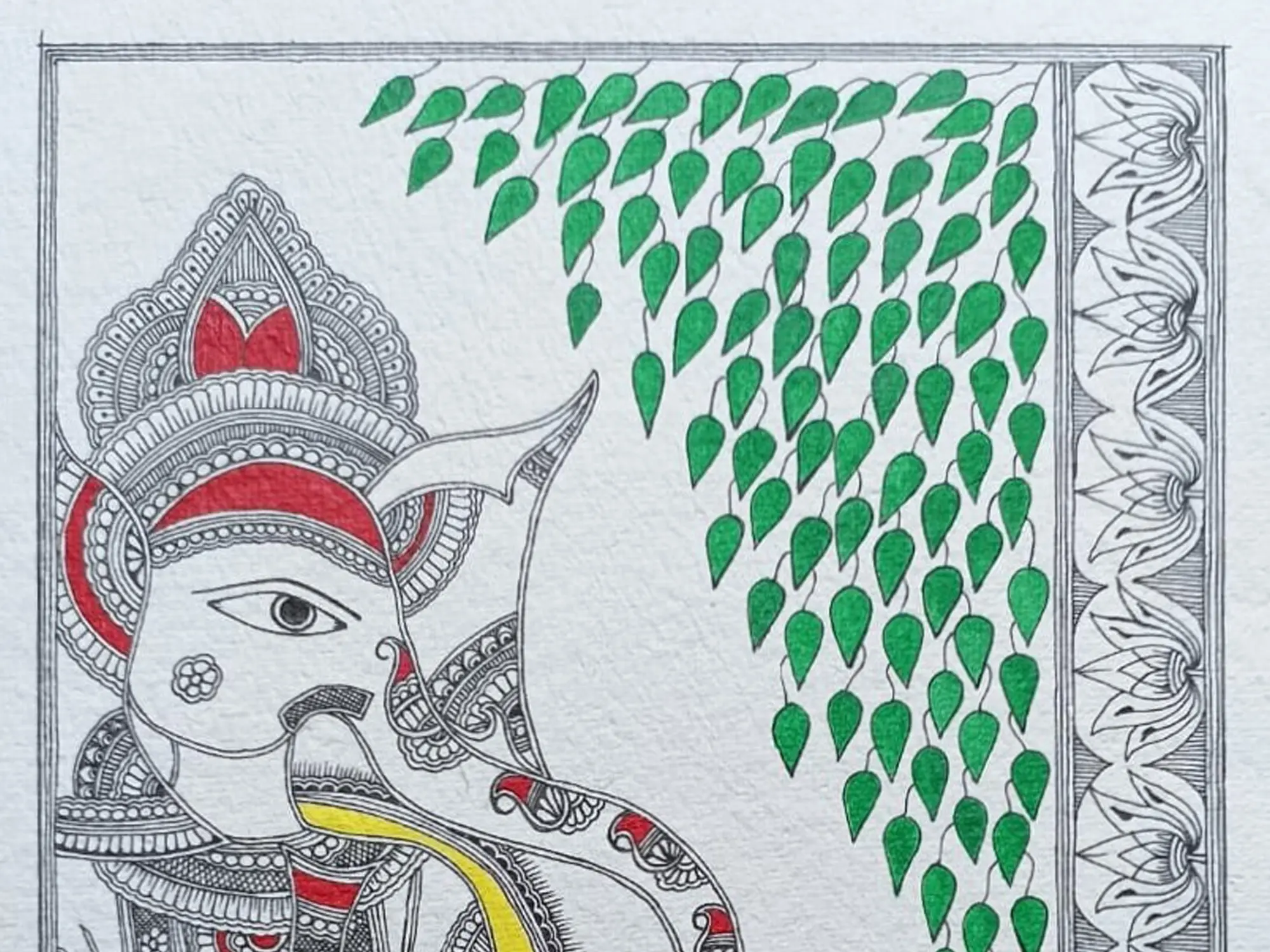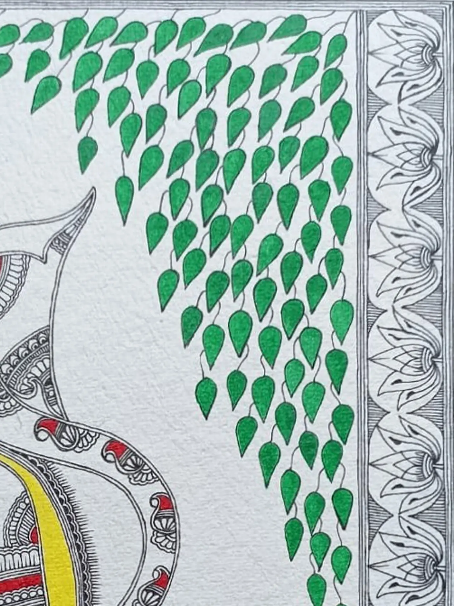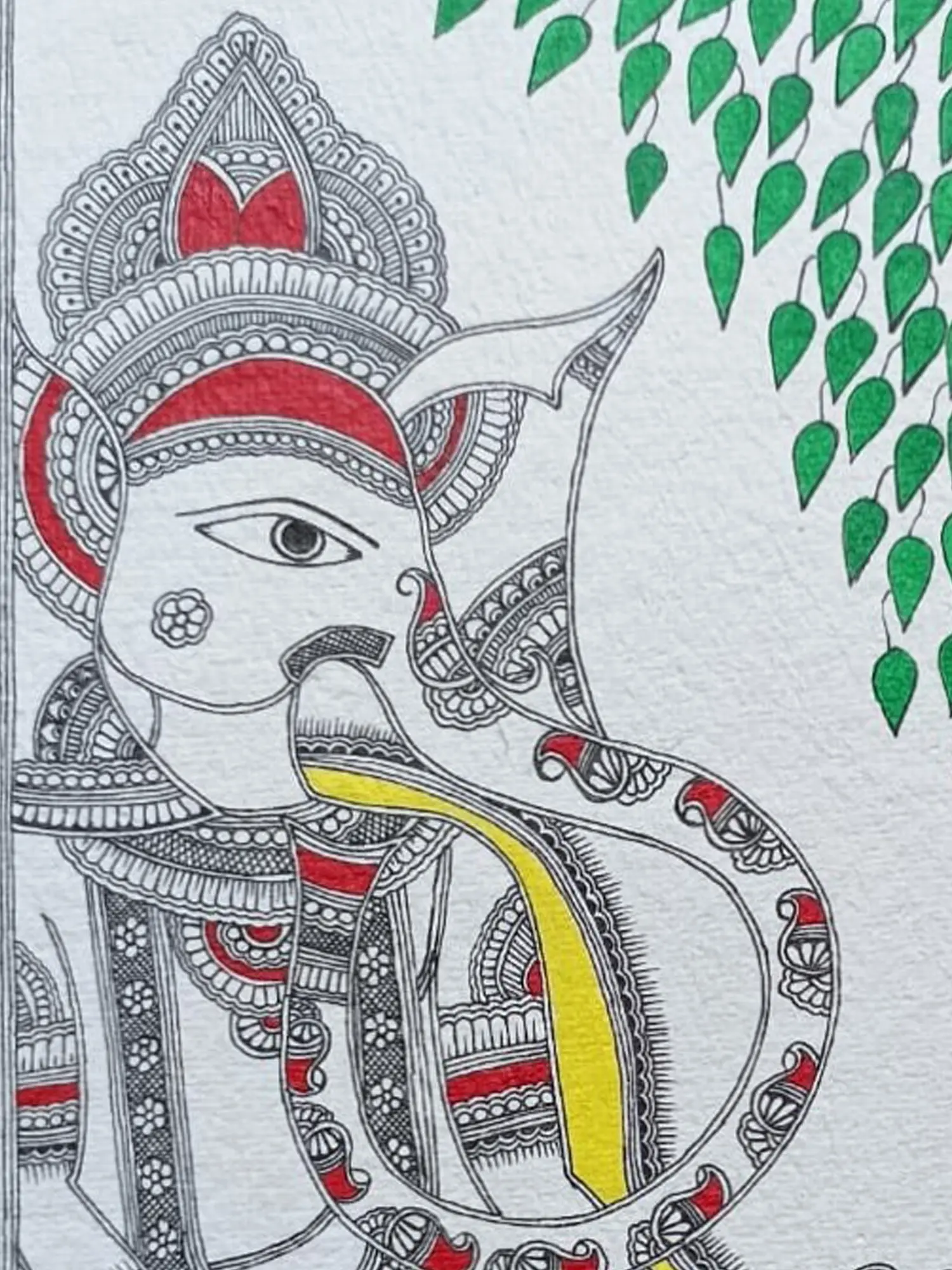 This Madhubani-style painting presents a serene portrayal of Lord Ganesha, with intricate and delicate thin lines forming the divine figure. The minimalistic use of color elegantly fills the clothing and ornaments, emphasizing the beauty within simplicity. The addition of small green leaves in the upper right corner enhances the overall aesthetic, providing balance and natural grace.