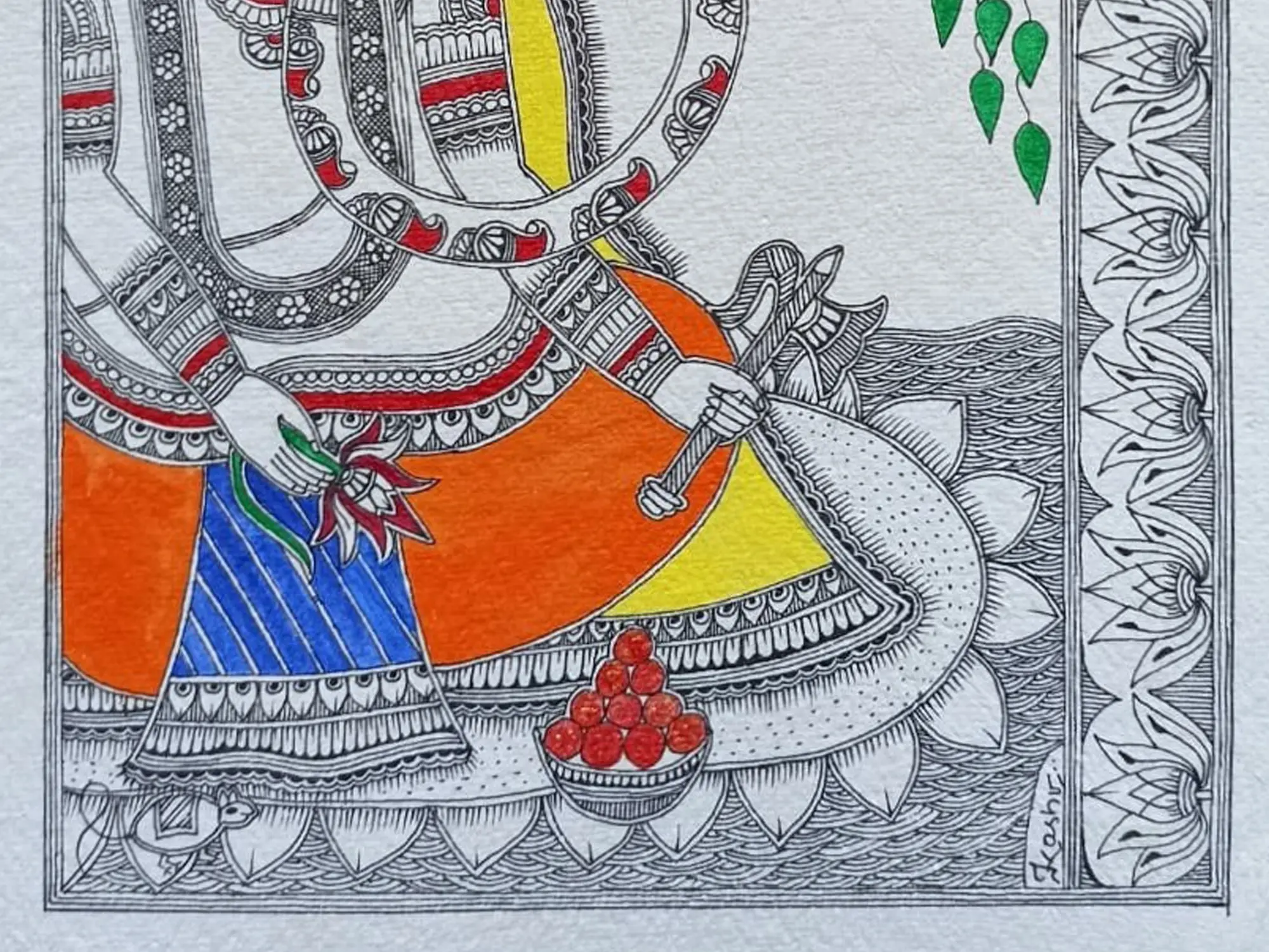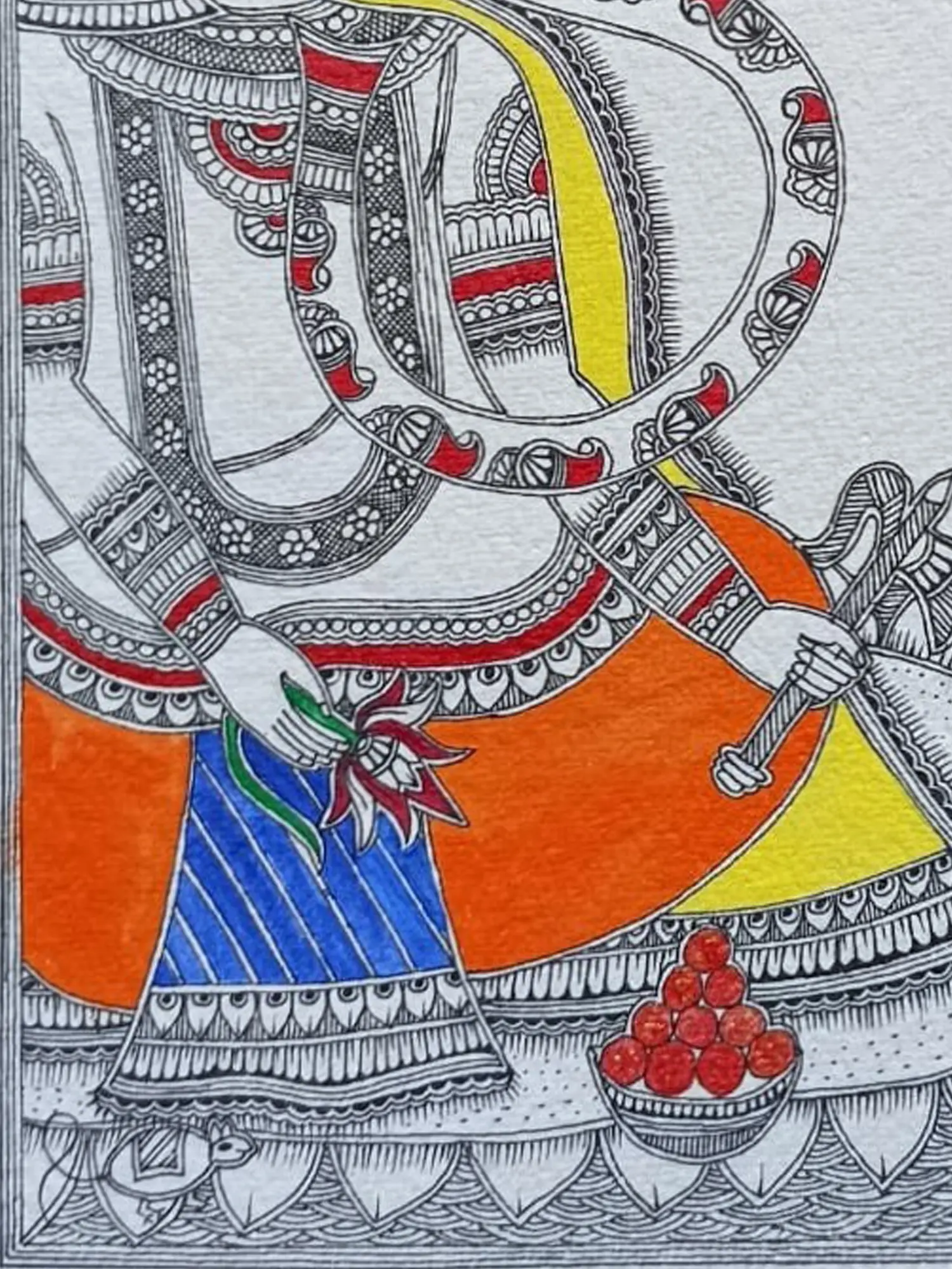 Lotuses on one side of the frame add symbolic significance to the artwork. The artist's mastery lies in the meticulous detailing and fine lines that breathe life into this Madhubani masterpiece, creating a harmonious and contemplative depiction of the revered deity, Lord Ganesha.