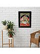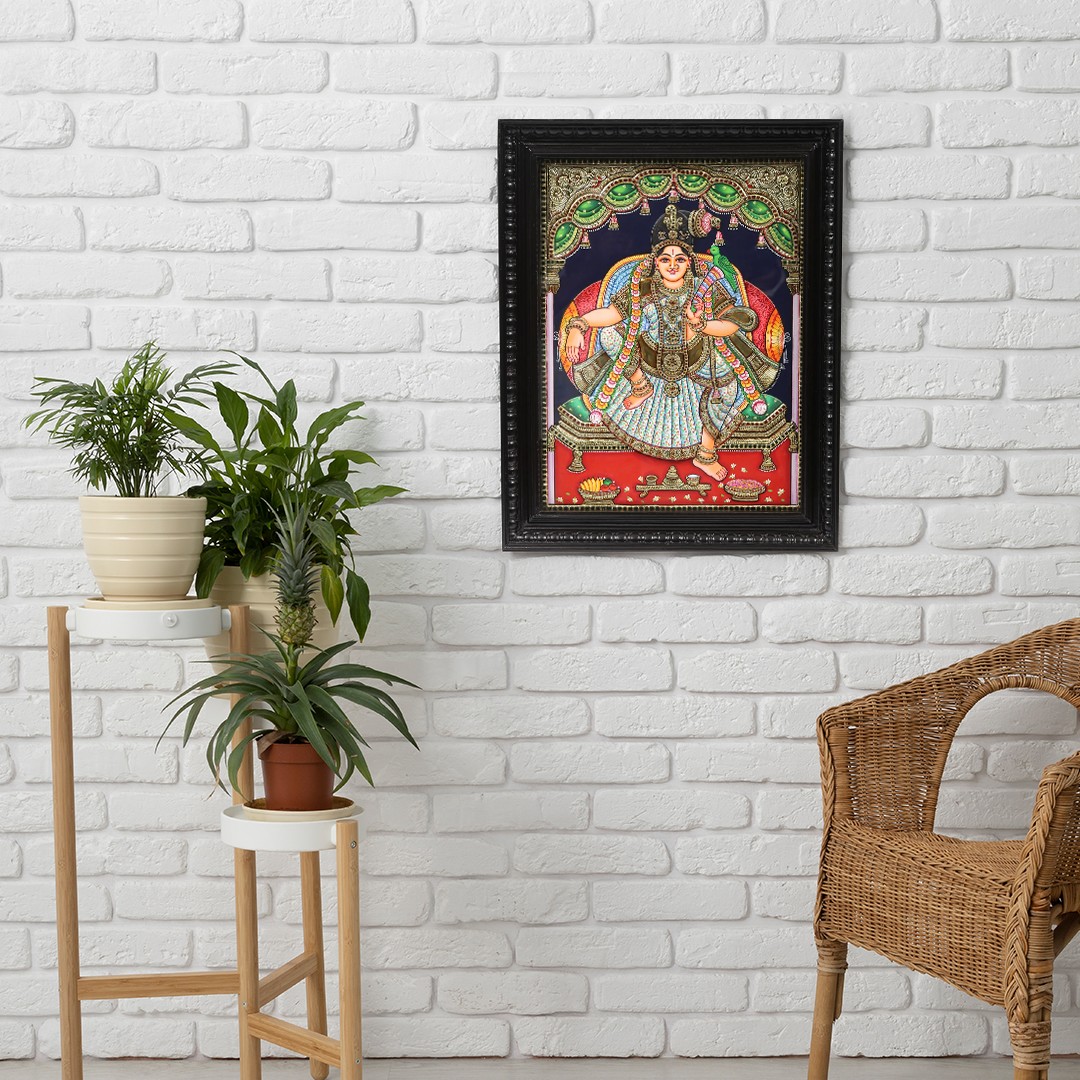 In this Tanjore painting, Andal appears in a regal pose, seated on a royal throne in Maharajalilasana. She is wrapped in white, the color of devotion and purity, and is adorned marvelously with traditional jewelry, along with her quintessential ethnic hairdo, embellished with Sun and Moon ornaments and floral details. The parrot and floral attributes in her hand are characteristic of Andal. The painting is crafted in the manner of classic Thanjavur, with golden layers and red and green gemmed pieces. With an arch framing the image and traditional colors bringing the sanctity of Andal to life, this Tanjore painting is a beautiful remembrance of the divinity of devotion.