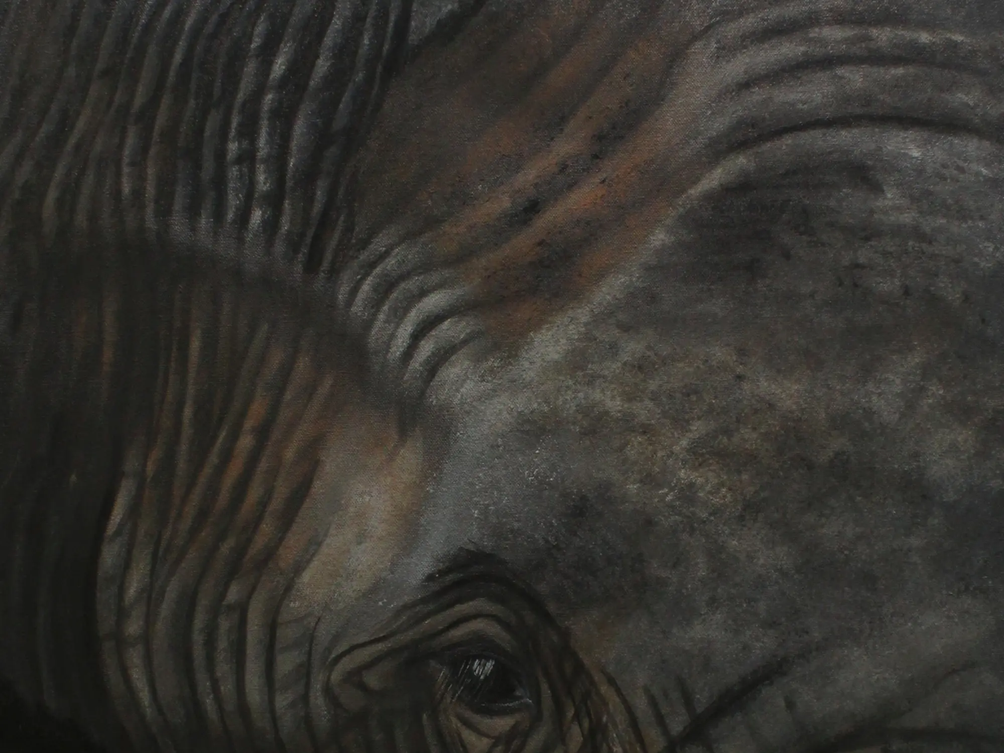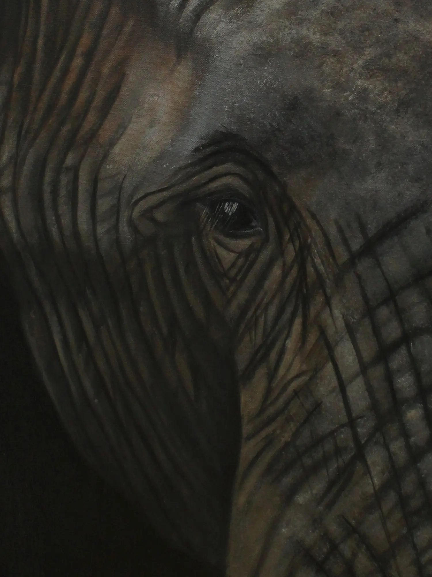 Elephants are a symbol of wisdom, and a listener with big eyes often express their emotions through their eyes. People have mentioned that elephants have the most innocent and beautiful eyes. This painting titled "Solemn Being" by Karthik, oil on canvas dedicated to the marvelous animal and its poetic eyes. Capturing just one feature of the super large animal this painting focuses on the emotions that this single eye emotes. With a meticulous focus on the intricate lines of its face, the painter wants to direct the attention of the beholder toward the battles that this elephant has fought. This artwork also captures the emotional depth and resilience of these majestic creatures and reflects upon the grace they embody in their presence.