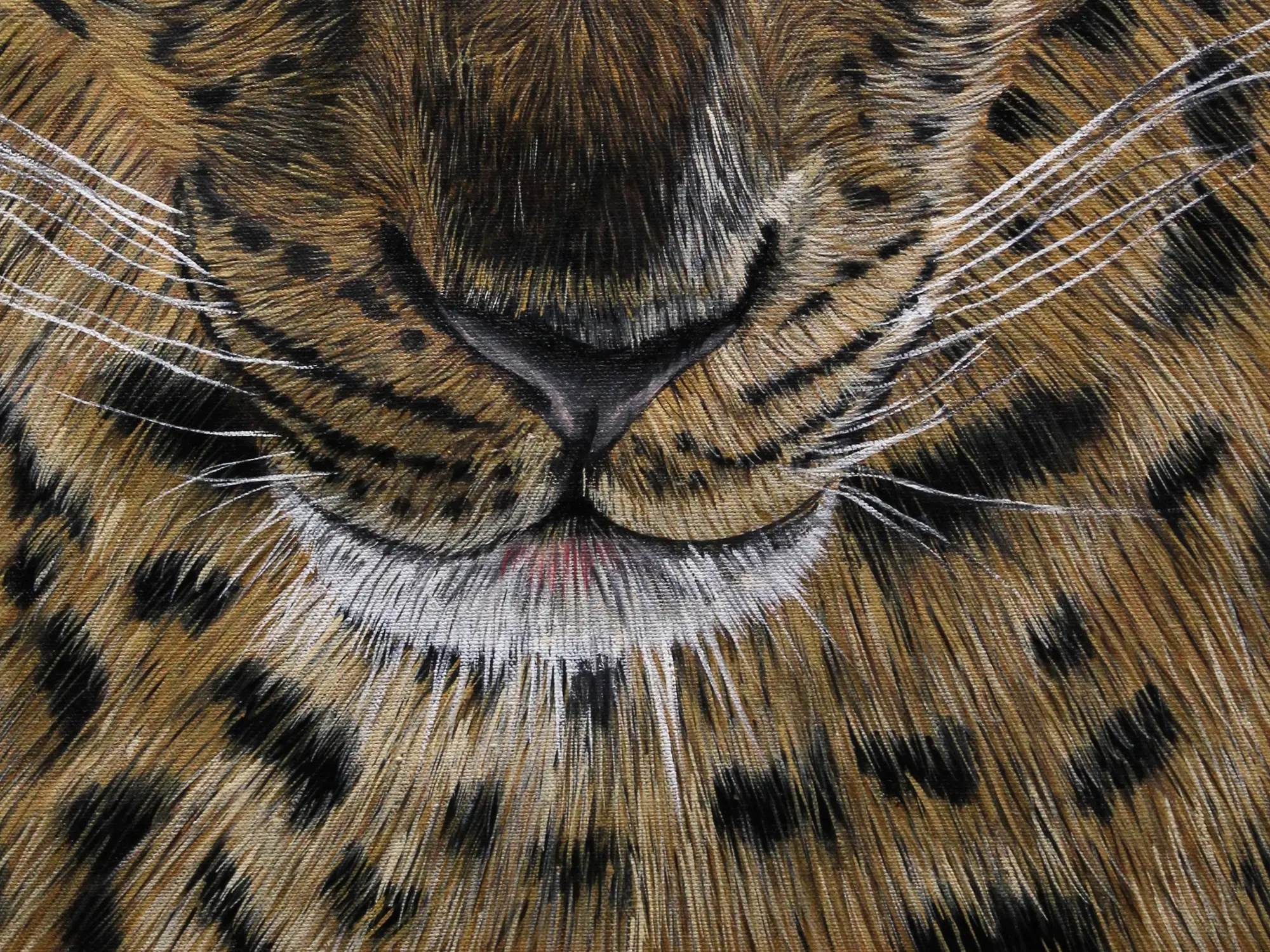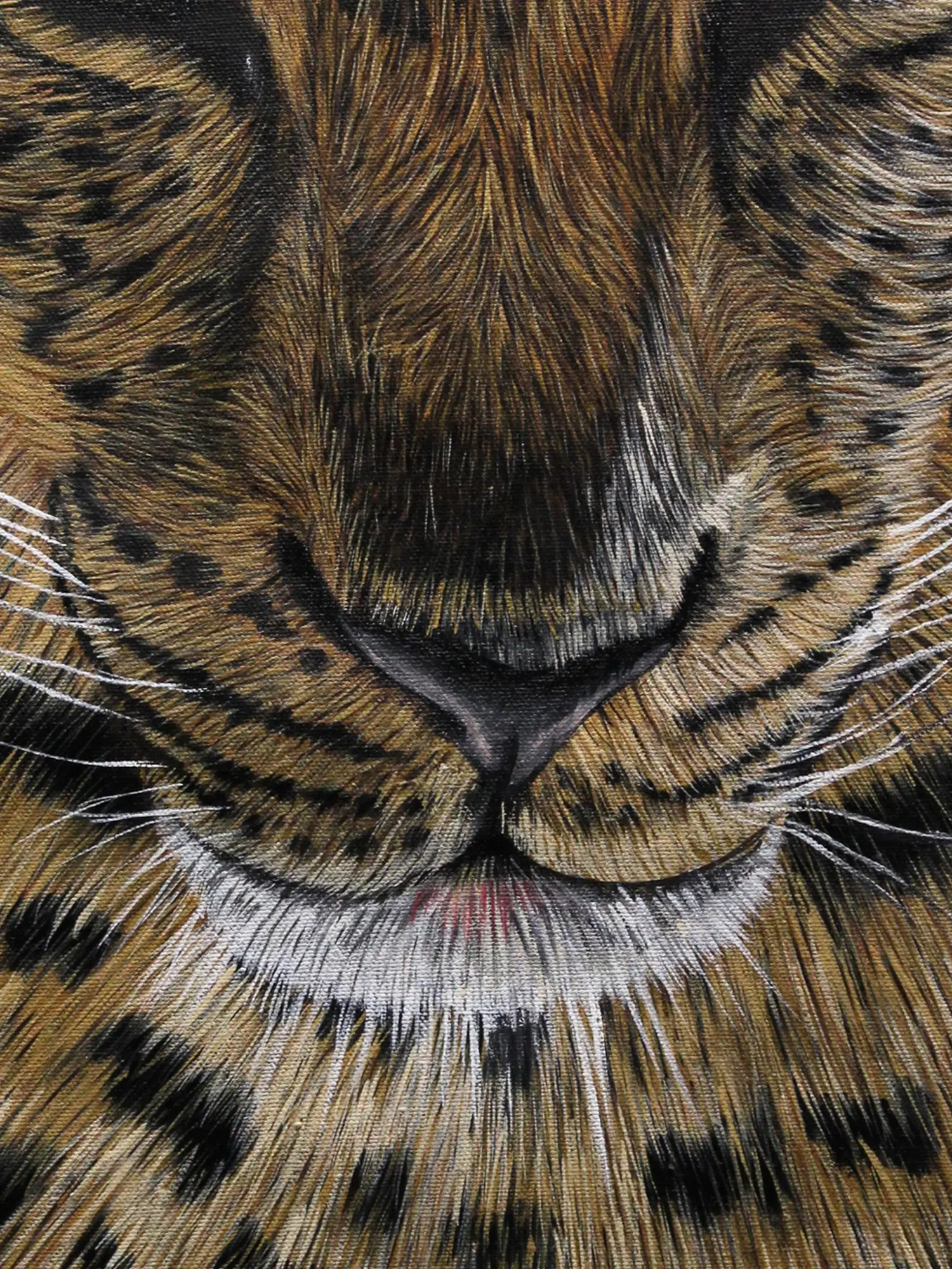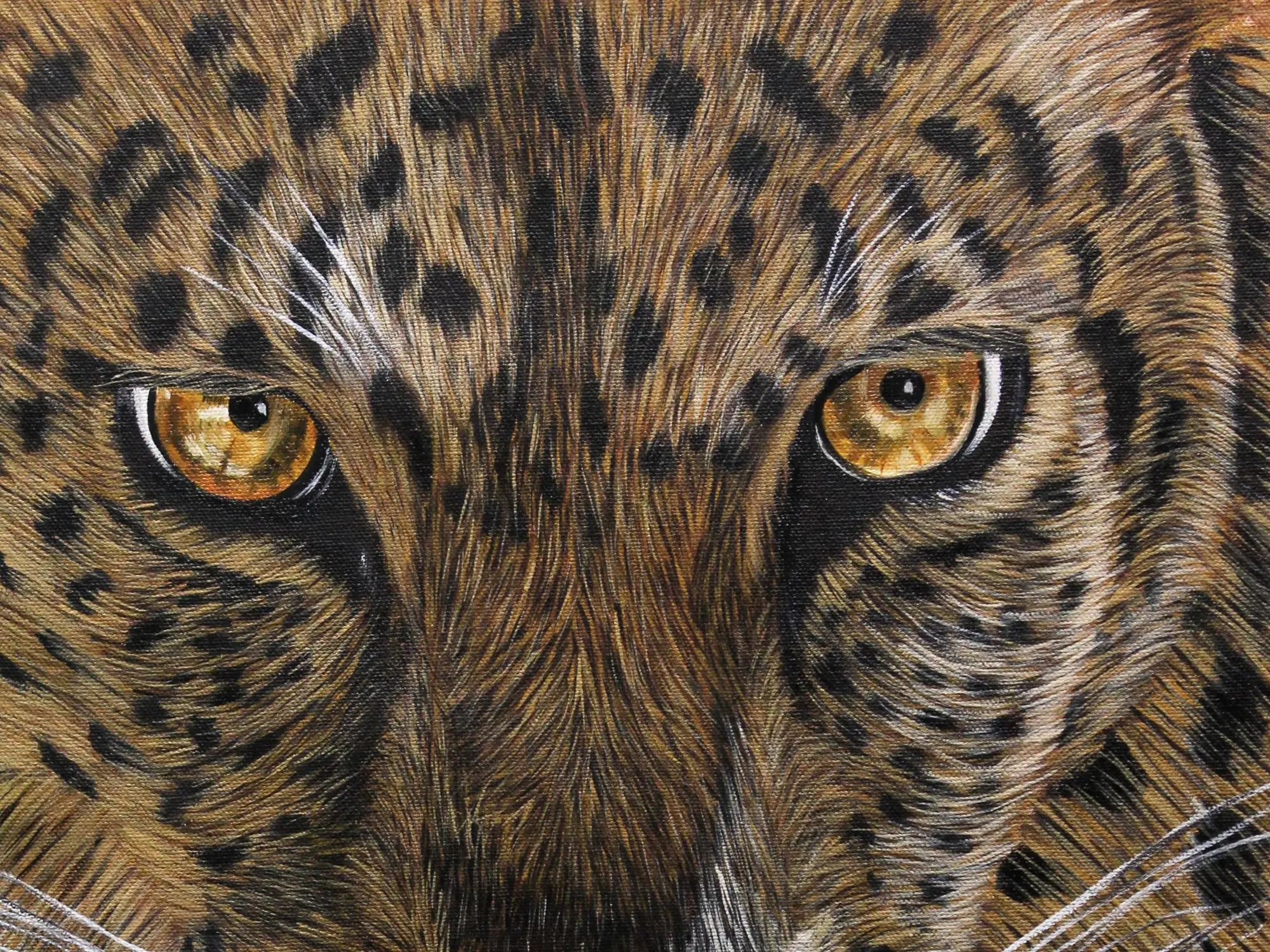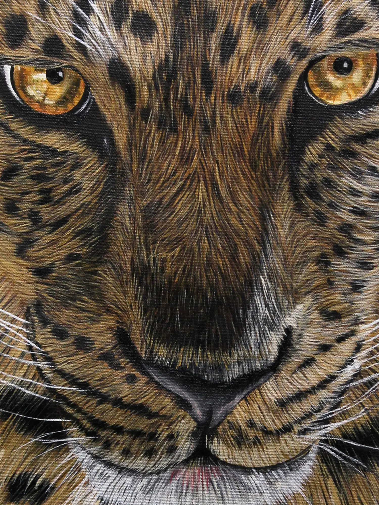 The most skilled hunter and a magnificent animal, the Leopard is always considered the synonym for determination and success. In ancient times having leopard skin as a wall hanging at home would be considered a matter of pride. This "Speaking Eyes - Leopard" painting by Karthik, an oil on canvas masterpiece, is a dedication to the majestic image of a Leopard. The artist has attempted to capture the fire in the eyes of the Leopard, the wrinkles on the face are depicted with precision to depict the determination.