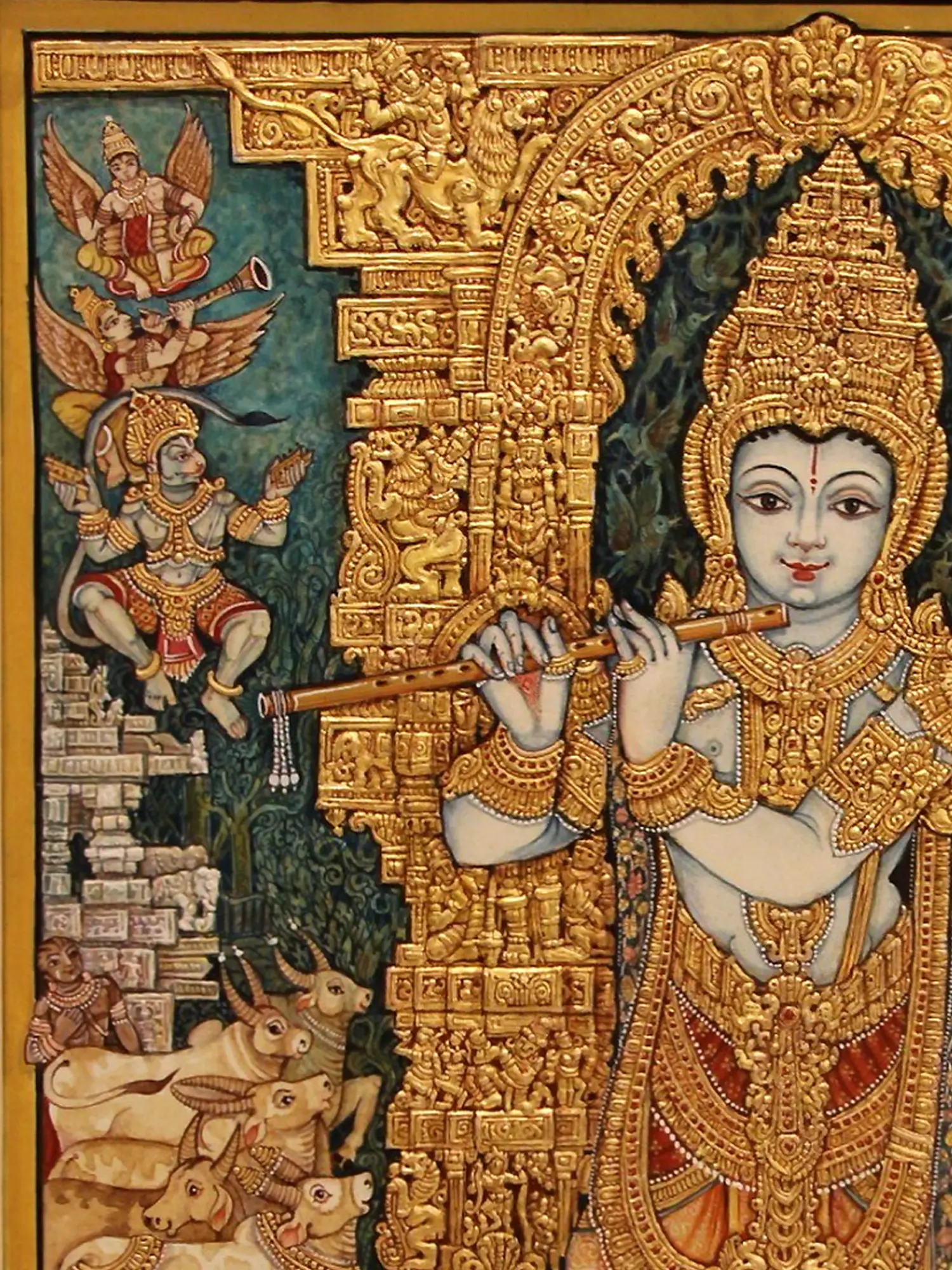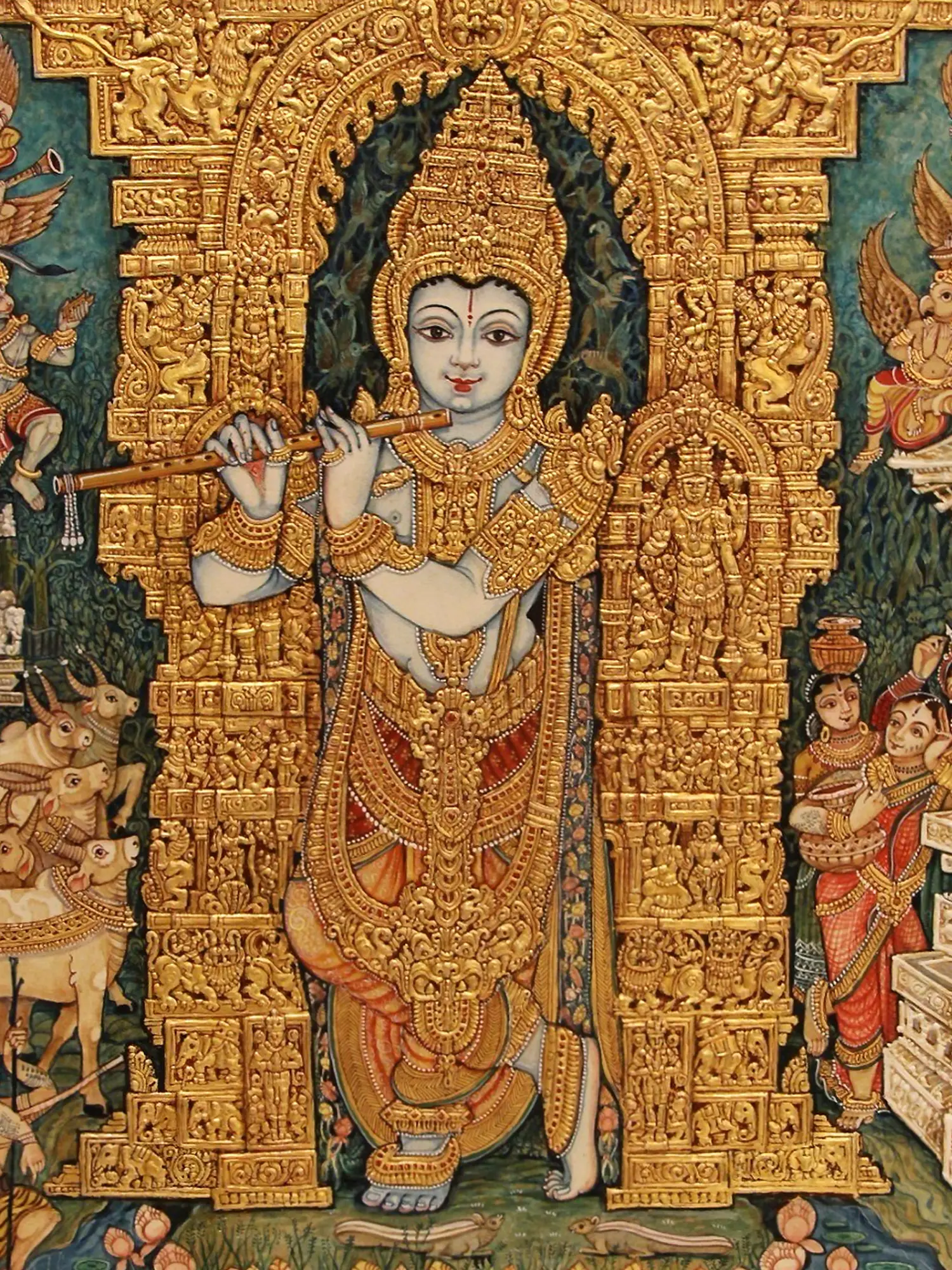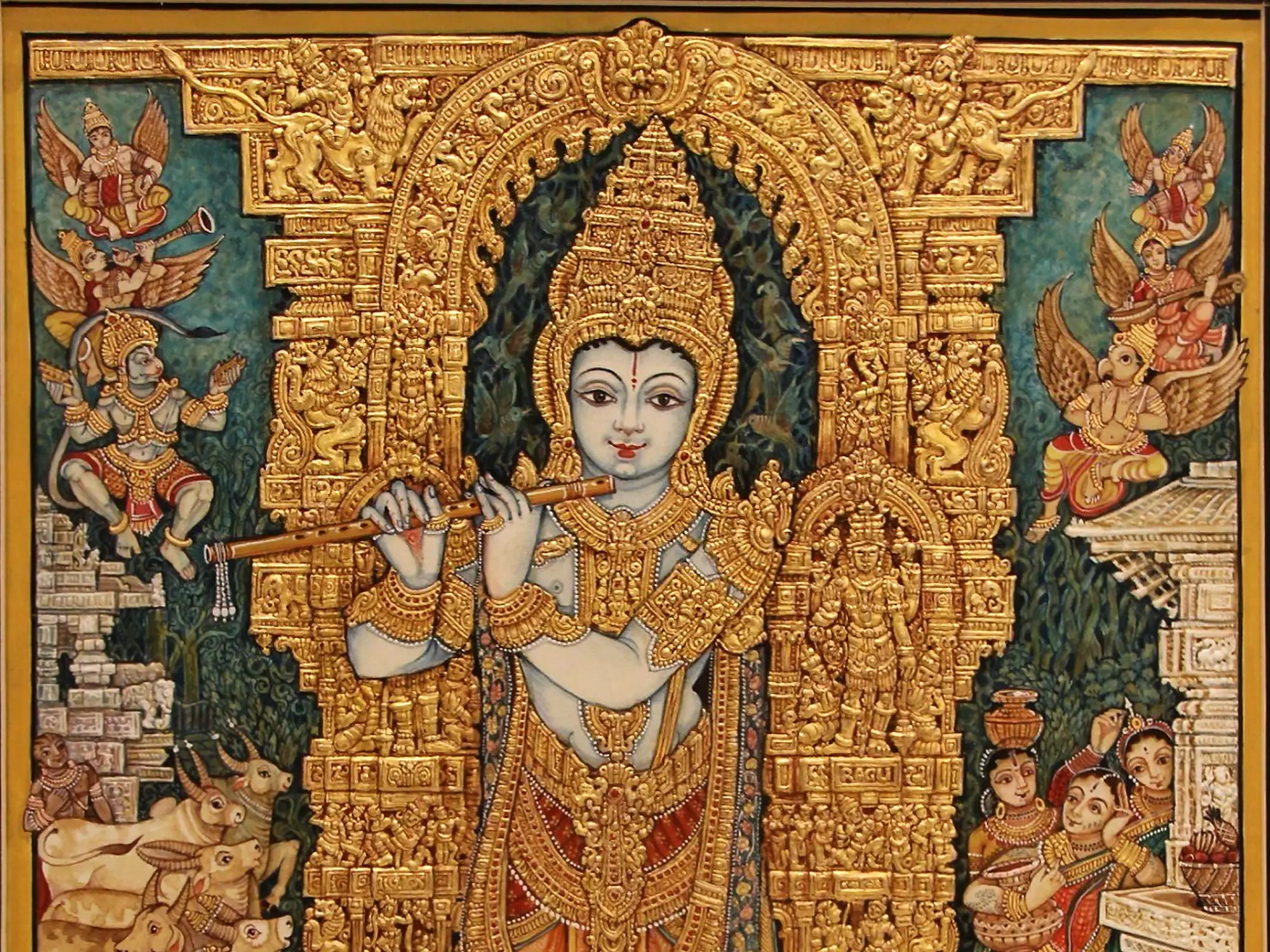 Fluting Bal Gopal Krishna with Cows | Mysore Traditional Painting | With Frame