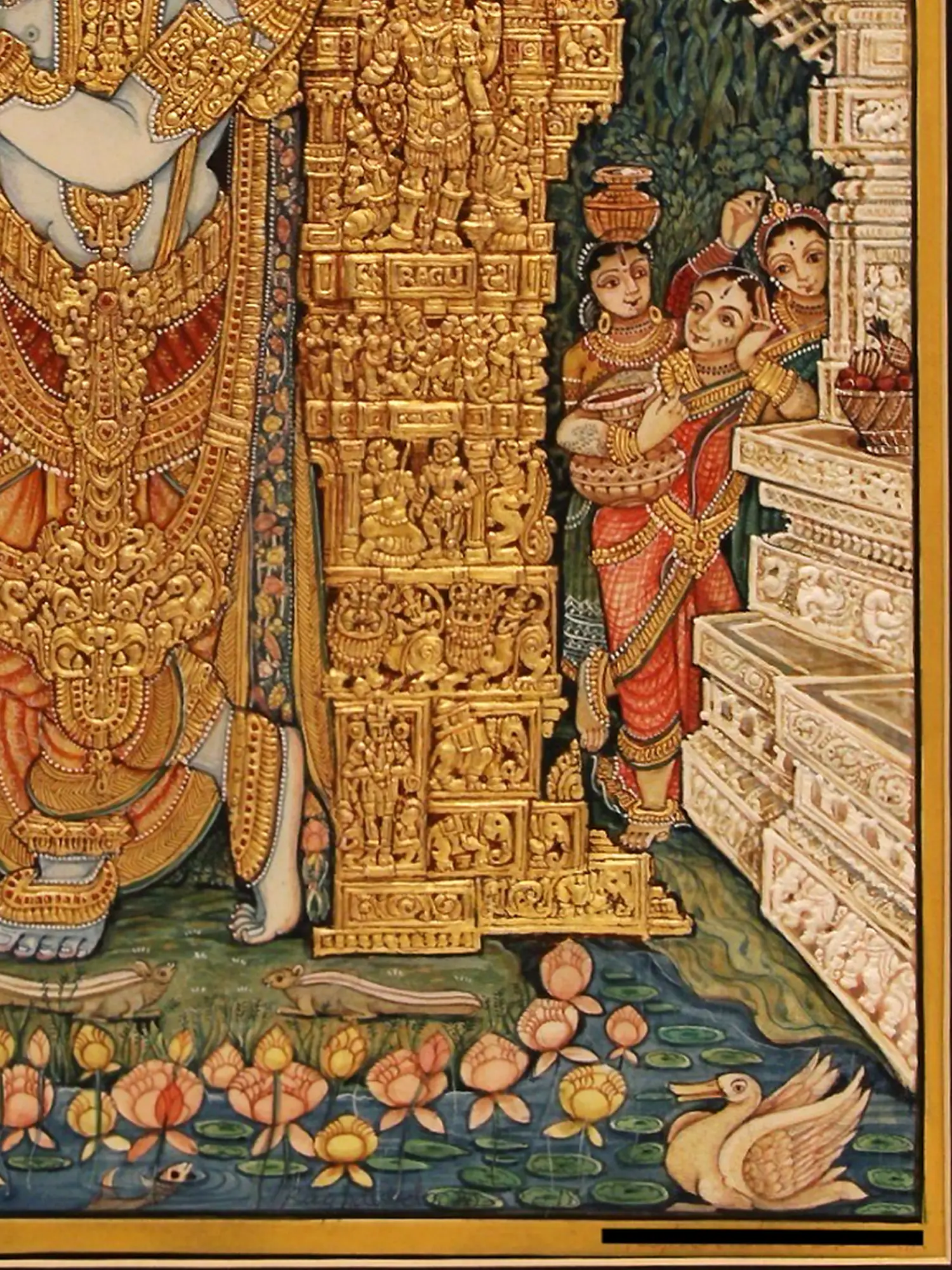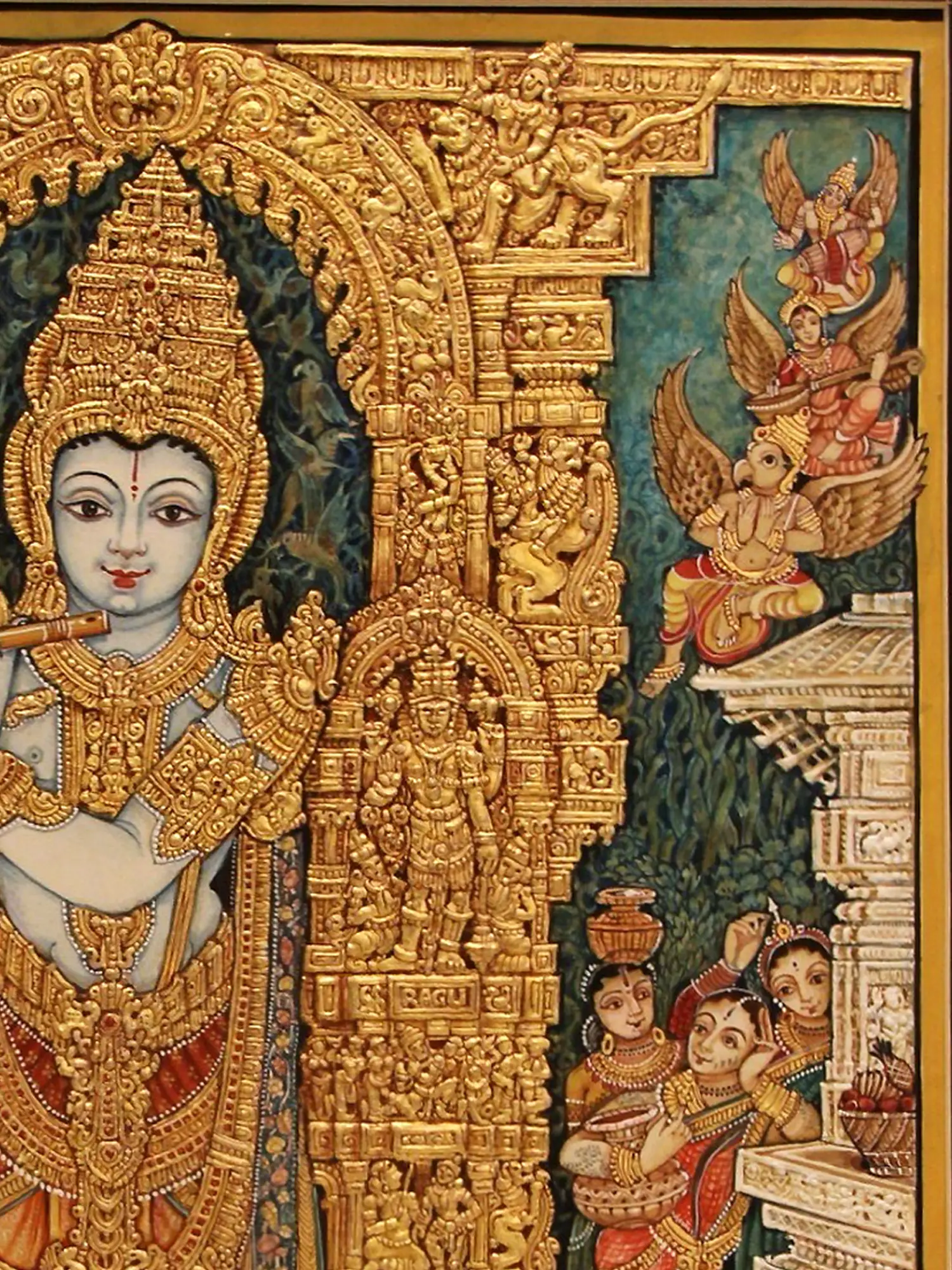 Each stroke and embellishment is a testament to the dedication of skilled artisans who have preserved a time-honored tradition. Crafted using traditional colors and accented with genuine gold foil, this piece showcases exceptional attention to detail. The meticulous layering and texturing reveal a deep understanding of form and reverence for the subject.