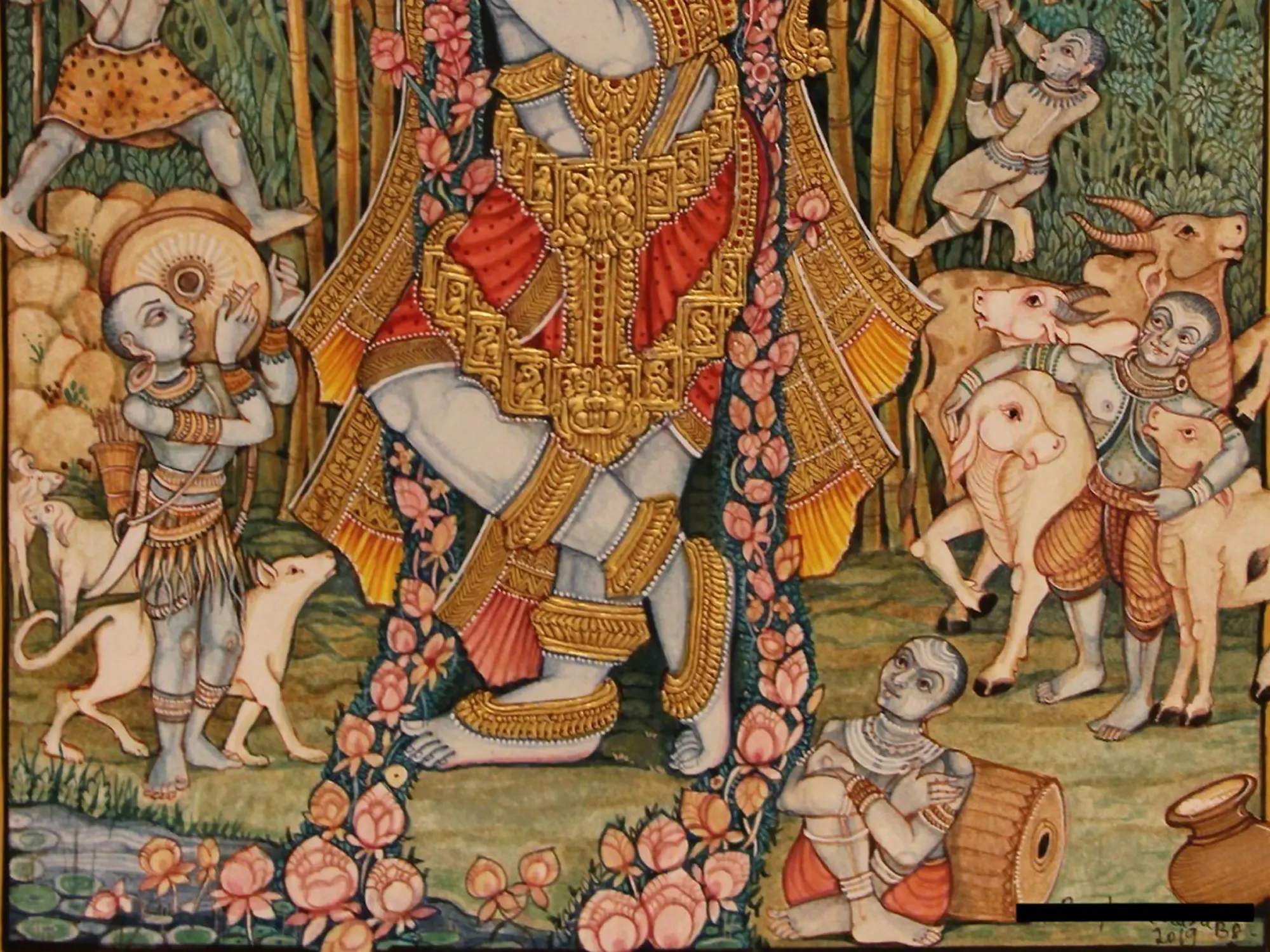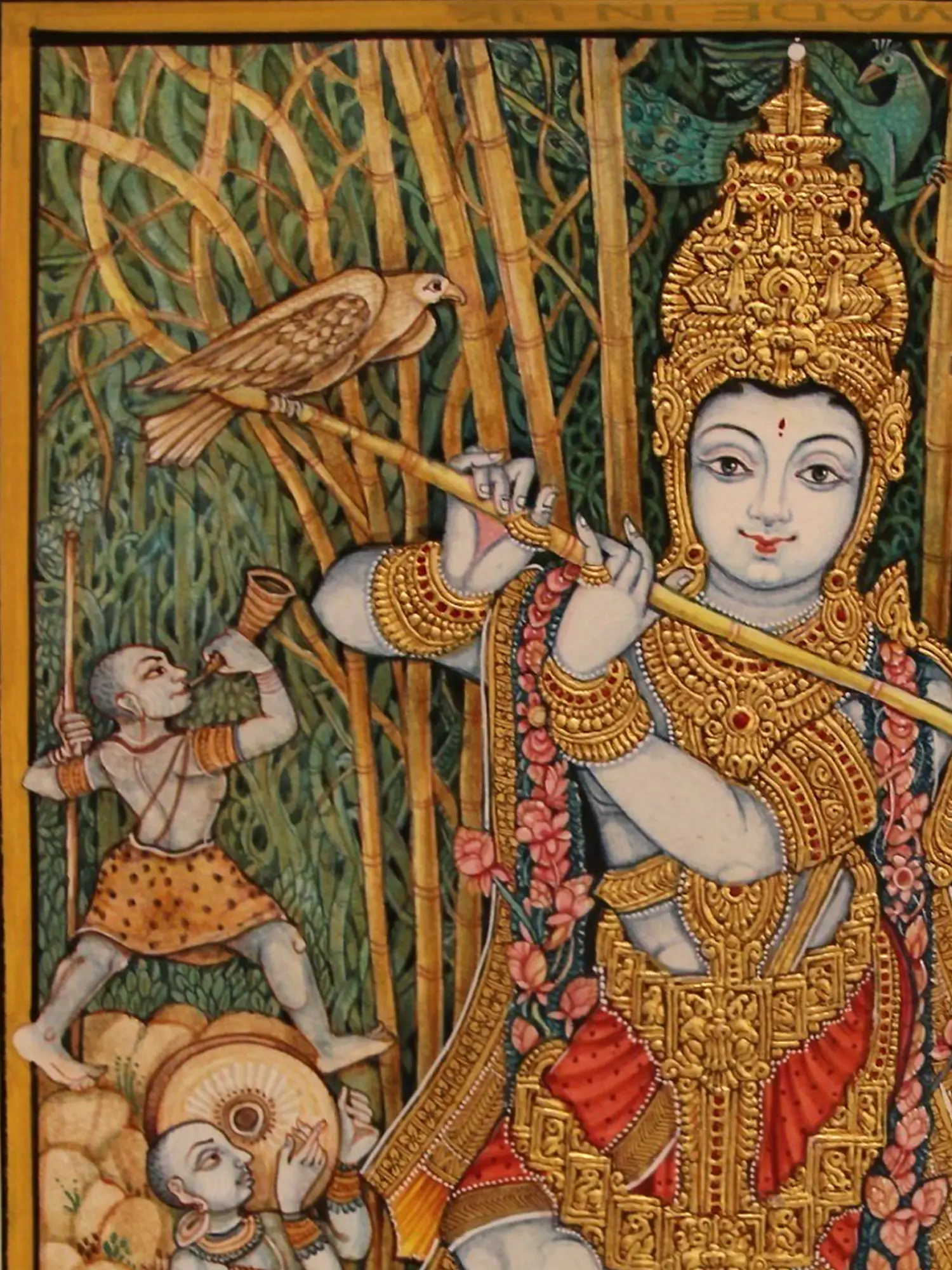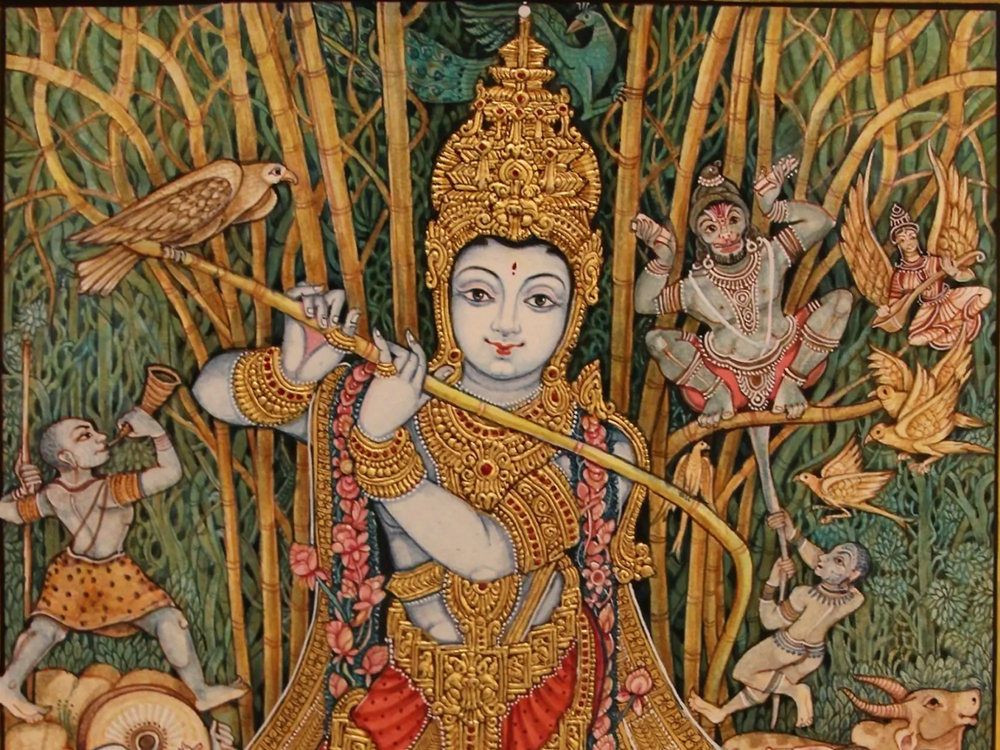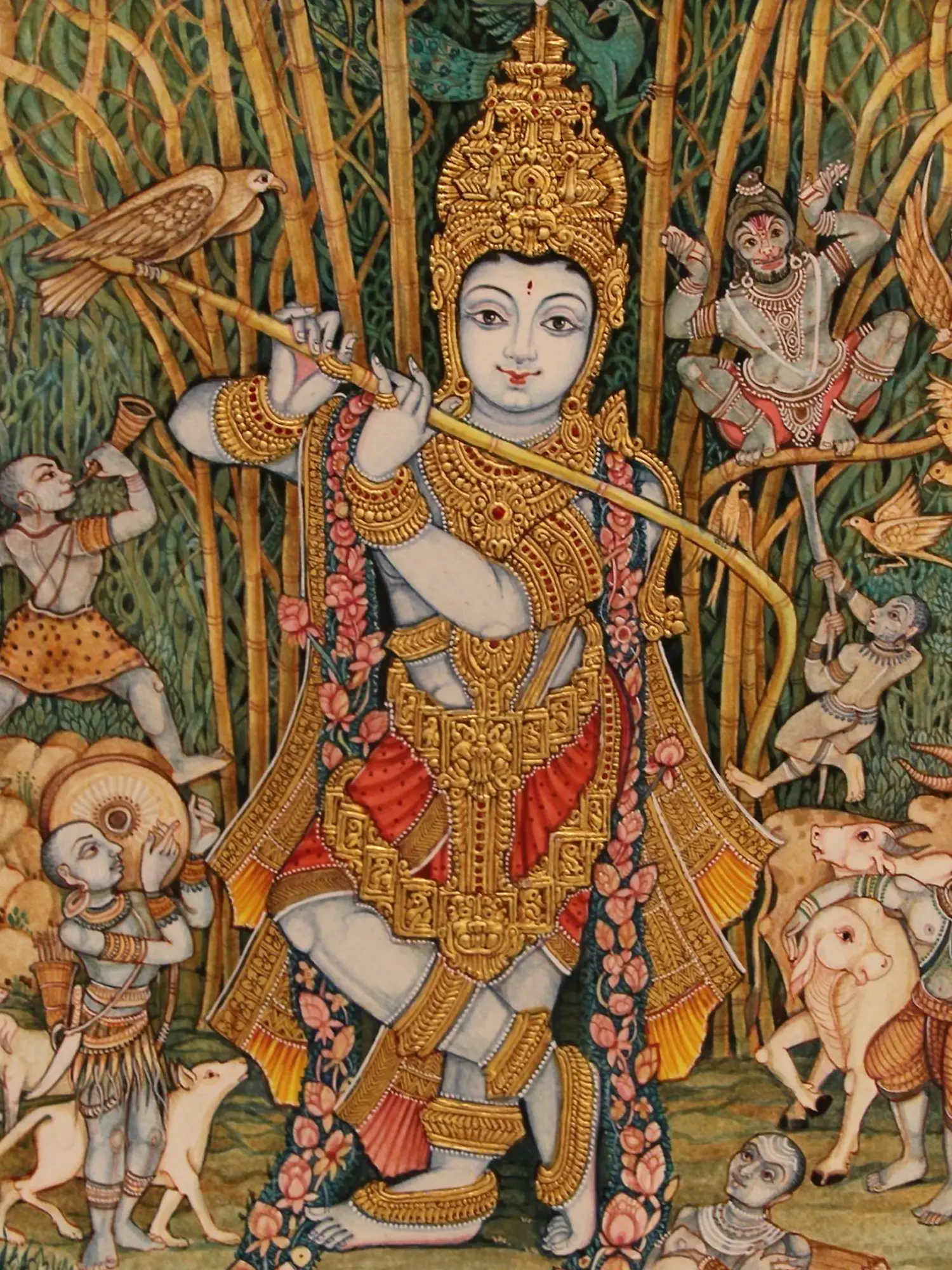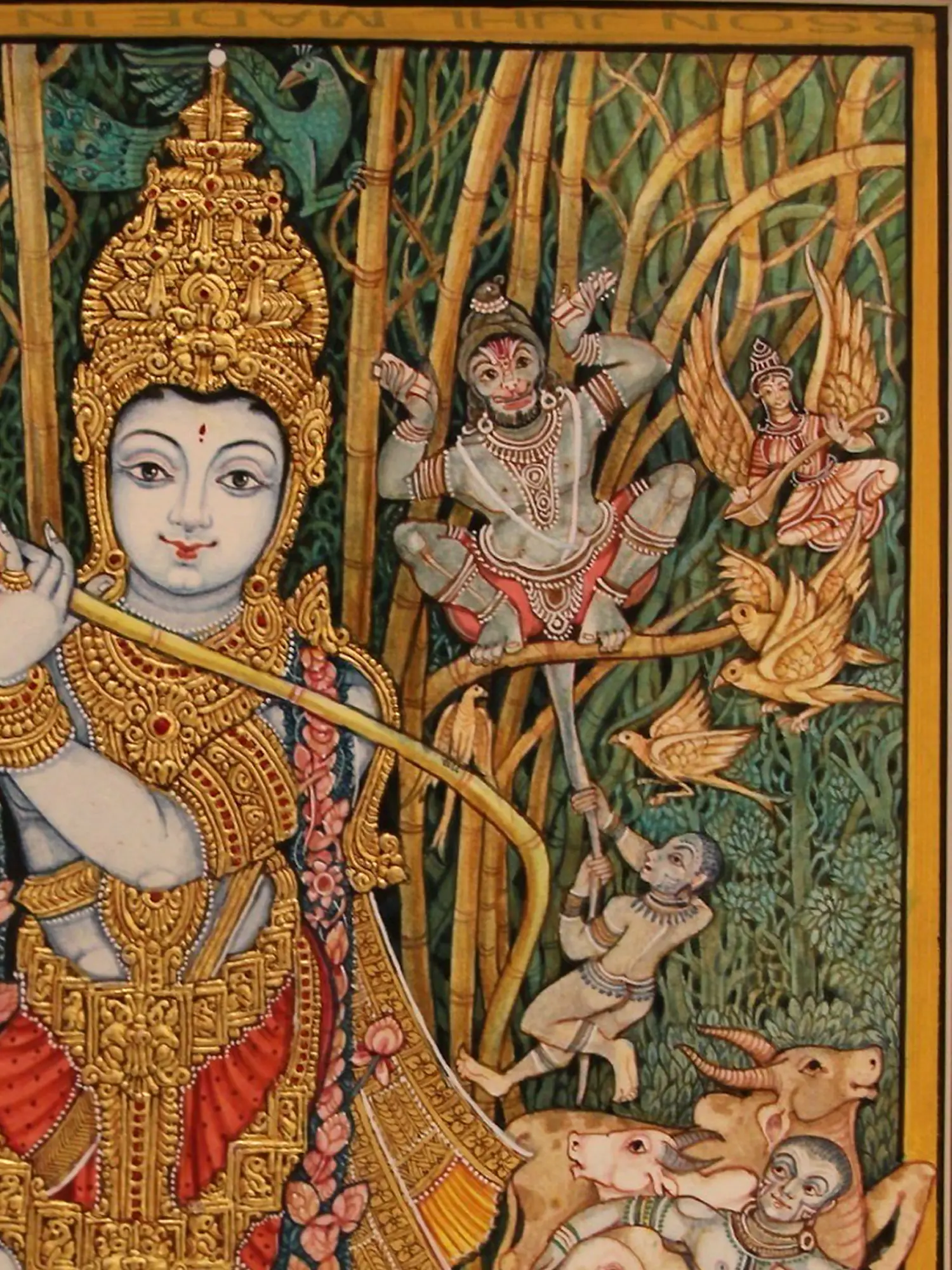 Witness the central figure, radiating grace as he plays his flute, adorned with intricate golden ornamentation that catches the light. Surrounding him, a vibrant tableau unfolds: figures tend to gentle cattle, birds alight on slender bamboo stalks, and celestial beings grace the upper canopy. The rich textures and the subtle interplay of colors create a visual narrative that unfolds with every glance, a detailed world contained within its impressive 23 by 20.5-inch form.