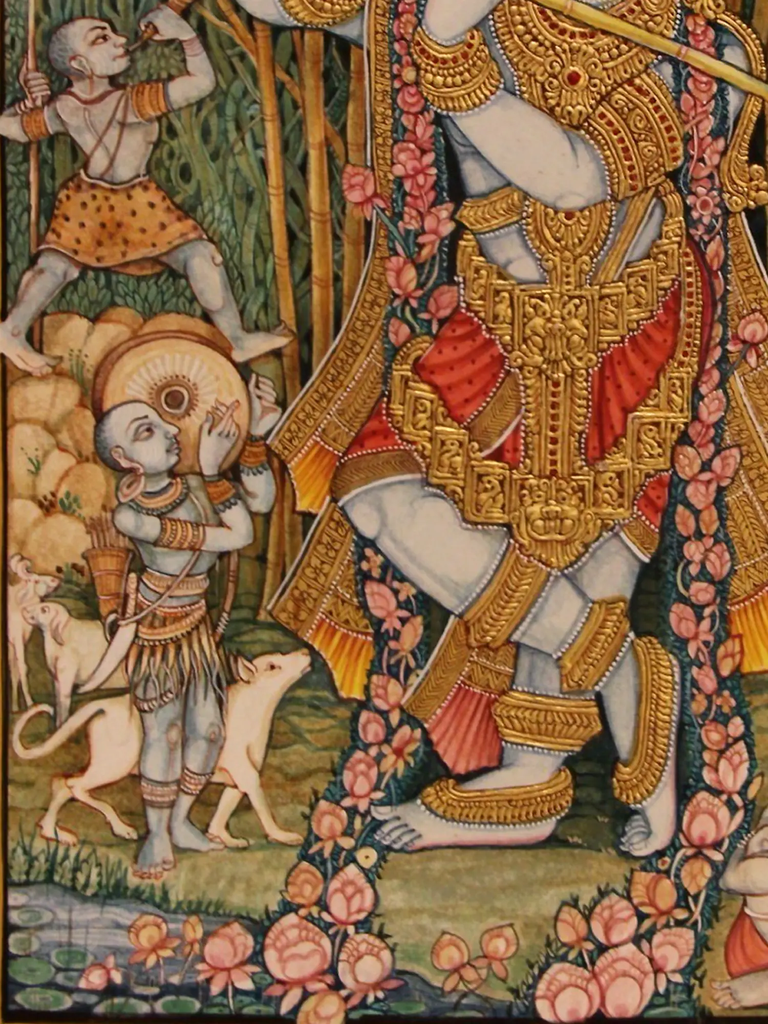 Originating from the esteemed Mysore painting tradition, this piece channels the spirit of devotion and aesthetic refinement that has characterized this art form for centuries. Mysore paintings are renowned for their vibrant color palettes, intricate ornamentation, and the delicate use of gold foil, all of which are masterfully employed here to capture a pivotal moment of divine interaction with the earthly realm.