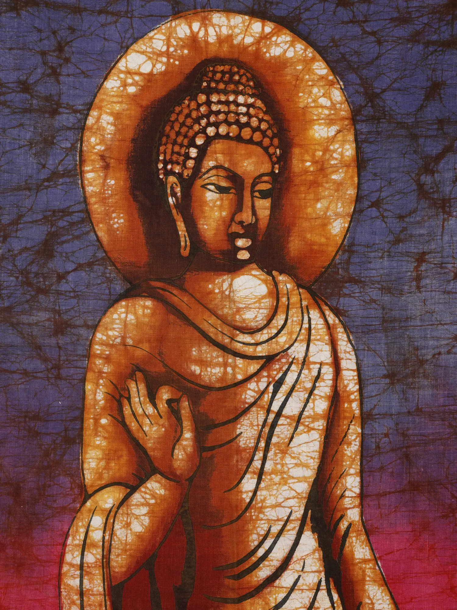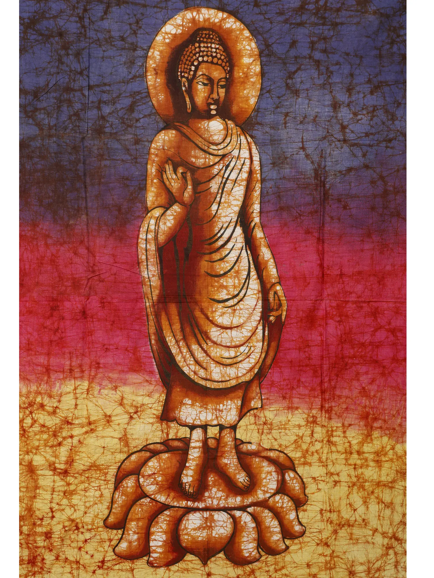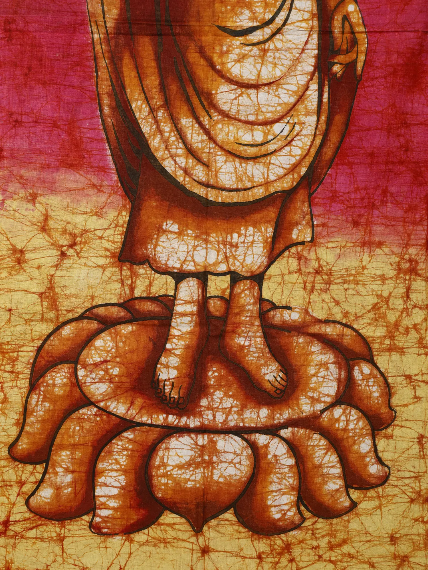 This Standing Buddha Batik Painting portrays Lord Buddha in a contemplative stance, featuring the vitarka mudra in his right hand. The smart use of the crackle technique in batik infuses drama into the artwork, creating a unique texture that adds depth and character. The Buddha stands gracefully on an inverted lotus, symbolizing purity and enlightenment.
