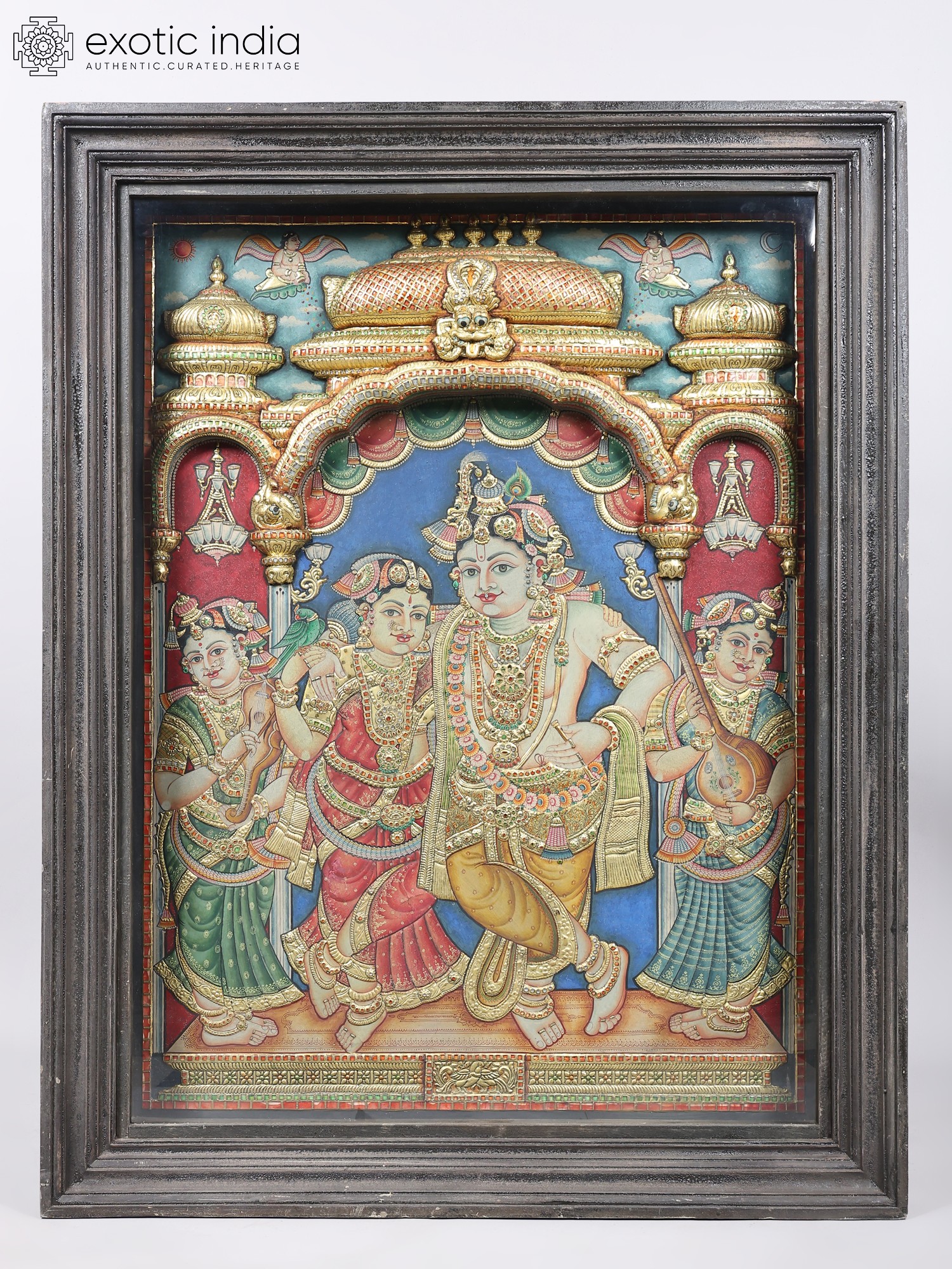 26" Lord Krishna With Rukmini And Satyabhama Painting with Frame | Traditional Colors with 24 Karat Gold
