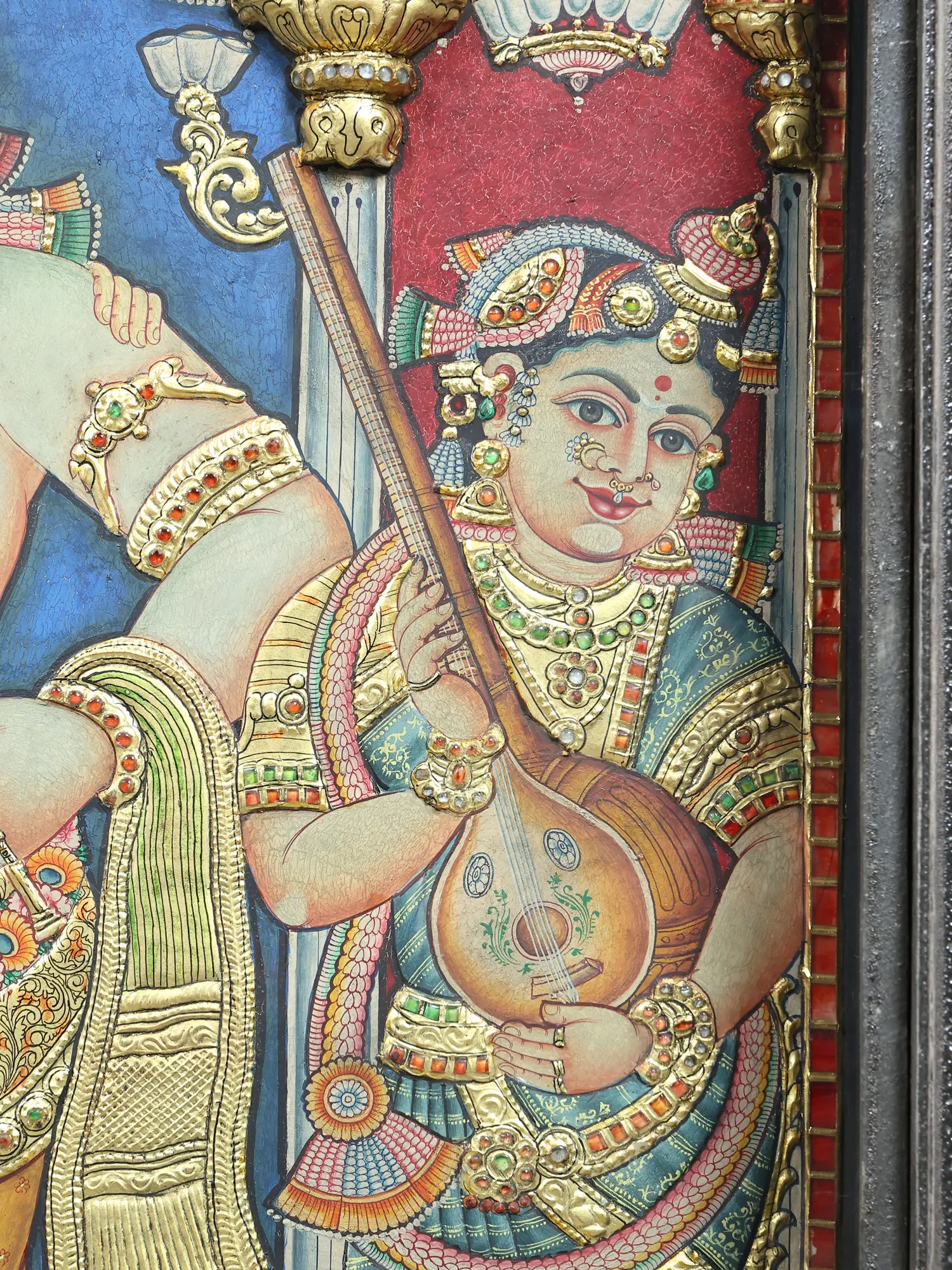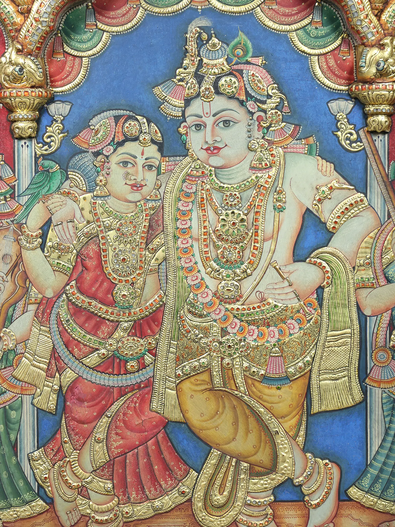 Huge Tanjore Mandapam of Lord Krishna with Rukmini and Satyabhama | 24 Karat Gold Work