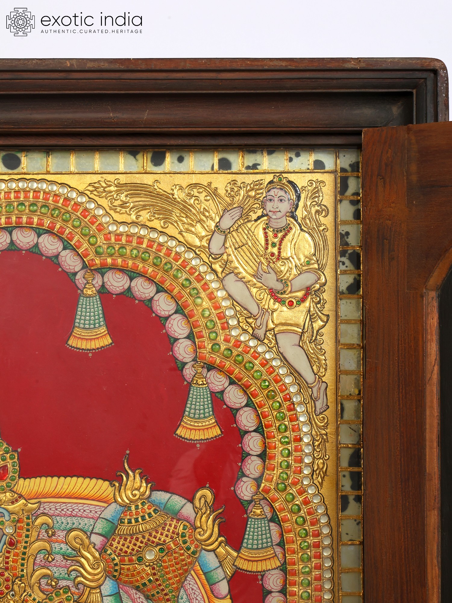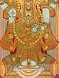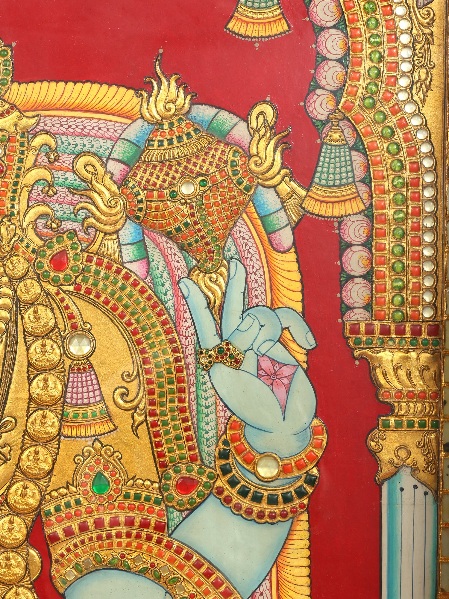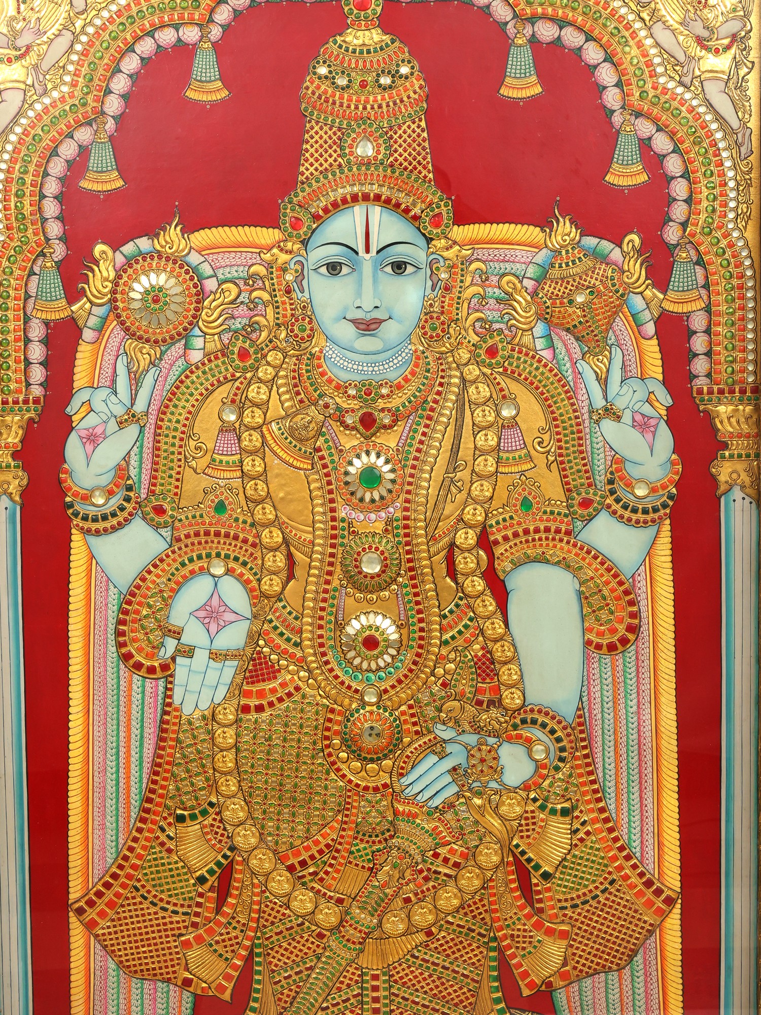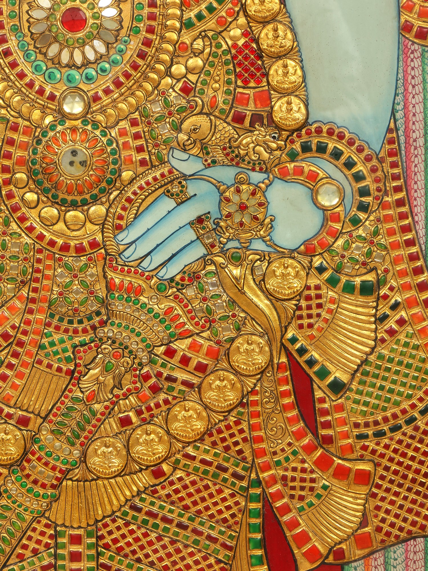 Behold a masterpiece of devotional art, a traditional Tanjore painting depicting Lord Vishnu in his magnificent standing form. This exquisite artwork is more than just a visual representation; it is a portal to the divine, a testament to the rich artistic heritage of Thanjavur. Lord Vishnu, the preserver and protector of the universe in Hindu mythology, is rendered with serene grace and unparalleled detail. His celestial blue complexion, adorned with intricate jewels and rich garments, speaks of his divine royalty and omnipresent power. Each stroke of the brush, imbued with the essence of devotion, brings to life the calm yet formidable presence of the Supreme Being.