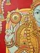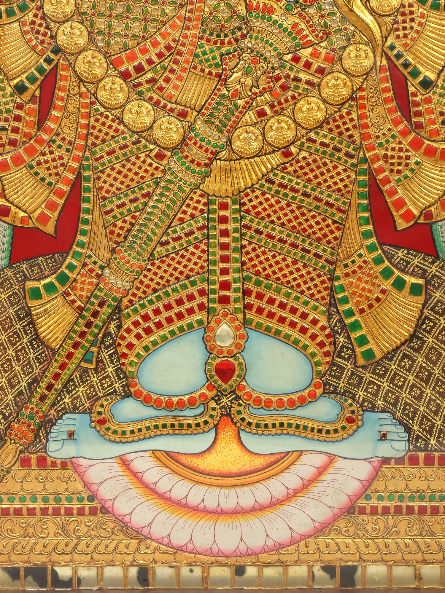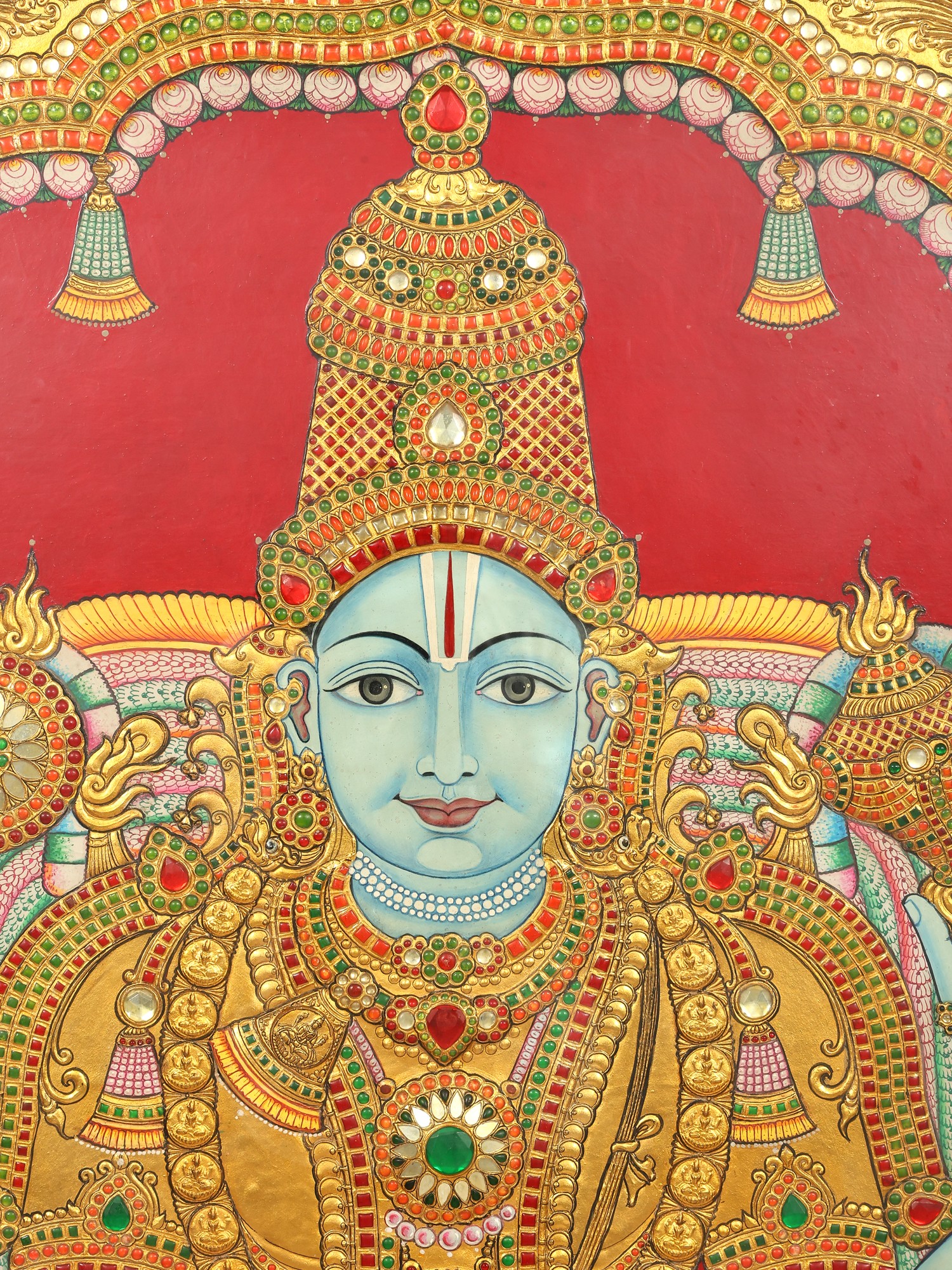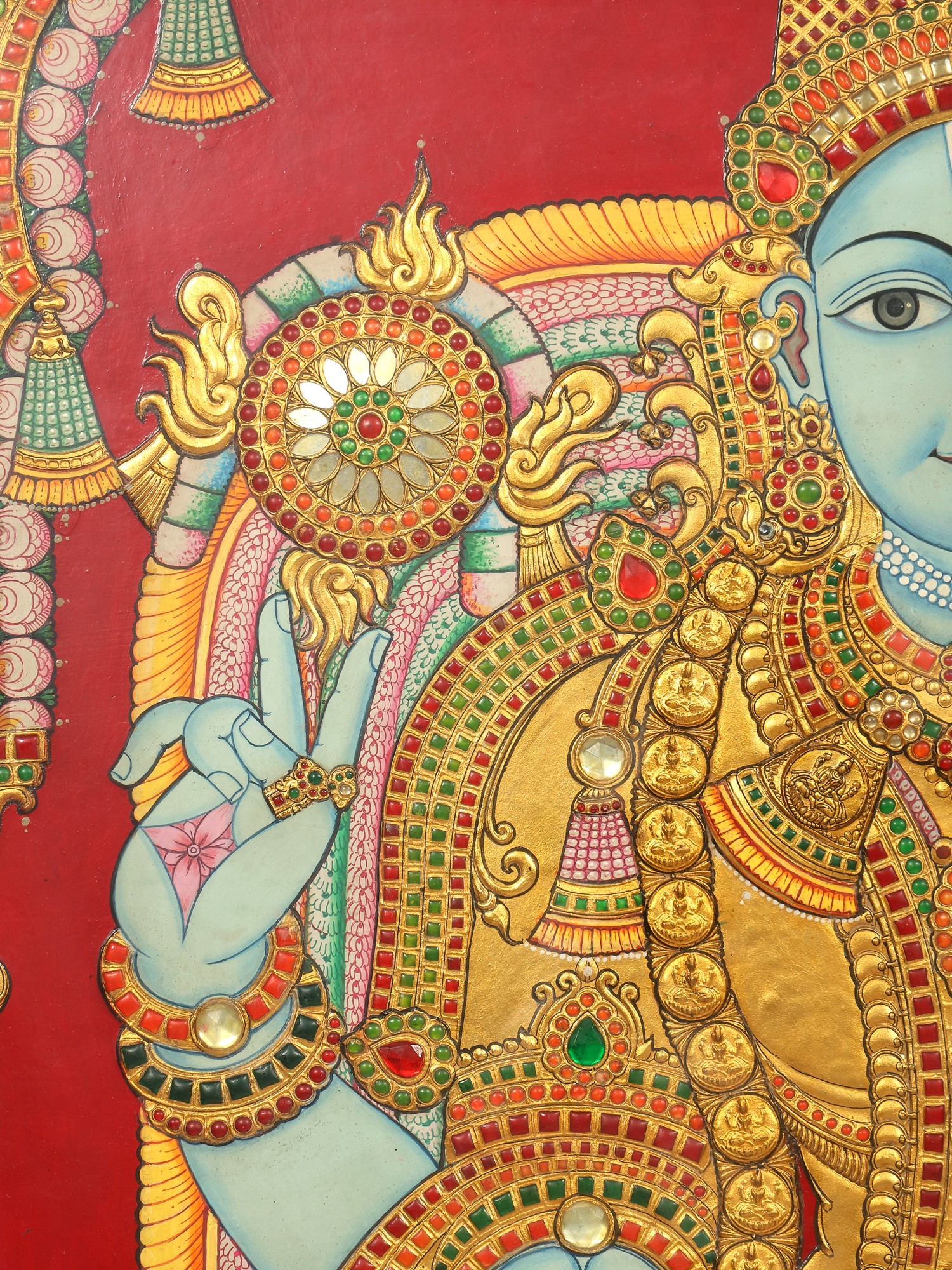 The hallmark of Tanjore paintings is their lavish use of gold. This depiction of Lord Vishnu is no exception, featuring extensive embellishments of 24-karat gold leaf. The shimmering gold captures and reflects light, imbuing the deity with a divine luminescence that is both awe-inspiring and deeply spiritual. The rich, traditional colors used throughout the painting – deep reds, vibrant greens, and warm yellows – create a harmonious and vibrant palette that draws the viewer into the sacred scene. These colors are not merely decorative; they are symbolic, representing various cosmic energies and divine attributes.