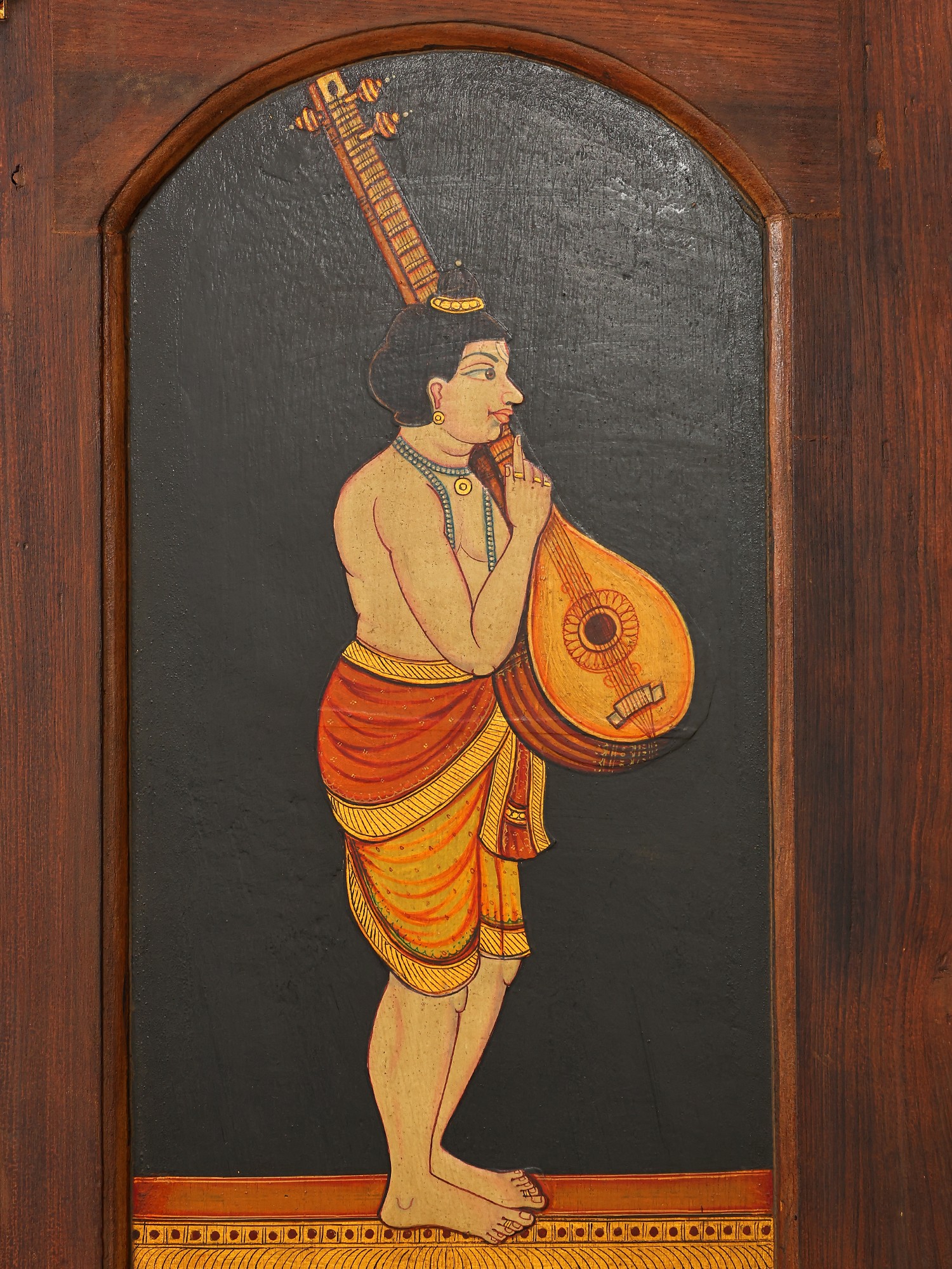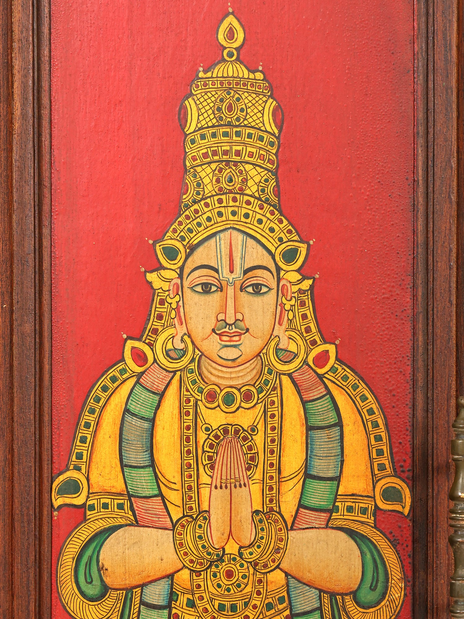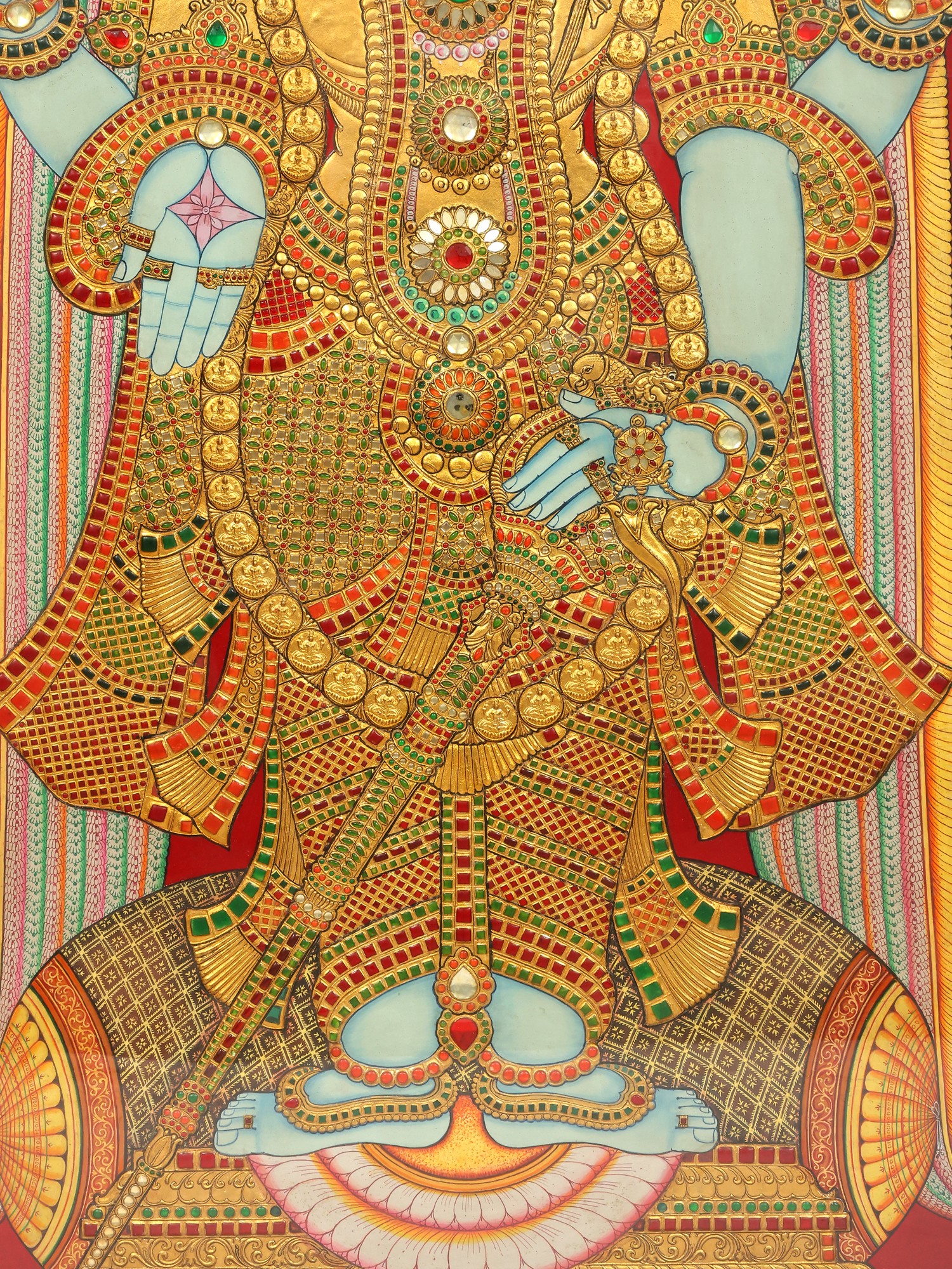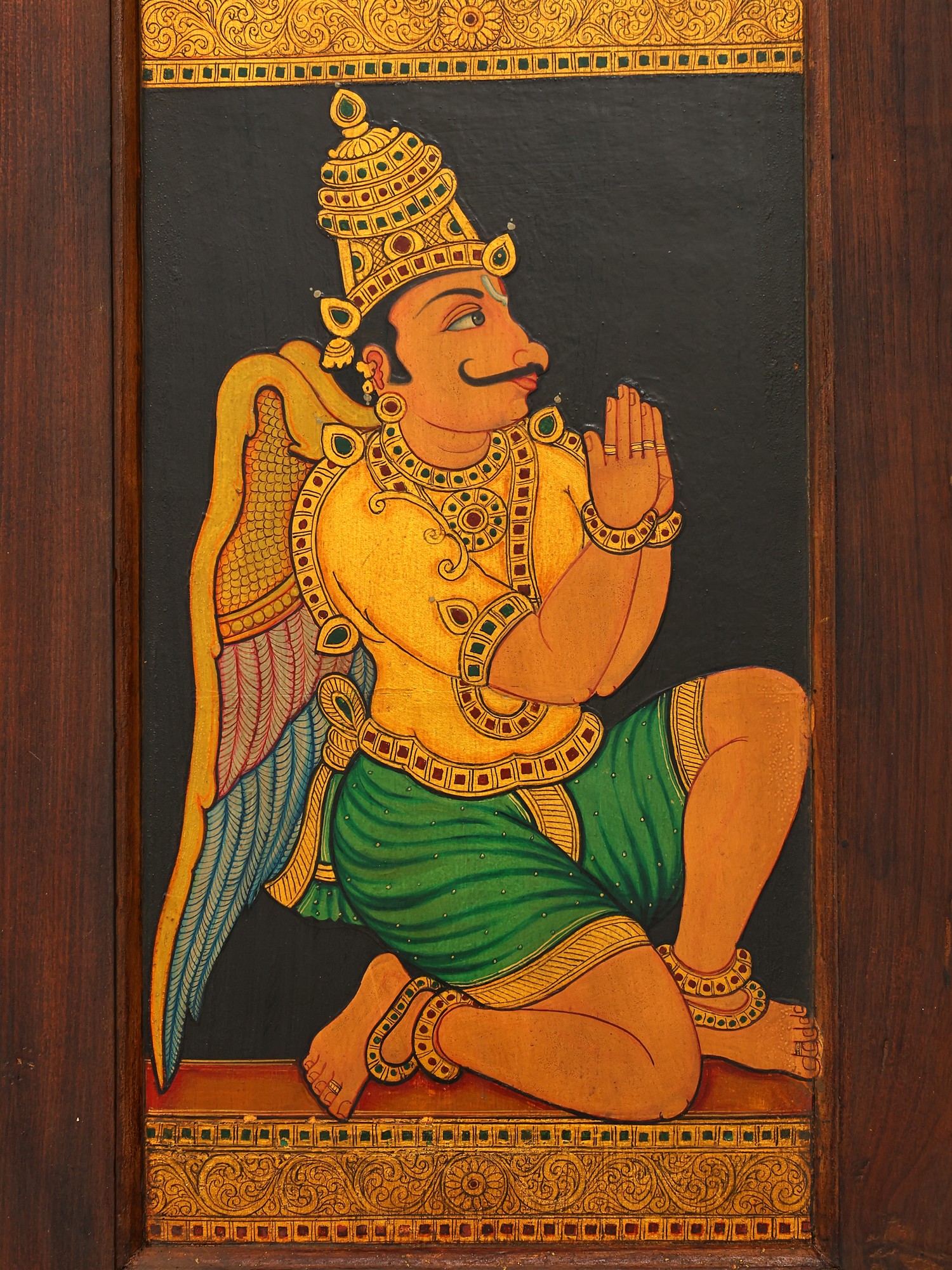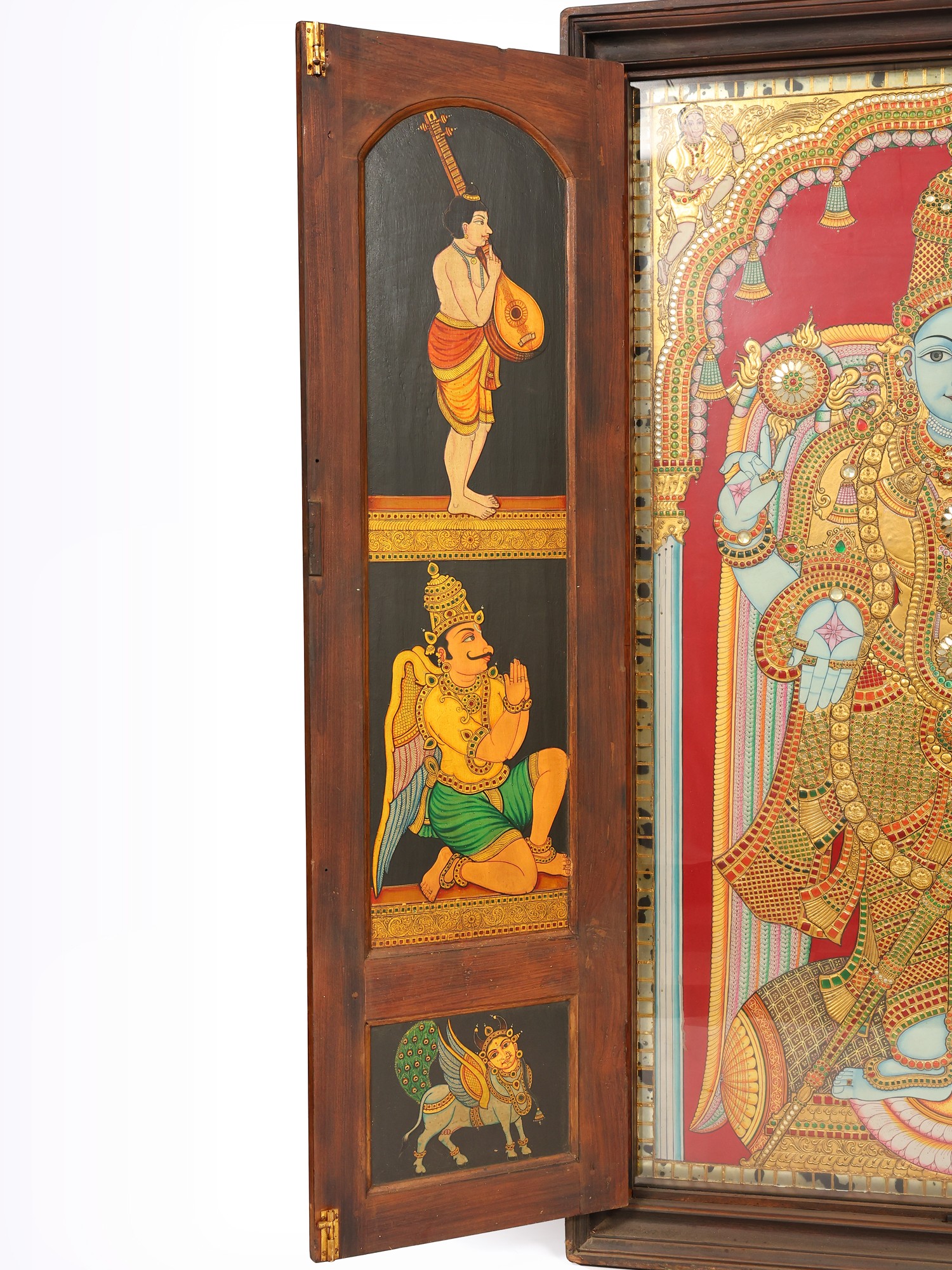 This painting is presented within a magnificent, ornate door frame, adding another layer of artistic brilliance and symbolic meaning. The doors themselves are works of art, each panel featuring meticulously painted figures that complement the central deity. On one side, a celestial musician plays a stringed instrument, perhaps offering a musical tribute to Vishnu. Opposite, the devoted figure of Hanuman, the loyal devotee and powerful warrior, kneels in prayer, a symbol of unwavering faith and service. Further down, a mythical winged creature, perhaps a Gandharva or a celestial attendant, and an elephant, a symbol of strength and royalty, are depicted, each adding to the narrative and sacred atmosphere of the ensemble. These guardians not only protect the central image but also offer a glimpse into the vibrant cosmic court surrounding Lord Vishnu. The entire presentation evokes the grandeur of a temple shrine, inviting contemplation and reverence.