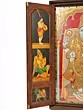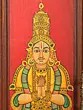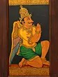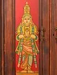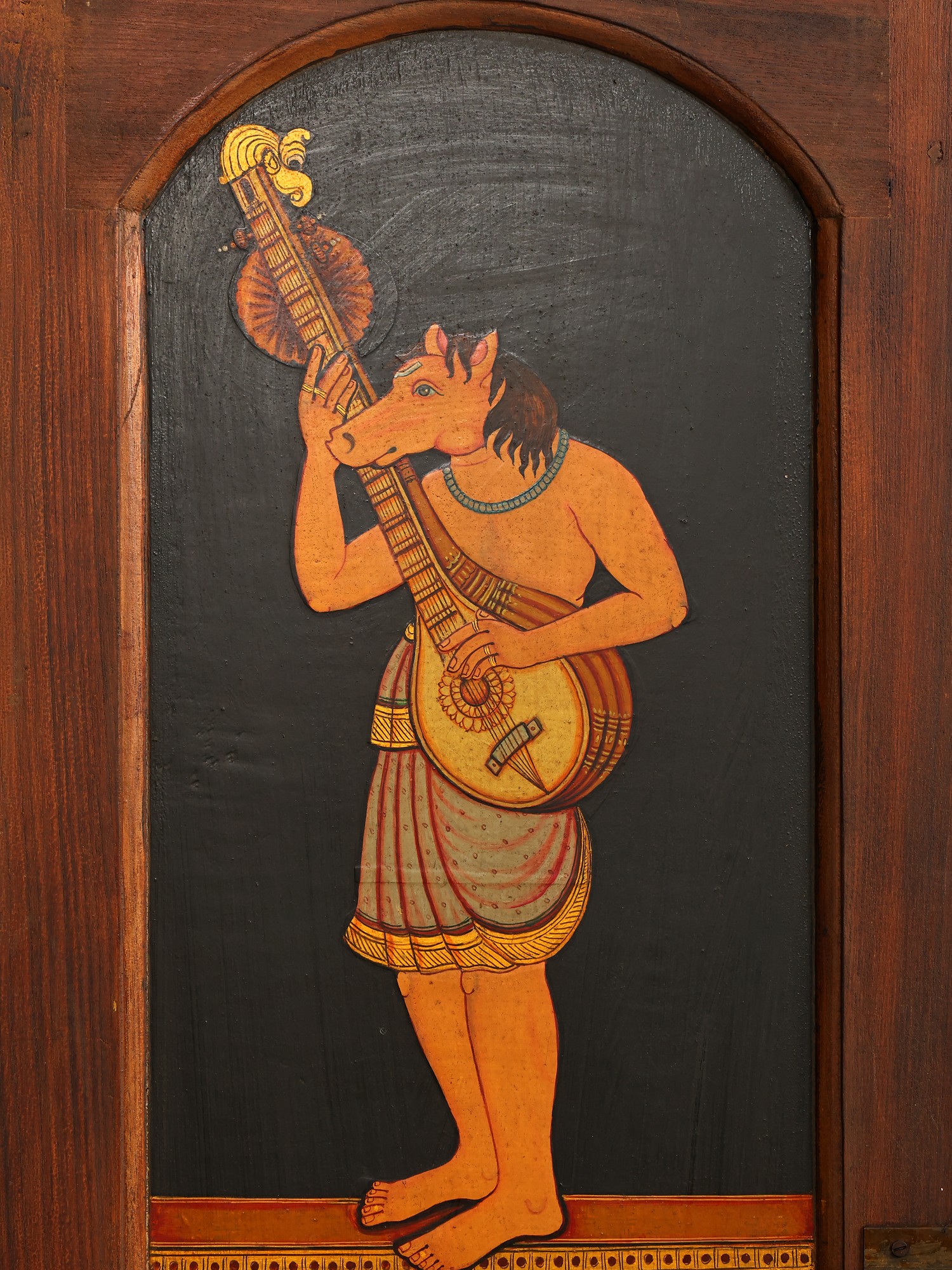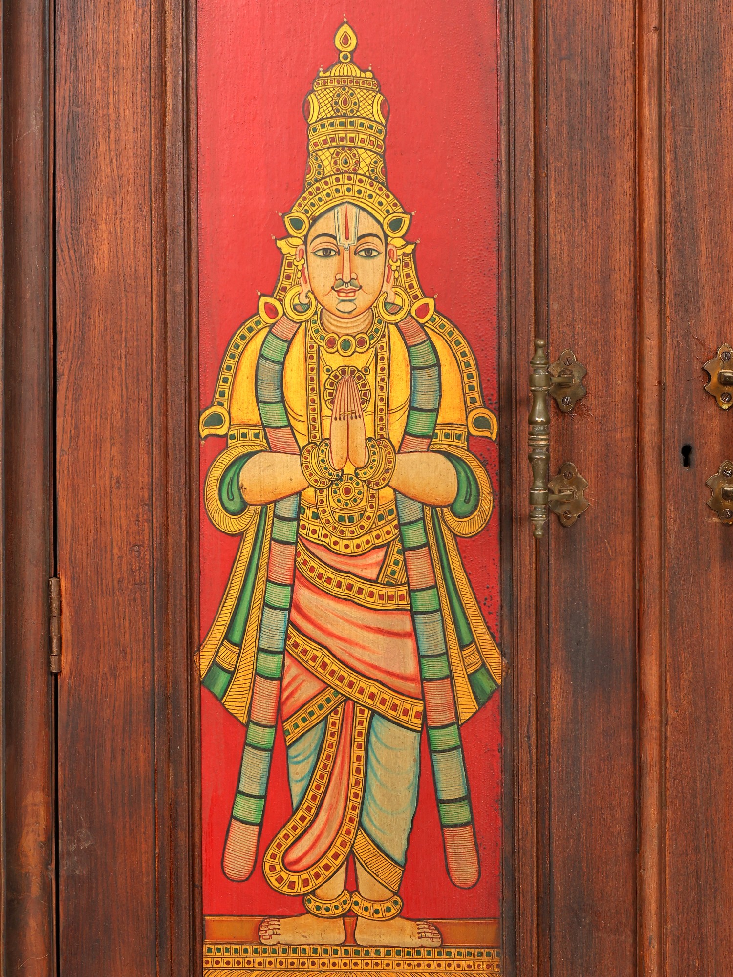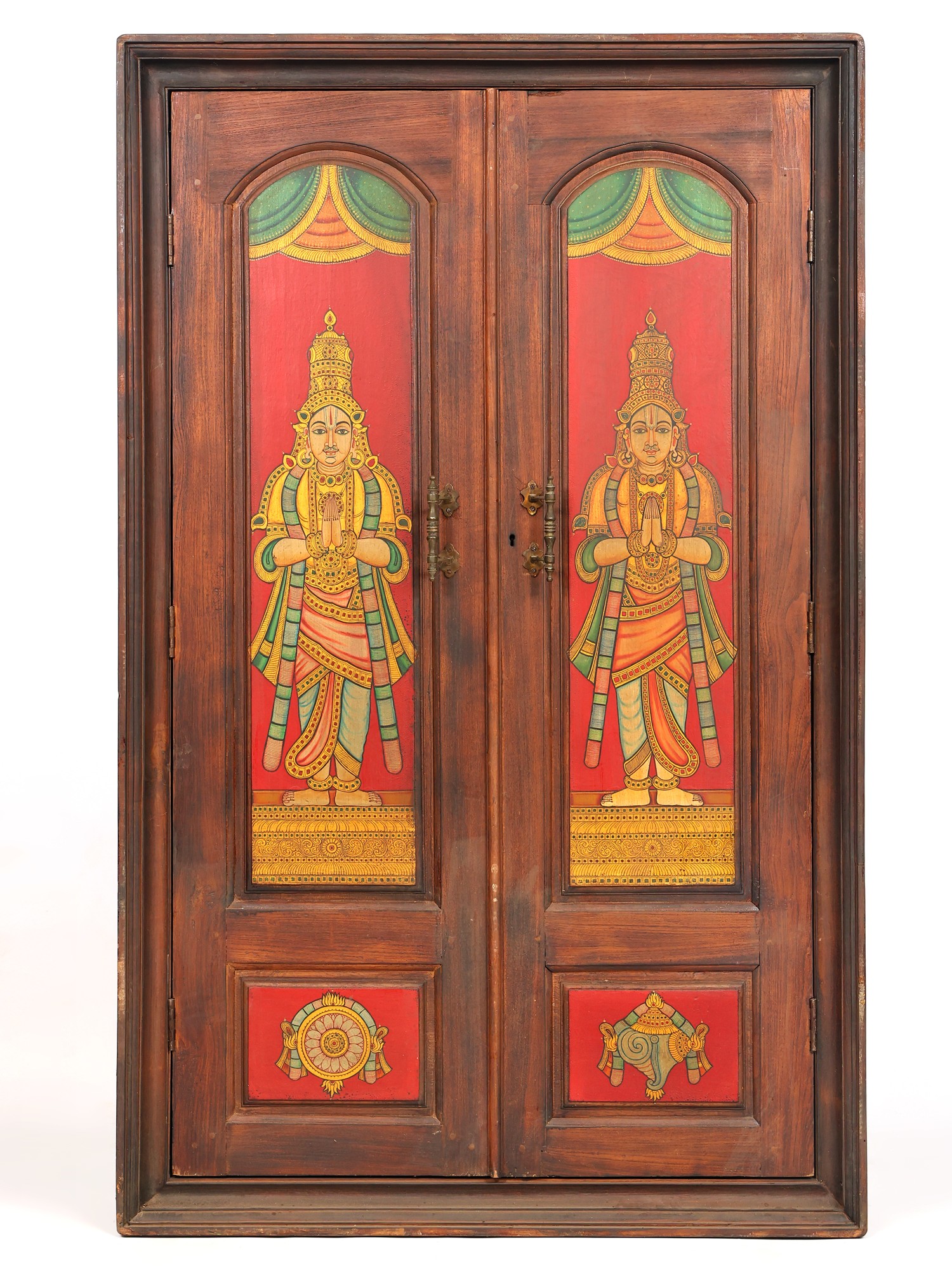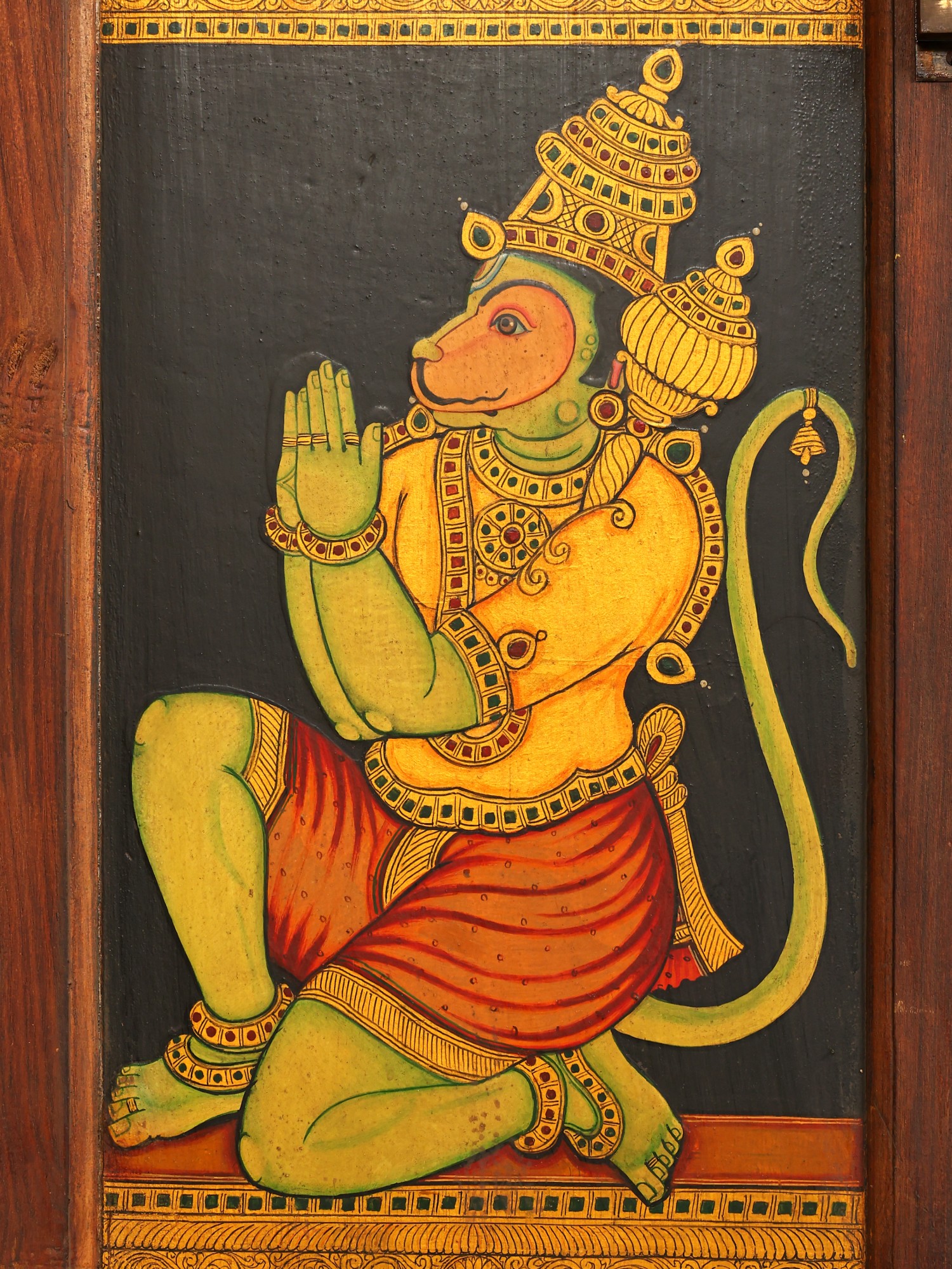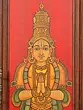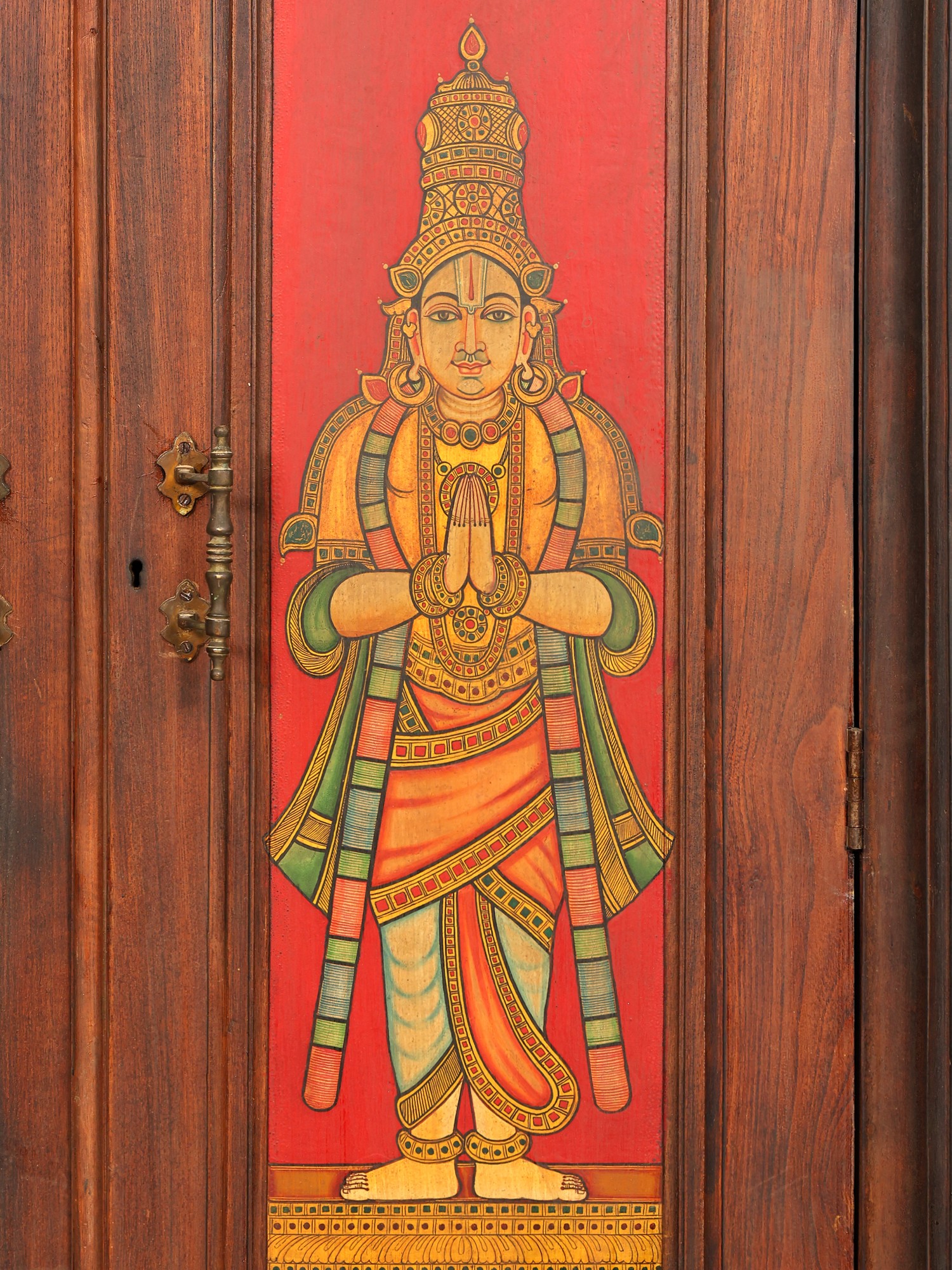 This painting is presented within a magnificent, ornate door frame, adding another layer of artistic brilliance and symbolic meaning. The doors themselves are works of art, each panel featuring meticulously painted figures that complement the central deity. On one side, a celestial musician plays a stringed instrument, perhaps offering a musical tribute to Vishnu. Opposite, the devoted figure of Hanuman, the loyal devotee and powerful warrior, kneels in prayer, a symbol of unwavering faith and service. Further down, a mythical winged creature, perhaps a Gandharva or a celestial attendant, and an elephant, a symbol of strength and royalty, are depicted, each adding to the narrative and sacred atmosphere of the ensemble. These guardians not only protect the central image but also offer a glimpse into the vibrant cosmic court surrounding Lord Vishnu. The entire presentation evokes the grandeur of a temple shrine, inviting contemplation and reverence.