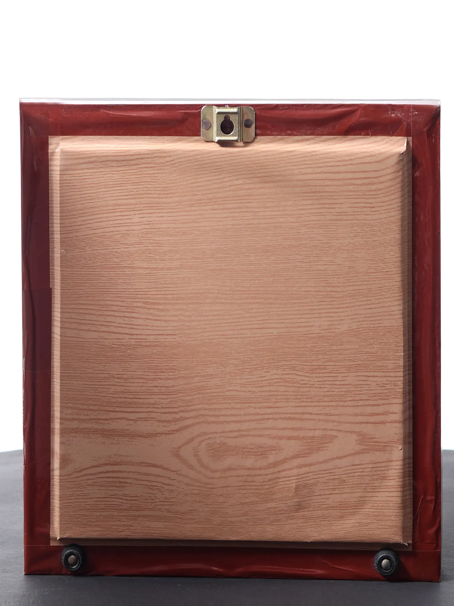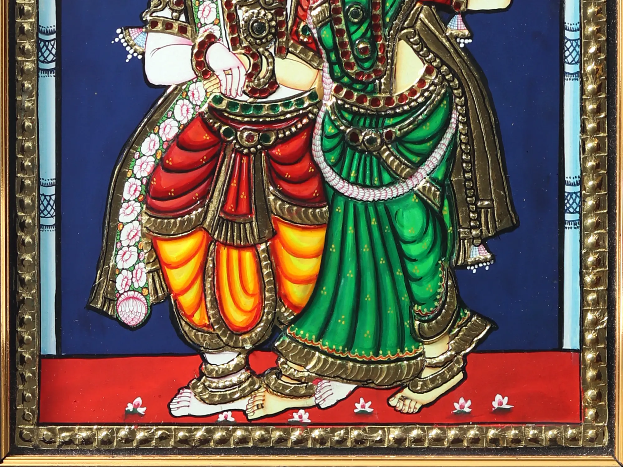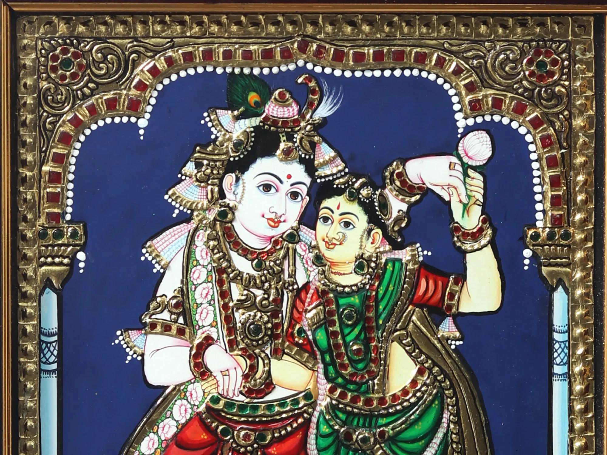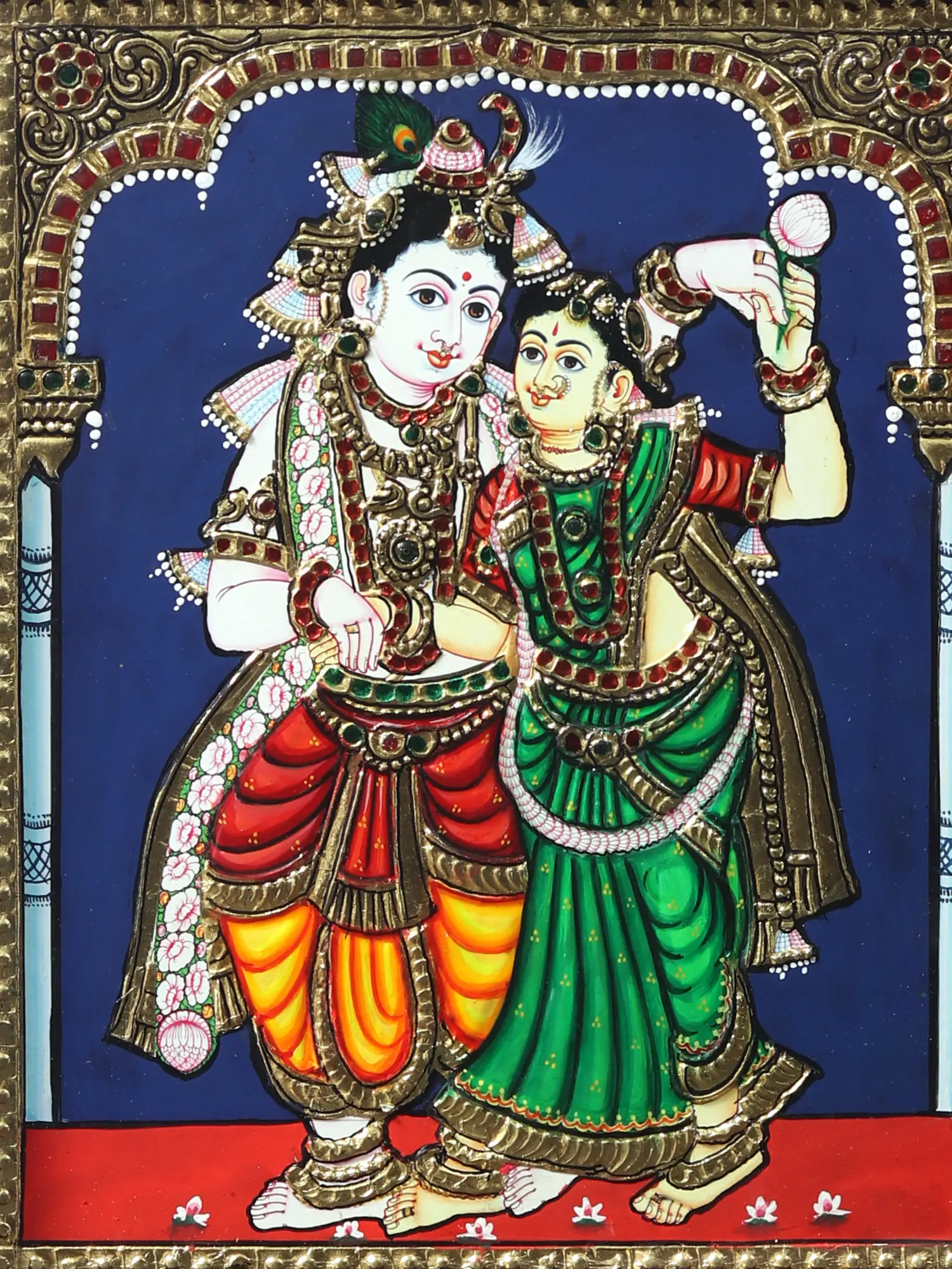Holding each other’s hands, in tribhanga stand Radha and Krishna. The style of attire and jewelry draws inspiration from Southern India, confirmed by the nose rings and side hair crowns of Tamil Nadu in this ravishing Tanjore mural with work of gold and semi-precious stones. At whose feet, the padmas are offered - Radha and Krishna are symbolic of transcendental eternity, as depicted and known!