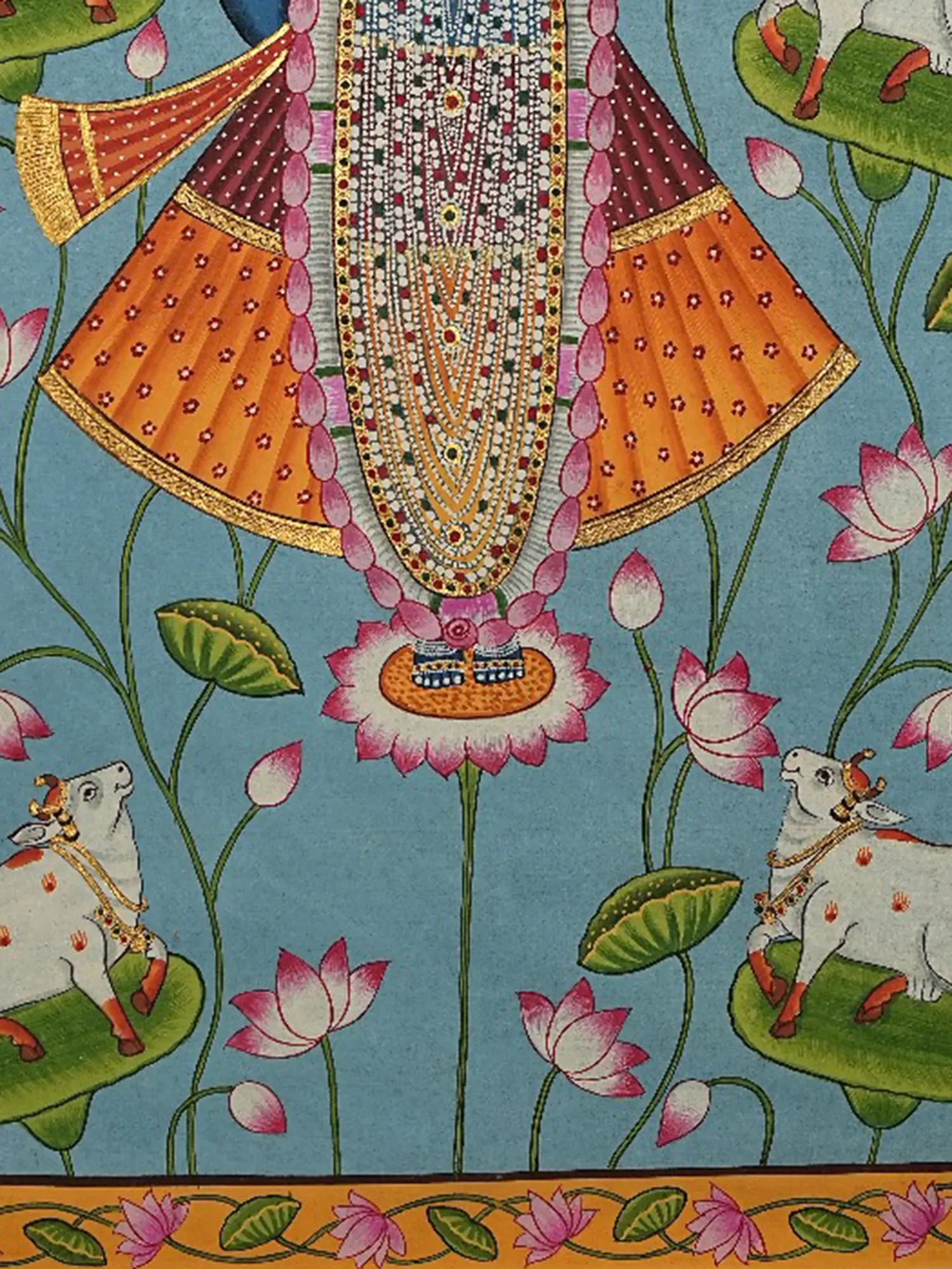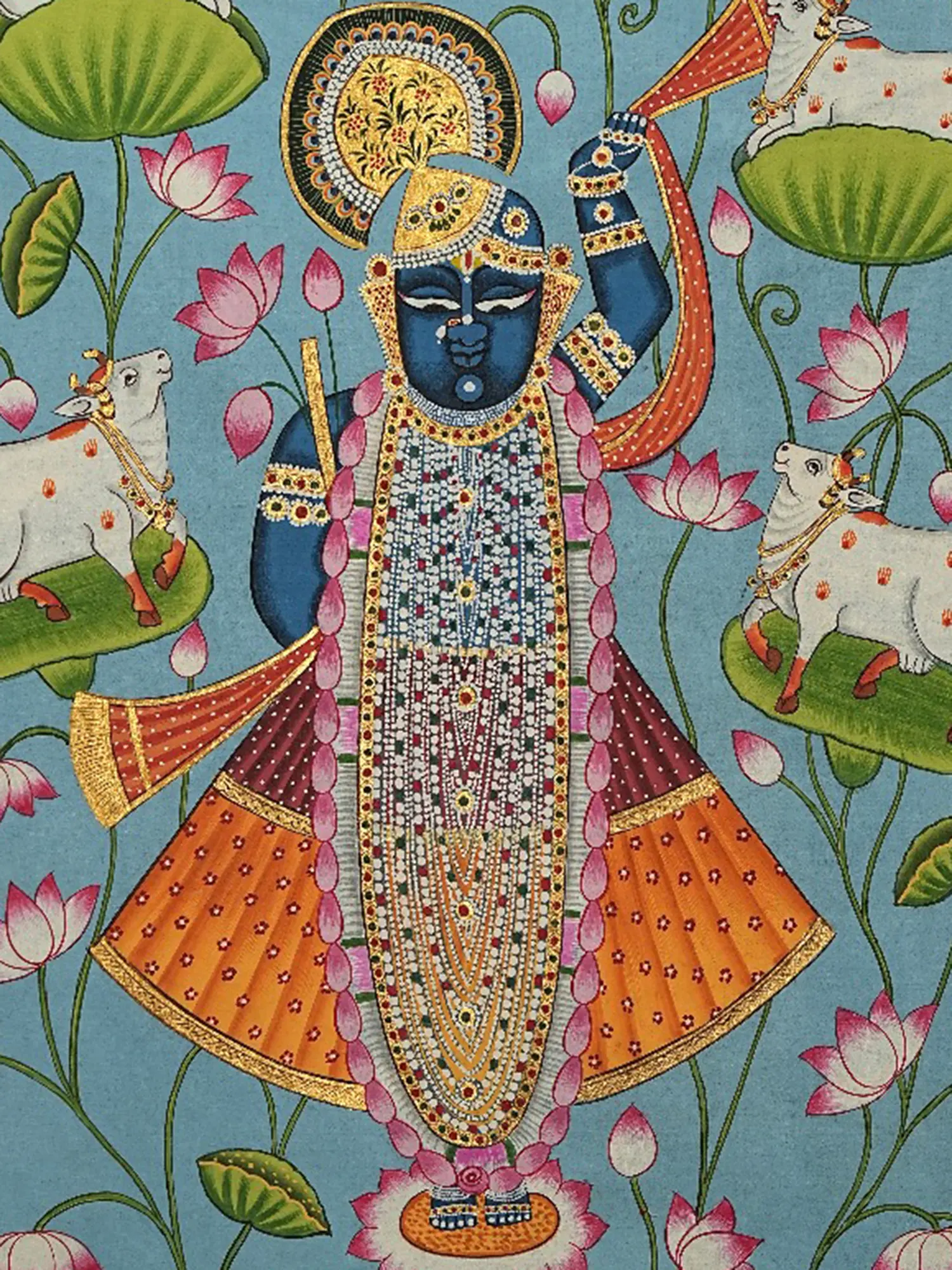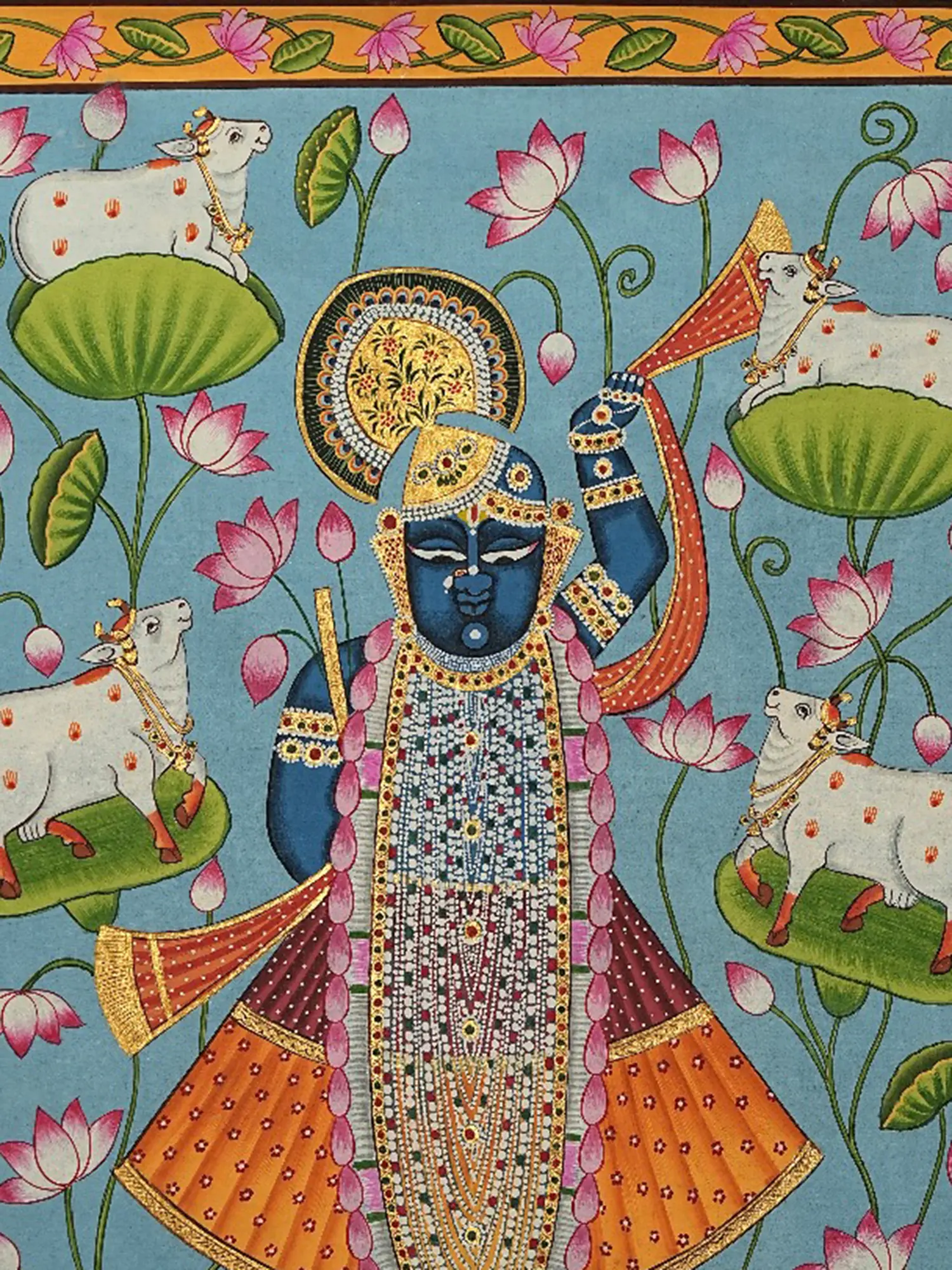 You'll appreciate the regal blue hue of the central deity, Shrinathji, symbolizing his divine nature and connection to the cosmic ocean. He stands gracefully upon a bed of blooming lotus petals, an emblem of purity and spiritual awakening, surrounded by auspicious cows, embodying abundance and nurturing grace. The ornate detailing of his celestial garments and the golden halo radiating from behind him speak to his divine glory. The composition is framed by a vibrant border adorned with lotus motifs and scrolling vines, each element carefully chosen to enhance the visual harmony and symbolic depth.
