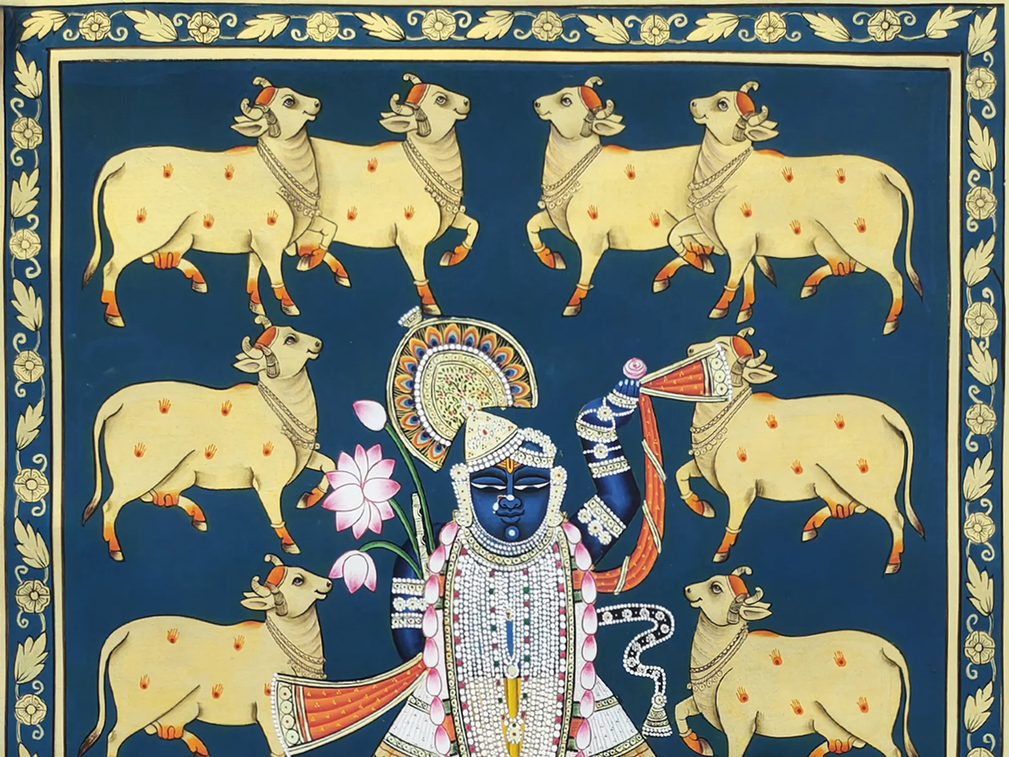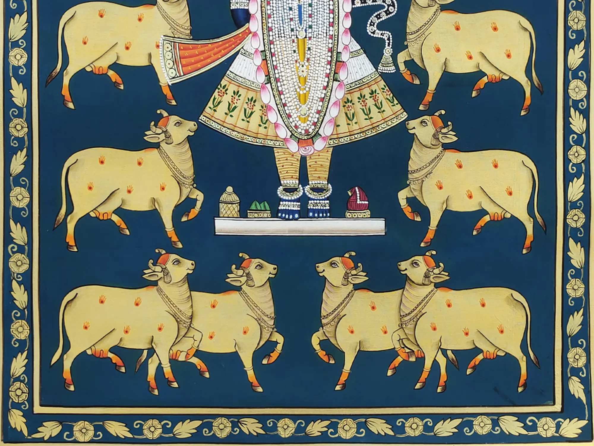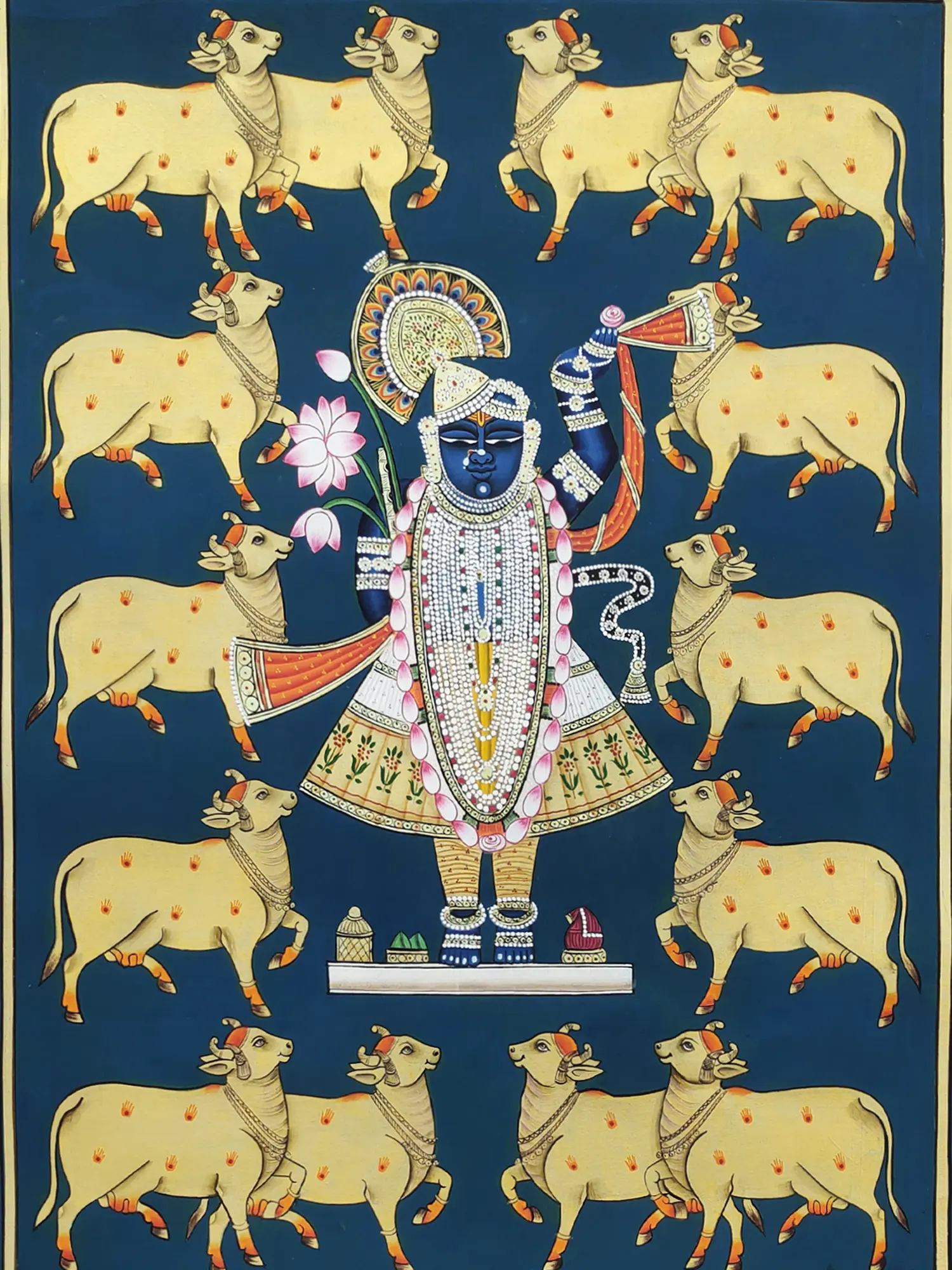 This portrayal draws inspiration from the rich devotional traditions of Vaishnavism, particularly the worship of Shrinathji, a manifestation of Lord Krishna. Shrinathji is revered as the divine child who protected the villagers of Braj from the wrath of the storm god Indra by lifting the Govardhan Hill. The cows, deeply intertwined with Krishna's life in Vrindavan, represent nourishment, purity, and the pastoral idyll of his divine play. This artwork captures the essence of this profound spiritual narrative.
