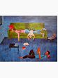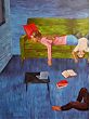 This vibrant acrylic on canvas painting, "Stay Casual," by Nishtha Jain, captures a quintessential moment of family relaxation. The scene, rendered with bold strokes and a playful color palette, portrays a family finding solace in the simplicity of their home. A mother and child are sprawled across a green sofa, their bodies relaxed and content, mirroring the ease and comfort of their surroundings. The father, meanwhile, lies on the floor, engrossed in a book, adding a layer of peaceful solitude to the composition. The casual arrangement of the figures suggests a comfortable and informal atmosphere, emphasizing the beauty of shared moments in family life. The artist's ability to convey such a relatable scene through dynamic brushstrokes and a rich color palette makes this piece a captivating addition to any contemporary home.