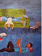 The image subtly evokes mythological and cultural narratives surrounding rest and rejuvenation. In many cultures, the act of reclining signifies relaxation, repose and even divine connection. Recall the imagery of reclining deities in ancient Greek and Roman art, symbols of power and tranquility. Even in Hindu mythology, deities are often depicted in postures of relaxation as an embodiment of the divine state of being. The painting's quiet depiction of rest is an ode to the universality of these themes across diverse cultural backgrounds. The seemingly effortless postures of the family members echo the idyllic scenes depicted in ancient pastoral art, where individuals find peace in the simplicity of nature and family. The choice of a relaxing color palette only strengthens the painting's message of inner peace and contentedness.