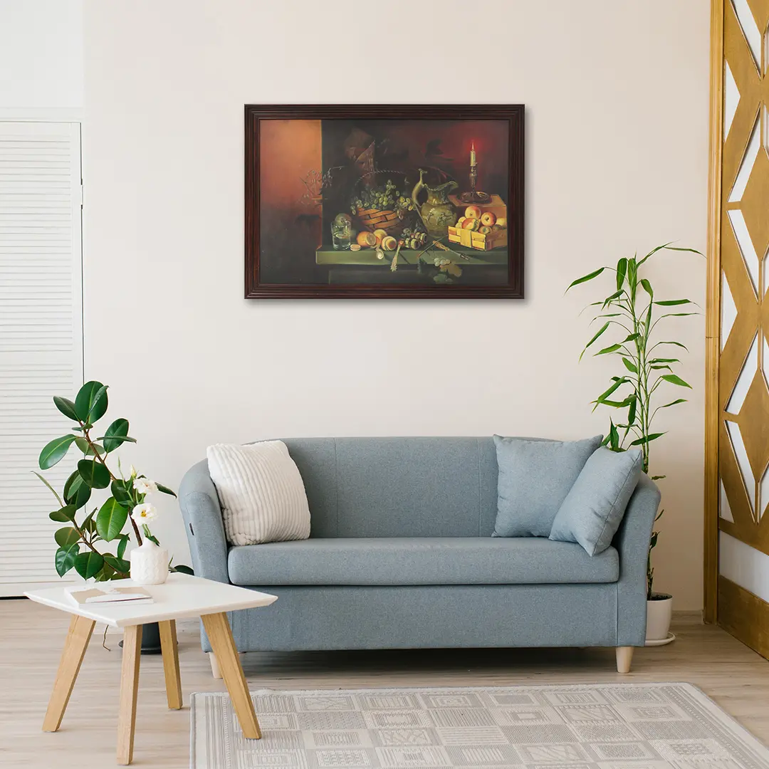 A still life painting can be defined simply as a painting of lifeless items, and in some respects, it is basic. Unlike legendary paintings, still life is rooted in the real world and is frequently described with captivating illusionism. The term "still life" comes from the Dutch word "stilleven," which gained popularity in the 16th century. While the still life genre rose to prominence during this period, its origins can be traced back to prehistoric times. This mysterious view of an unkept table gently lit by the dim light of a candle titled Still Life is a framed oil painting and is also a traditional still life painting.