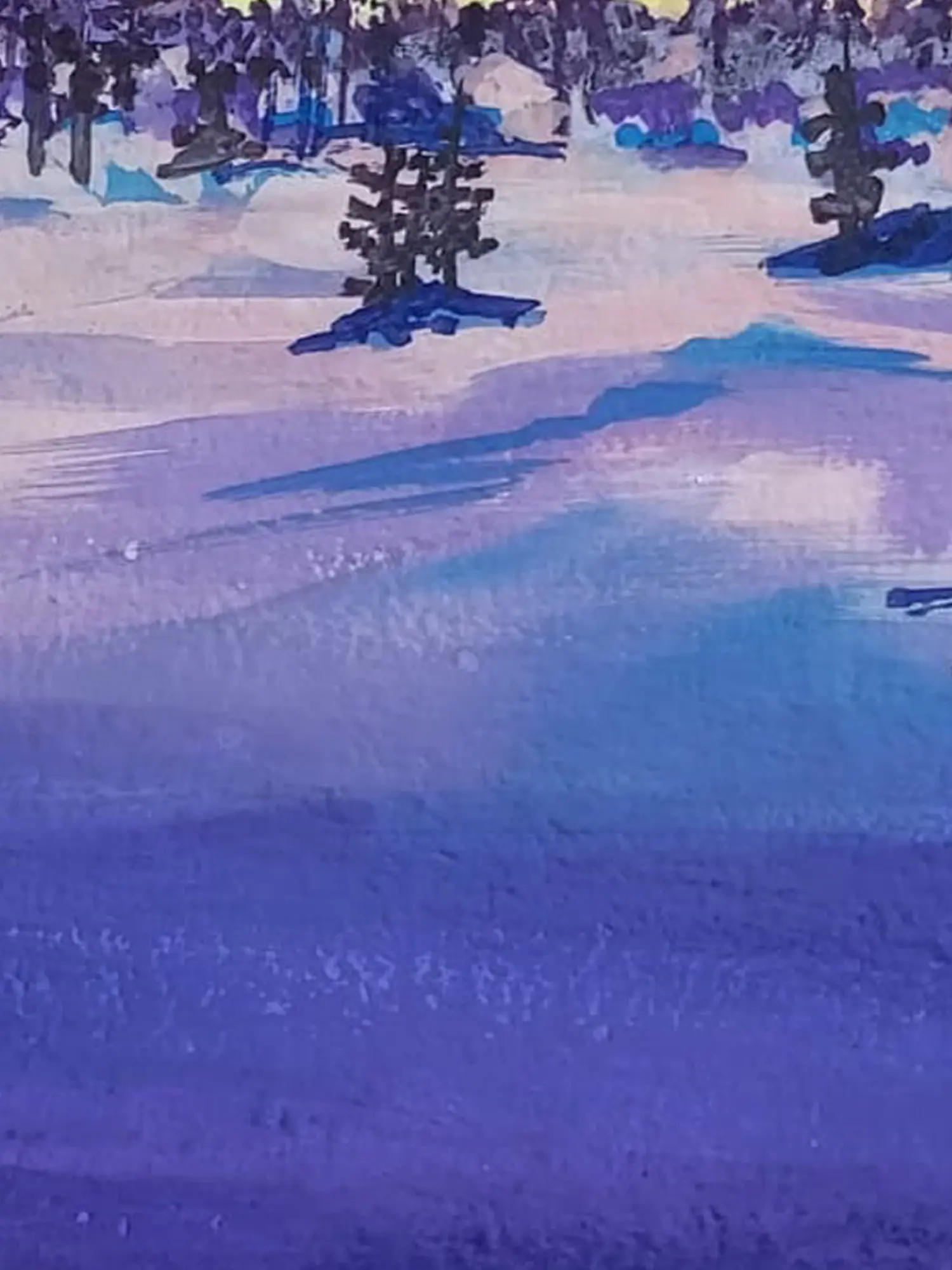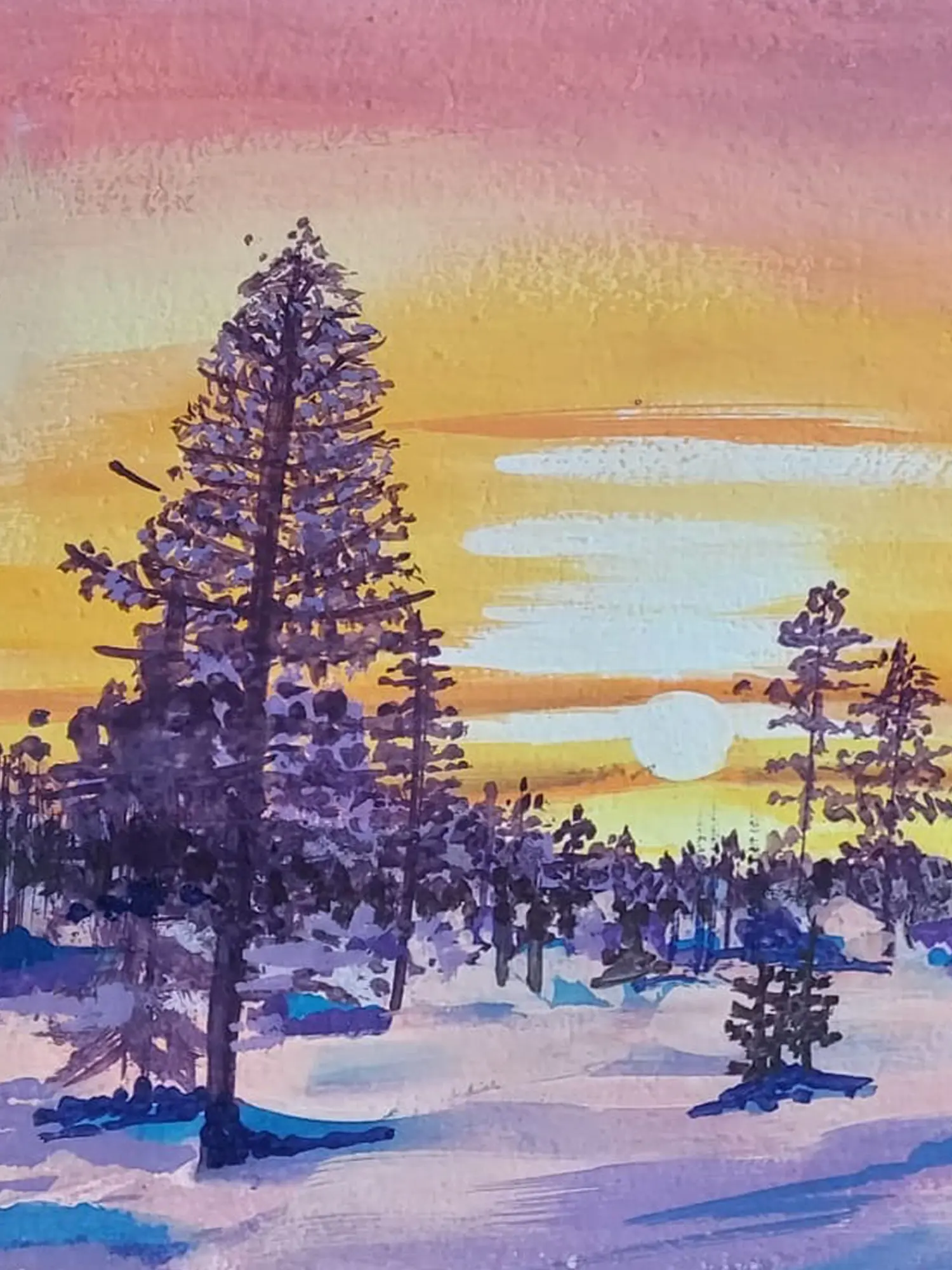 Aditi Junnare's poster color on watercolor paper painting unveils a captivating dreamscape, that artists strive to portray or wish to experience. This mesmerizing snow-clad landscape is a symphony of purple and orange tones, capturing the sun's reflection on crystalline snow. Trees, almost snow-laden but gracefully standing, contribute to a scene straight from the realms of fantasy.